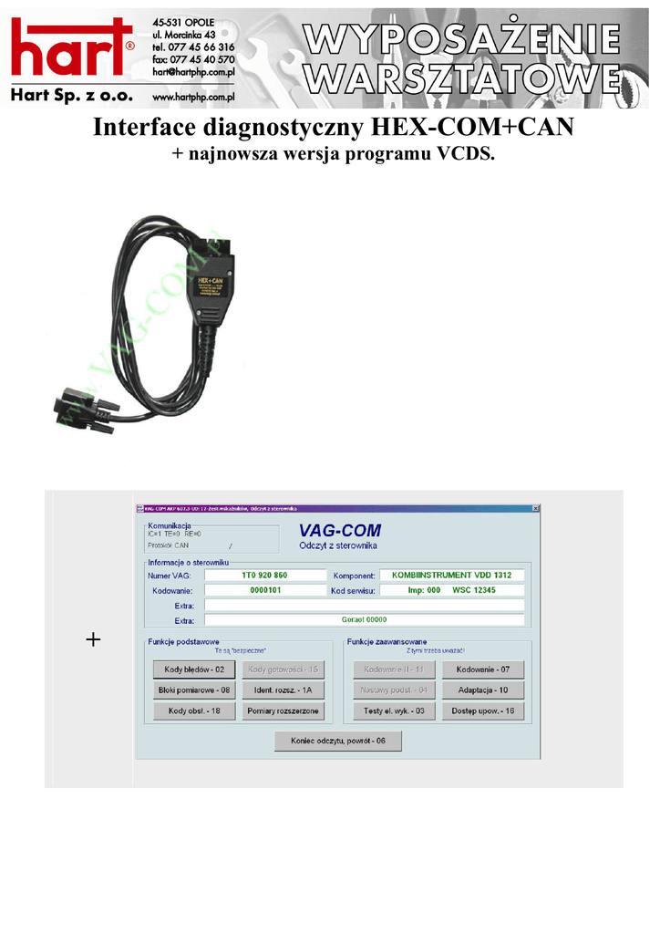 Interface diagnostyczny HEX-COM+CAN + najnowsza wersja programu VCDS. + Jest to najnowszy i jednocześnie najbardziej zaawansowany technicznie interface jaki w tej chwili oferujemy. W połączeniu z oprogramowaniem VCDS (dawniej pod nazwą VAG-COM), dorównuje (a w niektórych przypadkach nawet przewyższa!) możliwości testerów diagnostycznych używanych w autoryzowanych serwisach (np. VAS5052). Interface HEX-COM+CAN wraz z programem VCDS pozwala na komputerową diagnostykę pojazdów VW, AUDI, SEAT, SKODA, produkowanych w latach 1990-2009. W związku ze znaczną liczbą obsługiwanych pojazdów i systemów, poniŜej prezentujemy JEDYNIE KILKA PRZYKŁADOWYCH zastosowań naszego sprzętu. Wymieniliśmy tu "nowe" lub najnowsze pojazdy produkowane od roku 2003 aŜ do dziś. Oto wybrane przykłady: 1K - VW Golf V, Jetta i Bora (łącznie z modelami w wersjach GTI i GLI) 2004+ 3C - VW Passat 2006+ 3D - VW Phaeton 2003+ 5N - VW Tiguan 2007+ 7L - VW Touareg 2003+ 13 - VW Scirocco 2008+ 8P - Audi A3/S3 2004+ 4F - Audi A6/S6/RS6/allroad 2005+ 4E - Audi A8/S8 2003+ 4L - Audi Q7 2006+ 8T - Audi A5/S5 2007+ 8K - Audi A4/S4 2008+ 8R - Audi Q5 2008+ 5P - Seat Altea 2005+ 1P - Seat Leon 2006+ 5P - Seat Toledo 2005+ 6L - Seat Ibiza / Cordoba 2002+ 5J - Skoda Fabia 2007+ 1Z - Skoda Octavia II 2005+ 5J - Skoda Roomster 2006+ 3U - Skoda Superb 2002-2008 3T - Skoda Superb 2008+ Interface HEX-COM+CAN oferujemy wraz z licencją na użytkowanie programu VCDS, dlatego każdy, kto zakupi nasz produkt, automatycznie staje się LEGALNYM posiadaczem ORYGINALNEGO i W PEŁNI FUNKCJONALNEGO oprogramowania VCDS. Nie ma możliwości zakupu samego interface'u HEX-COM+CAN (bez licencji) lub samego oprogramowania VCDS (bez interface'u*). Długość kabla interface'u wynosi ok. 180 cm. Przy założeniu, że korzystamy z komputera przenośnego, długość ta powinna być w zupełności wystarczająca. Gdyby jednak uznali Państwo, że przewód interface'u jest za krótki, to do zwiększenia zasięgu można z powodzeniem wykorzystać standardowy kabel przedłużający RS232 9PIN M/F (męski/żeński), dostępny w większości dobrze zaopatrzonych sklepów komputerowych. Główne zalety interface'u HEX-COM+CAN: - Idealny do pracy ze starszymi i przystępnymi cenowo laptopami posiadającymi port COM - Duża, dwukolorowa dioda sygnalizująca stan połączenia - Automatyczne aktualizacje oprogramowania sprzętowego - Obsługa najnowszych pojazdów z CAN - W pełni kompatybilny ze starszymi pojazdami, w których wykorzystywane są pojedyncza linia K jak również K i L. - Bezproblemowa komunikacja z "trudnymi" systemami, np. sterowniki silnika w następujących pojazdach: Audi 1Z TDi (1991-1994) oraz Audi 2.6 L (1993-1994) - sterownik Hella. - Elektroniczne zabezpieczenie linii K/K1 i L/K2 przed zwarciem do masy lub do +12. - Pełna obsługa dwóch linii K obowiązkowa dla Audi A4 nadwozie B6/8E i Audi A6 2002+ (nie ma konieczności stosowania dodatkowego przyłącza VAS-6017). - Gwarancja: 12 miesięcy Co jest potrzebne aby korzystać z oferowanego przez nas sprzętu? Potrzebny jest przede wszystkim komputer. Może to być laptop lub komputer stacjonarny – w jednym i w drugim przypadku – minimum procesor z zegarem 100 MHz oraz przynajmniej jeden wolny port COM. Interface HEXCOM+CAN działa z każdym Windows'em - od 98 w górę. Mimo to, do bezproblemowej pracy programu VCDS, zalecamy system WINDOWS XP lub VISTA. Oprogramowanie: Interface HEX-COM+CAN współpracuje z najnowszą wersją oprogramowania VCDS. Wszystkie interface’y sprzedawane przez firmę ADAKO, dostarczane są z pełną i legalną wersją programu VCDS. Naszym klientom przysługuje również prawo do BEZPŁATNYCH** aktualizacji oprogramowania przez Internet. Oferowane przez nas oprogramowanie VCDS działa TYLKO z oryginalnymi interface'ami pochodzącymi z www.vag-com.pl (www.vcds.pl) - zabezpieczenie w formie klucza sprzętowego. Interface'y pochodzące z innych źródeł (również kupione u innych dystrybutorów za granicą) nie działają z polskim oprogramowaniem VCDS. Więcej informacji na http://www.vag-com.pl/badz-legalny.htm