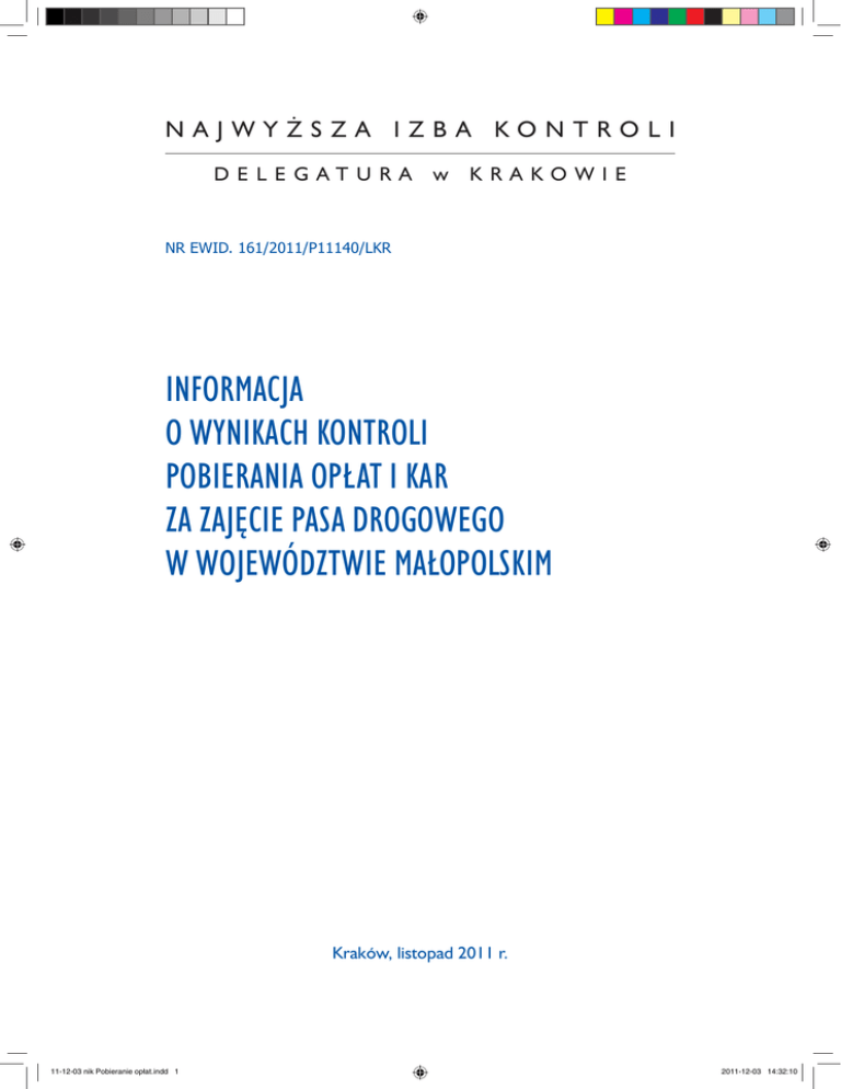 NAJWYŻSZA IZBA KONTROLI DELEGATURA w KRAKOWIE NR EWID. 161/2011/P11140/LKR INFORMACJA O WYNIKACH KONTROLI POBIERANIA OPŁAT I KAR ZA ZAJĘCIE PASA DROGOWEGO W WOJEWÓDZTWIE MAŁOPOLSKIM Kraków, listopad 2011 r. 11-12-03 nik Pobieranie opłat.indd 1 2011-12-03 14:32:10 Misj¹ Najwy¿szej Izby Kontroli jest dba³oœæ o gospodarnoœæ i skutecznoœæ w s³u¿bie publicznej dla Rzeczypospolitej Polskiej Wizj¹ Najwy¿szej Izby Kontroli jest ciesz¹cy siê powszechnym autorytetem najwy¿szy organ kontroli pañstwowej, którego raporty bêd¹ oczekiwanym i poszukiwanym Ÿród³em informacji dla organów w³adzy i spo³eczeñstwa Informacja o wynikach kontroli pobierania op³at i kar za zajêcie pasa drogowego w województwie ma³opolskim Dyrektor Delegatury NIK w Krakowie: Jolanta Stawska Akceptujê: Wojciech Misi¹g Wiceprezes Najwy¿szej Izby Kontroli Zatwierdzam: Jacek Jezierski Prezes Najwy¿szej Izby Kontroli dnia: listopada 2011 r. Najwy¿sza Izba Kontroli ul. Filtrowa 57 02-056 Warszawa tel./fax: (22) 444-50-00 www.nik.gov.pl 11-12-03 nik Pobieranie opłat.indd 2 2011-12-03 14:32:10 SPIS TREŚCI 1. ZAŁOŻENIA KONTROLI . . . . . . . . . . . . . . . . . . . . . . . . . . . . . . . . . . . . . . . . . . . . . . . . . . . . . . . . . . . . . . 5 1.1. Cel główny kontroli . . . . . . . . . . . . . . . . . . . . . . . . . . . . . . . . . . . . . . . . . . . . . . . . . . . . . . . . . . . . . . . 5 1.2. Cele szczegółowe . . . . . . . . . . . . . . . . . . . . . . . . . . . . . . . . . . . . . . . . . . . . . . . . . . . . . . . . . . . . . . . . 5 1.3. Podstawa prawna, kryteria . . . . . . . . . . . . . . . . . . . . . . . . . . . . . . . . . . . . . . . . . . . . . . . . . . . . . . . . . . 5 1.4. Zakres przedmiotowy kontroli . . . . . . . . . . . . . . . . . . . . . . . . . . . . . . . . . . . . . . . . . . . . . . . . . . . . . . 5 1.5. Zakres podmiotowy kontroli . . . . . . . . . . . . . . . . . . . . . . . . . . . . . . . . . . . . . . . . . . . . . . . . . . . . . . . . 5 2. PODSUMOWANIE WYNIKÓW KONTROLI . . . . . . . . . . . . . . . . . . . . . . . . . . . . . . . . . . . . . . . . . . . . . . 7 2.1. Ocena ogólna . . . . . . . . . . . . . . . . . . . . . . . . . . . . . . . . . . . . . . . . . . . . . . . . . . . . . . . . . . . . . . . . . . . . 9 2.2. Uwagi końcowe i wnioski . . . . . . . . . . . . . . . . . . . . . . . . . . . . . . . . . . . . . . . . . . . . . . . . . . . . . . . . . 10 3. INFORMACJE SZCZEGÓŁOWE . . . . . . . . . . . . . . . . . . . . . . . . . . . . . . . . . . . . . . . . . . . . . . . . . . . . . . . 11 3.1 Uwarunkowania ogólne i prawne . . . . . . . . . . . . . . . . . . . . . . . . . . . . . . . . . . . . . . . . . . . . . . . . . . . 13 3.2 Wyniki kontroli . . . . . . . . . . . . . . . . . . . . . . . . . . . . . . . . . . . . . . . . . . . . . . . . . . . . . . . . . . . . . . . . . . 16 3.2.1. Regulacja stanu prawnego . . . . . . . . . . . . . . . . . . . . . . . . . . . . . . . . . . . . . . . . . . . . . . . . . . . . 16 3.2.2. Organizacja pobierania opłat i kar z tytułu zajęcia pasa drogowego . . . . . . . . . . . . . . . . . . . . 18 3.2.3. Przestrzeganie prawa przy wydawaniu zezwoleń na zajęcie pasa drogowego . . . . . . . . . . . . 20 3.2.4. Wykorzystanie okresowych przeglądów dróg do ujawniania przypadków samowolnych zajęć pasa drogowego . . . . . . . . . . . . . . . . . . . . . . . . . . . . . . . . . . . . . . . . . . . 21 3.2.5. Ustalanie i pobieranie opłat za zajęcie pasa drogowego przy usuwaniu awarii . . . . . . . . . . . 22 3.2.6. Nadzorowanie przywracania odcinka pasa drogowego do poprzedniego stanu użyteczności . . . . . . . . . . . . . . . . . . . . . . . . . . . . . . . . . . . . . . . . . . . . . . . . . . . . . . . . . . . . . . 23 3.2.7. Windykacja należności z tytułu nałożonych opłat i kar . . . . . . . . . . . . . . . . . . . . . . . . . . . . . . 24 3.2.8. Pozostałe ustalenia kontroli pobierania opłat za zajęcie pasa drogowego . . . . . . . . . . . . . . . 24 4. INFORMACJE DODATKOWE . . . . . . . . . . . . . . . . . . . . . . . . . . . . . . . . . . . . . . . . . . . . . . . . . . . . . . . . . 25 4.1. Organizacja i metodyka kontroli . . . . . . . . . . . . . . . . . . . . . . . . . . . . . . . . . . . . . . . . . . . . . . . . . . . . 27 4.2. Działania podjęte po zakończeniu kontroli . . . . . . . . . . . . . . . . . . . . . . . . . . . . . . . . . . . . . . . . . . . . 28 4.3. Realizacja wniosków . . . . . . . . . . . . . . . . . . . . . . . . . . . . . . . . . . . . . . . . . . . . . . . . . . . . . . . . . . . . . . 29 4.4. Finansowe rezultaty kontroli . . . . . . . . . . . . . . . . . . . . . . . . . . . . . . . . . . . . . . . . . . . . . . . . . . . . . . . 30 5. ZAŁĄCZNIKI . . . . . . . . . . . . . . . . . . . . . . . . . . . . . . . . . . . . . . . . . . . . . . . . . . . . . . . . . . . . . . . . . . . . . . 31 5.1 Wykaz jednostek kontrolowanych oraz ich kierowników . . . . . . . . . . . . . . . . . . . . . . . . . . . . . . . . . 33 5.2 Wykaz organów, do których jest kierowana informacja . . . . . . . . . . . . . . . . . . . . . . . . . . . . . . . . . . 34 11-12-03 nik Pobieranie opłat.indd 3 2011-12-03 14:32:10 11-12-03 nik Pobieranie opłat.indd 4 2011-12-03 14:32:10 Założenia kontroli 5 1 ZAŁOŻENIA KONTROLI 1.1. Cel główny kontroli Celem kontroli, podjętej z inicjatywy własnej Najwyższej Izby Kontroli, było sprawdzenie, czy zarządcy dróg1 na terenie województwa małopolskiego prawidłowo wymierzali oraz egzekwowali opłaty i kary za zajęcie pasa drogowego oraz czy wskutek ich zaniedbań nie zostały utracone możliwości pozyskania środków finansowych na rzecz właścicieli dróg. Kontrolą objęto rok 2010 i okres od początku 2011 roku do dnia zakończenia kontroli2. W celach porównawczych, a także dla ujednolicenia danych liczbowych, zebrano rezultaty działań zarządów dróg za okres od 2009 r. do końca I kwartału 2011 r. 1.2. Cele szczegółowe 