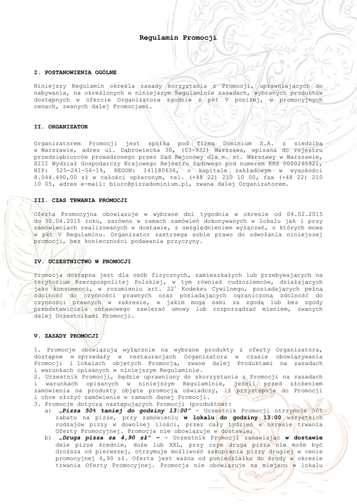 Regulamin Promocji I. POSTANOWIENIA OGÓLNE Niniejszy Regulamin określa zasady korzystania z Promocji, uprawniających do nabywania, na określonych w niniejszym Regulaminie zasadach, wybranych produktów dostępnych w ofercie Organizatora zgodnie z pkt V poniżej, w promocyjnych cenach, zwanych dalej Promocjami. II. ORGANIZATOR Organizatorem Promocji jest spółka pod firmą Dominium S.A. z siedzibą w Warszawie, adres ul. Dąbrowiecka 30, (03-932) Warszawa, wpisana do rejestru przedsiębiorców prowadzonego przez Sąd Rejonowy dla m. st. Warszawy w Warszawie, XIII Wydział Gospodarczy Krajowego Rejestru Sądowego pod numerem KRS 0000295921, NIP: 525-241-56-19, REGON: 141180636, o kapitale zakładowym w wysokości 8.044.490,00 zł w całości opłaconym, tel. (+48 22) 210 10 00, fax (+48 22) 210 10 05, adres e-mail: [email protected], zwana dalej Organizatorem. III. CZAS TRWANIA PROMOCJI Oferta Promocyjna obowiązuje w wybrane dni tygodnia w okresie od 04.02.2015 do 30.04.2015 roku, zarówno w ramach zamówień dokonywanych w lokalu jak i przy zamówieniach realizowanych w dostawie, z uwzględnieniem wyłączeń, o których mowa w pkt V Regulaminu. Organizator zastrzega sobie prawo do odwołania niniejszej promocji, bez konieczności podawania przyczyny. IV. UCZESTNICTWO W PROMOCJI Promocja dostępna jest dla osób fizycznych, zamieszkałych lub przebywających na terytorium Rzeczpospolitej Polskiej, w tym również cudzoziemców, działających jako konsumenci, w rozumieniu art. 221 Kodeksu Cywilnego, posiadających pełną zdolność do czynności prawnych oraz posiadających ograniczoną zdolność do czynności prawnych w zakresie, w jakim mogą sami za zgodą lub bez zgody przedstawiciela ustawowego zawierać umowy lub rozporządzać mieniem, zwanych dalej Uczestnikami Promocji. V. ZASADY PROMOCJI 1. Promocje obowiązują wyłącznie na wybrane produkty z oferty Organizatora, dostępne w sprzedaży w restauracjach Organizatora w czasie obowiązywania Promocji i lokalach objętych Promocją, zwane dalej Produktami na zasadach i warunkach opisanych w niniejszym Regulaminie. 2. Uczestnik Promocji, będzie uprawniony do skorzystania z Promocji na zasadach i warunkach opisanych w niniejszym Regulaminie, jeżeli przed złożeniem zamówienia na produkty objęte promocją oświadczy, iż przystępuje do Promocji i chce złożyć zamówienie w ramach danej Promocji. 3. Promocje dotyczą następujących Promocji (produktów): a) „Pizza 50% taniej do godziny 13:00” - Uczestnik Promocji otrzymuje 50% rabatu na pizze, przy zamówieniu w lokalu do godziny 13:00 wszystkich rodzajów pizzy w dowolnej ilości, przez cały tydzień w okresie trwania Oferty Promocyjnej. Promocja nie obowiązuje w dostawie; b) „Druga pizza za 4,90 zł” – - Uczestnik Promocji zamawiając w dostawie dwie pizze średnie, duże lub XXL, przy czym druga pizza nie może być droższa od pierwszej, otrzymuje możliwość zakupienia pizzy drugiej w cenie promocyjnej 4,90 zł. Oferta jest ważna od poniedziałku do środy w okresie trwania Oferty Promocyjnej. Promocja nie obowiązuje na miejscu w lokalu i nie dotyczy pizz z rodzaju Della Casa i Della Casa Bianca; „Napój 1l za 1,90 zł” – cena promocyjna napoju 1l (do wyboru Pepsi, Pepsi Max, Mirinda lub 7 Up), obowiązuje w dostawie do zamówienia, składającego się z co najmniej dwóch pizz średnich, dużych lub XXL, przez cały tydzień w okresie trwania Oferty Promocyjnej. Promocja nie obowiązuje na miejscu w lokalu; d) „Deser Nero lub Bianco za 2,90 zł” – cena promocyjna deseru obowiązuje przy zamówieniu na miejscu w lokalu, przez cały tydzień w okresie trwania Oferty Promocyjnej, wyłącznie do wyczerpania zapasów. Promocja nie obowiązuje w dostawie; e) „Zestaw za 37,90 zł” obejmuje pizzę dużą z maksymalnie trzema składnikami, napój 1l (do wyboru Pepsi, Pepsi Max, Mirinda lub 7 Up) oraz dwa sosy do pizzy. Kupon obowiązuje w dostawie przez cały tydzień w okresie trwania Oferty Promocyjnej. Promocja nie obowiązuje na miejscu w lokalu i nie dotyczy pizz z rodzaju Della Casa i Della Casa Bianca; f) „Lunch Pizza 18,90 zł” obowiązuje w dostawie od poniedziałku do piątku w godzinach 11:00-16:00 w okresie trwania Oferty Promocyjnej przy zamówieniu pizzy średniej, jednej z wymienionych: margherita, funghi, capriciosa, pepperoni, hawajska, flambee. Promocja nie obowiązuje na miejscu w lokalu; g) „Lunch Pasta 18,90 zł” obowiązuje w dostawie od poniedziałku do piątku w godzinach 11:00-16:00 w okresie trwania Oferty Promocyjnej przy zamówieniu dużej porcji pasty, jednej z wymienionych: spaghetti bolognese, spaghetti carbonara, penne spinaci. Promocja nie obowiązuje na miejscu w lokalu. 4. Warunkiem skorzystania z Promocji przy składaniu zamówienia w lokalu jest uprzednie złożenie oświadczenia przez uczestnika Promocji o przystąpieniu do Promocji i powołanie się na Promocję w lokalu, w którym Promocja będzie realizowana. Uczestnik Promocji zobowiązany jest złożyć oświadczenie przed zamówieniem wybranego produktu dostępnego w ramach Promocji. 5. Zamówienia w dostawie realizowane są po uprzednim złożeniu zamówienia w formie telefonicznej pod numerem infolinii: (+48 22) 210 10 10 10, opłata jak za połączenie lokalne, zgodnie z cennikiem Operatora sieci, z której wykonywane jest połączenie. 6. W przypadku realizacji zamówienia w dostawie, niezbędne jest poinformowanie osoby przyjmującej zamówienie o zamiarze skorzystania z Promocji z daną ofertą rabatową w momencie składania zamówienia. 7.Promocja nie dotyczy kosztów dostawy zamówienia. 8. Po złożeniu zamówienia nie ma możliwości przystąpienia do Promocji. W przypadku niezłożenia oświadczenia o przystąpieniu do Promocji, Zamawiający nie będzie objęty jej zasadami, a ceny na zamówione Produkty będą odpowiadać aktualnemu cennikowi produktów Organizatora, dostępnego na stronie internetowej Organizatora pod adresem