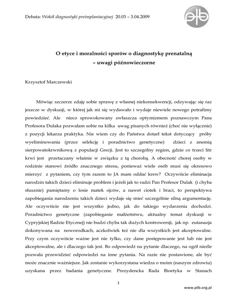 Debata: Wokół diagnostyki preimplantacyjnej 20.03 – 3.04.2009 O etyce i moralności sporów o diagnostykę prenatalną – uwagi późnowieczorne Krzysztof Marczewski Mówiąc szczerze zdaję sobie sprawę z własnej niekonsekwencji, odzywając się raz jeszcze w dyskusji, w której jak mi się wydawało i wydaje niewiele nowego potrafimy powiedzieć. Ale nieco sprowokowany zwłaszcza optymizmem poznawczym Pana Profesora Dulaka pozwalam sobie na kilka uwag pisanych również (choć nie wyłącznie) z pozycji lekarza praktyka. Nie wiem czy do Państwa dotarł tekst dotyczący próby wyeliminowania (przez selekcję i poradnictwo genetyczne) dzieci z anemią sierpowatokrwnikową z populacji Grecji. Jest to szczególny region, gdzie co trzeci litr krwi jest przetaczany właśnie w związku z tą chorobą. A obecność chorej osoby w rodzinie stanowi źródło znacznego stresu, ponieważ wiele osób musi się okresowo mierzyć z pytaniem, czy tym razem to JA mam oddać krew? Oczywiście eliminacja narodzin takich dzieci eliminuje problem i jeżeli jak to radzi Pan Profesor Dulak (i chyba słusznie) pamiętamy o losie matek ojców, a nawet ciotek i braci, to perspektywa zapobiegania narodzeniu takich dzieci wydaje się mieć szczególnie silną argumentację. Ale oczywiście nie jest wszystko jedno, jak do takiego wydarzenia dochodzi. Poradnictwo genetyczne (zapobieganie małżeństwu, aktualny temat dyskusji w Cypryjskiej Radzie Etycznej) nie budzi chyba tak dużych kontrowersji, jak np. eutanazja dokonywana na noworodkach, aczkolwiek też nie dla wszystkich jest akceptowalne. Przy czym oczywiście ważne jest nie tylko, czy dane postępowanie jest lub nie jest akceptowalne, ale i dlaczego tak jest. Bo odpowiedź na pytanie dlaczego, na ogół nieźle pozwala przewidzieć odpowiedzi na inne pytania. Na razie nie postawione, ale być może znacznie ważniejsze. Jak zostanie wykorzystana wiedza o moim (naszym zdrowiu) uzyskana przez badania genetyczne. Prezydencka Rada Bioetyka w Stanach 1 www.ptb.org.pl Debata: Wokół diagnostyki preimplantacyjnej 20.03 – 3.04.2009 Zjednoczonych pracuje nad etyczną oceną badań przesiewowych dokonywanych co roku u 4 mln amerykańskich noworodków. Badania te służą wykryciu 21 (o ile dobrze pamiętam) chorób, których leczenie znamy i chyba 28, których nie umiemy leczyć. Problem to oczywiście te 28. Do czego posłuży wiedza, jeżeli nie można jej, przynajmniej w tej chwili, użyć w celach terapeutycznych. Czy raczej komu posłuży? Badanemu dziecku, aby przed czymś ostrzec, czy może w przyszłości stworzyć szanse na leczenie, czy też otoczeniu, aby go nie ubezpieczać, nie przyjmować do pracy, nie żenić się z nim. To oczywiście znacznie łagodniejsze, niż aby nie pozwolić mu żyć. Dlatego oczywiście (aż mi wstyd o tym pisać) sama diagnostyka perimplantacyjna nie jest problematyczna inaczej niż przez konsekwencje wobec DIAGNOZOWANEGO. Niestety nie podzielam optymizmu poznawczego profesorów Stępnia i Dulaka. Jeżeli byłoby tak dobrze, to nie miałbym trudności, ze znalezieniem polskiego eksperta w zakresie biologii syntetycznej. Być może rzeczywiście osiągnięcia nauk przyrodniczych (bo raczej nie samej biologii) doprowadzą do przełomu nie tylko w naszym rozumieniu świata, ale i zmienią realny świat znacznie bardziej niż zapłodnienie „in vitro”, czy klonowanie. Może inaczej spojrzymy na początki nie tylko życia ludzkiego, ale życia w ogóle. I to rozumianego tak jak bios jak i zoe. Ale póki co, przydałoby się trochę skromności i uczciwa (moim zdaniem) odpowiedź: ciągle jeszcze niewiele wiemy. A jeżeli rzeczywiście nie wiemy wszystkiego, to postępujmy ostrożnie. Nikt odpowiedzialny nie będzie strzelał do celu NIE UPEWNIWSZY SIĘ, że nie ma tam ludzi. A co można zaproponować w praktyce. Chyba tylko „zły kompromis”, z którego nikt nie będzie w pełni zadowolony, ale w demokratycznym społeczeństwie chyba nie uda się inaczej uzyskać większości. Warunkiem takiego kompromisu jest chyba zgoda na niezabijanie, choć podobnie jak wielu innych mądrzejszych ode mnie nie mam pomysłu, co zrobić z tyloma zamrożonymi zarodkami? Ale być może już nie za długo nauka wskaże jakieś rozwiązanie. Tu jestem optymistą. 2 www.ptb.org.pl