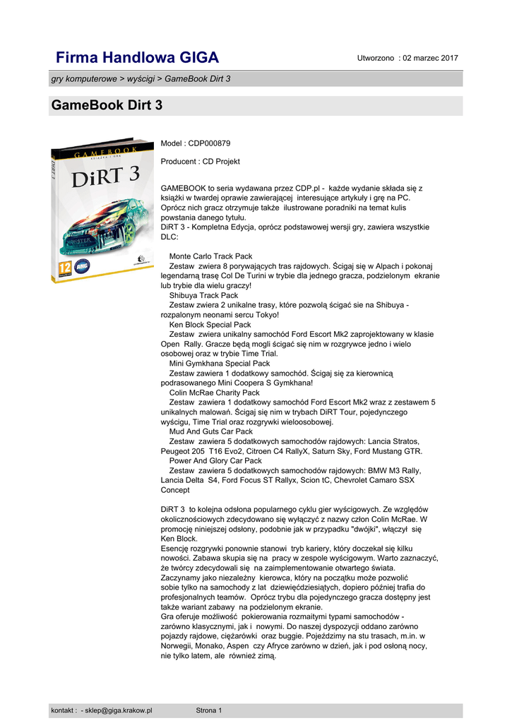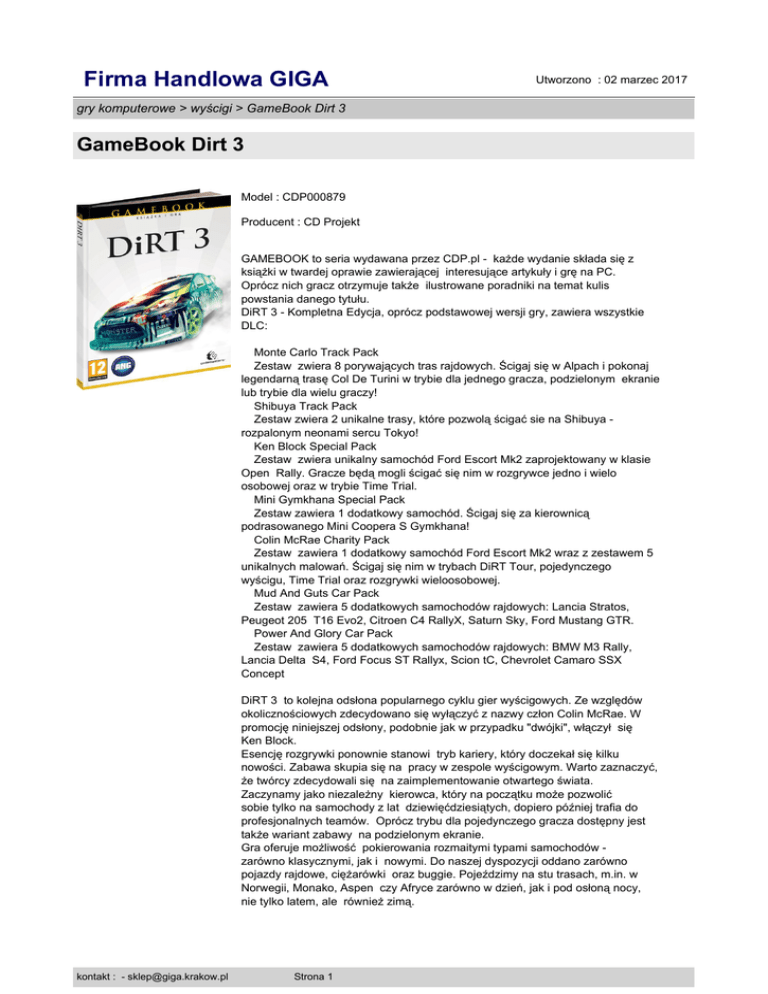 Firma Handlowa GIGA Utworzono : 02 marzec 2017 gry komputerowe > wyścigi > GameBook Dirt 3 GameBook Dirt 3 Model : CDP000879 Producent : CD Projekt GAMEBOOK to seria wydawana przez CDP.pl - każde wydanie składa się z książki w twardej oprawie zawierającej interesujące artykuły i grę na PC. Oprócz nich gracz otrzymuje także ilustrowane poradniki na temat kulis powstania danego tytułu. DiRT 3 - Kompletna Edycja, oprócz podstawowej wersji gry, zawiera wszystkie DLC: Monte Carlo Track Pack Zestaw zwiera 8 porywających tras rajdowych. Ścigaj się w Alpach i pokonaj legendarną trasę Col De Turini w trybie dla jednego gracza, podzielonym ekranie lub trybie dla wielu graczy! Shibuya Track Pack Zestaw zwiera 2 unikalne trasy, które pozwolą ścigać sie na Shibuya rozpalonym neonami sercu Tokyo! Ken Block Special Pack Zestaw zwiera unikalny samochód Ford Escort Mk2 zaprojektowany w klasie Open Rally. Gracze będą mogli ścigać się nim w rozgrywce jedno i wielo osobowej oraz w trybie Time Trial. Mini Gymkhana Special Pack Zestaw zawiera 1 dodatkowy samochód. Ścigaj się za kierownicą podrasowanego Mini Coopera S Gymkhana! Colin McRae Charity Pack Zestaw zawiera 1 dodatkowy samochód Ford Escort Mk2 wraz z zestawem 5 unikalnych malowań. Ścigaj się nim w trybach DiRT Tour, pojedynczego wyścigu, Time Trial oraz rozgrywki wieloosobowej. Mud And Guts Car Pack Zestaw zawiera 5 dodatkowych samochodów rajdowych: Lancia Stratos, Peugeot 205 T16 Evo2, Citroen C4 RallyX, Saturn Sky, Ford Mustang GTR. Power And Glory Car Pack Zestaw zawiera 5 dodatkowych samochodów rajdowych: BMW M3 Rally, Lancia Delta S4, Ford Focus ST Rallyx, Scion tC, Chevrolet Camaro SSX Concept DiRT 3 to kolejna odsłona popularnego cyklu gier wyścigowych. Ze względów okolicznościowych zdecydowano się wyłączyć z nazwy człon Colin McRae. W promocję niniejszej odsłony, podobnie jak w przypadku "dwójki", włączył się Ken Block. Esencję rozgrywki ponownie stanowi tryb kariery, który doczekał się kilku nowości. Zabawa skupia się na pracy w zespole wyścigowym. Warto zaznaczyć, że twórcy zdecydowali się na zaimplementowanie otwartego świata. Zaczynamy jako niezależny kierowca, który na początku może pozwolić sobie tylko na samochody z lat dziewięćdziesiątych, dopiero później trafia do profesjonalnych teamów. Oprócz trybu dla pojedynczego gracza dostępny jest także wariant zabawy na podzielonym ekranie. Gra oferuje możliwość pokierowania rozmaitymi typami samochodów zarówno klasycznymi, jak i nowymi. Do naszej dyspozycji oddano zarówno pojazdy rajdowe, ciężarówki oraz buggie. Pojeździmy na stu trasach, m.in. w Norwegii, Monako, Aspen czy Afryce zarówno w dzień, jak i pod osłoną nocy, nie tylko latem, ale również zimą. kontakt : - [email protected] Strona 1 Firma Handlowa GIGA gry komputerowe > wyścigi > GameBook Dirt 3 GameBook Dirt 3 Cena : 19,99 zł Brutto ( 19,99 zł Netto) kontakt : - [email protected] Strona 2 Utworzono : 02 marzec 2017