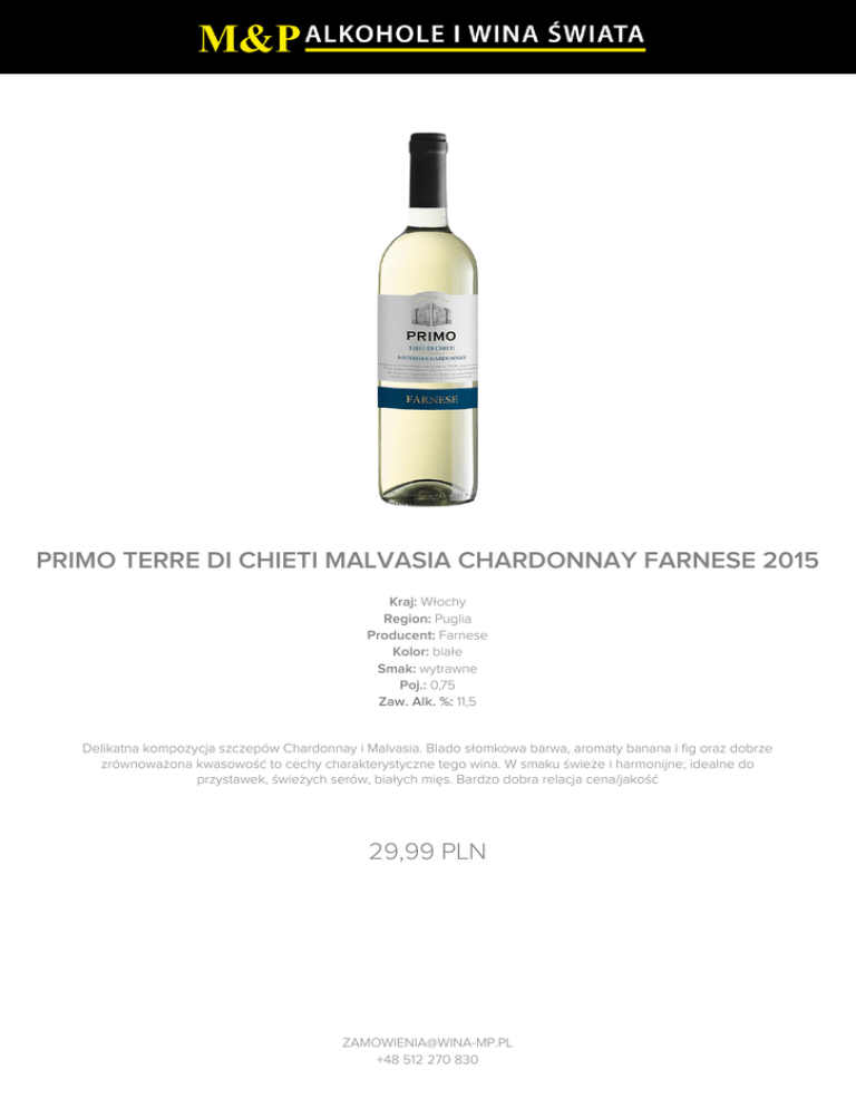 PRIMO TERRE DI CHIETI MALVASIA CHARDONNAY FARNESE 2015 Kraj: Włochy Region: Puglia Producent: Farnese Kolor: białe Smak: wytrawne Poj.: 0,75 Zaw. Alk. %: 11,5 Delikatna kompozycja szczepów Chardonnay i Malvasia. Blado słomkowa barwa, aromaty banana i fig oraz dobrze zrównoważona kwasowość to cechy charakterystyczne tego wina. W smaku świeże i harmonijne; idealne do przystawek, świeżych serów, białych mięs. Bardzo dobra relacja cena/jakość 29,99 PLN [email protected] +48 512 270 830