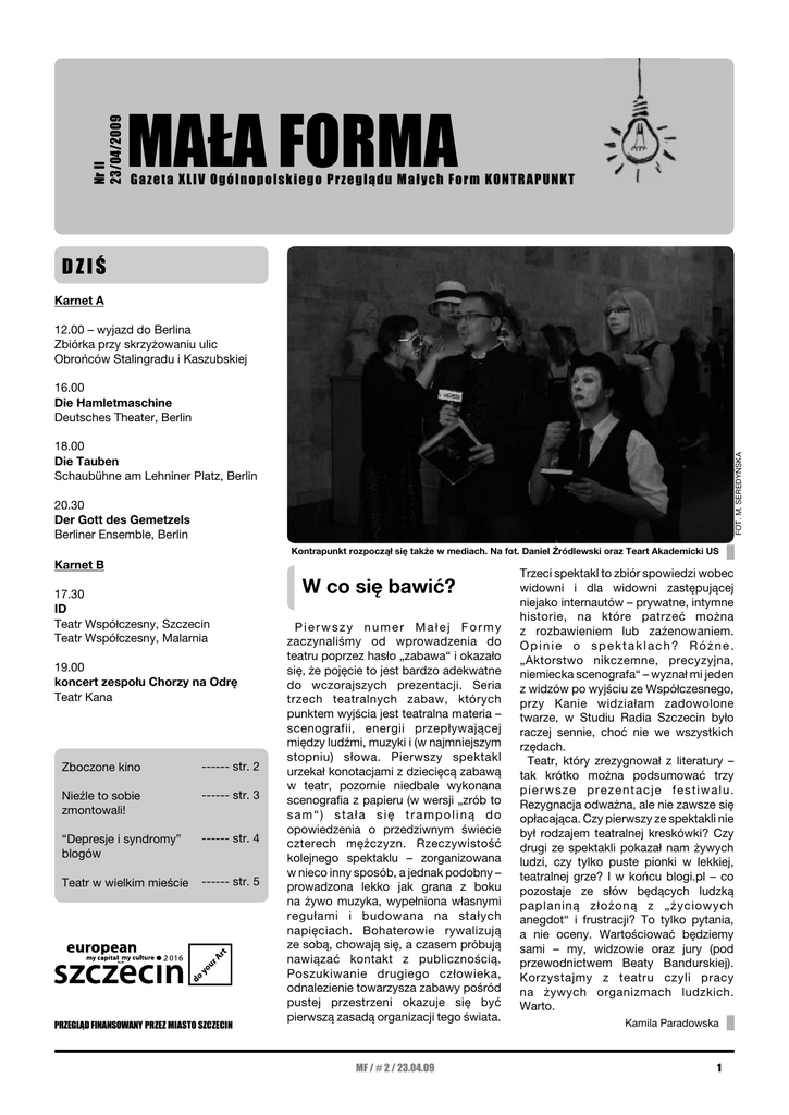 Nr II 23/04/2009 MA£A FORMA G a z e t a X L I V O g ó l n o p o l s k i e g o P r z e g l ¹ d u M a ³ y c h F o r m KO N T R A P U N K T DZIŒ Karnet A 12.00 – wyjazd do Berlina Zbiórka przy skrzy¿owaniu ulic Obroñców Stalingradu i Kaszubskiej 16.00 Die Hamletmaschine Deutsches Theater, Berlin FOT. M. SEREDYÑSKA 18.00 Die Tauben Schaubühne am Lehniner Platz, Berlin 20.30 Der Gott des Gemetzels Berliner Ensemble, Berlin Kontrapunkt rozpocz¹³ siê tak¿e w mediach. Na fot. Daniel ródlewski oraz Teart Akademicki US Karnet B 17.30 ID Teatr Wspó³czesny, Szczecin Teatr Wspó³czesny, Malarnia 19.00 koncert zespo³u Chorzy na Odrê Teatr Kana Zboczone kino ------ str. 2 NieŸle to sobie zmontowali! ------ str. 3 “Depresje i syndromy” blogów ------ str. 4 Teatr w wielkim mieœcie ------ str. 5 PRZEGL¥D FINANSOWANY PRZEZ MIASTO SZCZECIN W co siê bawiæ? Pierwszy numer Ma³ej Formy zaczynaliœmy od wprowadzenia do teatru poprzez has³o „zabawa“ i okaza³o siê, ¿e pojêcie to jest bardzo adekwatne do wczorajszych prezentacji. Seria trzech teatralnych zabaw, których punktem wyjœcia jest teatralna materia – scenografii, energii przep³ywaj¹cej miêdzy ludŸmi, muzyki i (w najmniejszym stopniu) s³owa. Pierwszy spektakl urzeka³ konotacjami z dzieciêc¹ zabaw¹ w teatr, pozornie niedbale wykonana scenografia z papieru (w wersji „zrób to sam“) sta³a siê trampolin¹ do opowiedzenia o przedziwnym œwiecie czterech mê¿czyzn. Rzeczywistoœæ kolejnego spektaklu – zorganizowana w nieco inny sposób, a jednak podobny – prowadzona lekko jak grana z boku na ¿ywo muzyka, wype³niona w³asnymi regu³ami i budowana na sta³ych napiêciach. Bohaterowie rywalizuj¹ ze sob¹, chowaj¹ siê, a czasem próbuj¹ nawi¹zaæ kontakt z publicznoœci¹. Poszukiwanie drugiego cz³owieka, odnalezienie towarzysza zabawy poœród pustej przestrzeni okazuje siê byæ pierwsz¹ zasad¹ organizacji tego œwiata. MF / # 2 / 23.04.09 Trzeci spektakl to zbiór spowiedzi wobec widowni i dla widowni zastêpuj¹cej niejako internautów – prywatne, intymne historie, na które patrzeæ mo¿na z rozbawieniem lub za¿enowaniem. Opinie o spektaklach? Ró¿ne. „Aktorstwo nikczemne, precyzyjna, niemiecka scenografa“ – wyzna³ mi jeden z widzów po wyjœciu ze Wspó³czesnego, przy Kanie widzia³am zadowolone twarze, w Studiu Radia Szczecin by³o raczej sennie, choæ nie we wszystkich rzêdach. Teatr, który zrezygnowa³ z literatury – tak krótko mo¿na podsumowaæ trzy pierwsze prezentacje festiwalu. Rezygnacja odwa¿na, ale nie zawsze siê op³acaj¹ca. Czy pierwszy ze spektakli nie by³ rodzajem teatralnej kreskówki? Czy drugi ze spektakli pokaza³ nam ¿ywych ludzi, czy tylko puste pionki w lekkiej, teatralnej grze? I w koñcu blogi.pl – co pozostaje ze s³ów bêd¹cych ludzk¹ paplanin¹ z³o¿on¹ z „¿yciowych anegdot“ i frustracji? To tylko pytania, a nie oceny. Wartoœciowaæ bêdziemy sami – my, widzowie oraz jury (pod przewodnictwem Beaty Bandurskiej). Korzystajmy z teatru czyli pracy na ¿ywych organizmach ludzkich. Warto. Kamila Paradowska 1 P O S TA Æ D N I A WYDARZENIA Zboczone kino? Dimiter Gotscheff Slavoj Žižek w swoim trzyczêœciowym filmie Z-boczona historia kina, bêd¹cym tak naprawdê audiowizualnym wyk³adem o kinie, przybli¿y³ widzom swój punkt widzenia w sprawie interpretacji klasycznych tytu³ów. W Teatrze Ma³ym odby³ siê pokaz, dziêki któremu publicznoœæ KONTRAPUNKTU mog³a zapoznaæ siê ze spostrze¿eniami tego znanego teoretyka. wyrzeka siê bogatej oprawy scenicznej. Pusta przestrzeñ ma eksponowaæ pe³nie mo¿liwoœci aktora. Gotscheff pragnie odnaleŸæ nag¹ duszê cz³owieka, co pozwoli mu stworzyæ dzie³o idealne. Jego inscenizacje uwa¿ane s¹ za doœæ surowe i ponure, choæ nie mo¿na odmówiæ twórcy wyrafinowanego humoru. Podczas tegorocznego KONTRAPUNKTU Dimiter Gotscheff zaprezentuje widzom spektakl Die Oprac. Hamletmaschine. Joanna Flis FOT. M. SEREDYÑSKA Nazywany przez krytyków samotnym fenomenem teatrów niemiecko-jêzycznych Dimiter Gotscheff urodzi³ siê 26.04.1943 roku w Bu³garii. Piewca filozofii teatru ubogiego pocz¹tkowo ze swym dzisiejszym zawodem nie wi¹za³ przysz³oœci. Po przyjeŸdzie do NRD w 1962 roku rozpocz¹³ studia weterynaryjne. Dopiero póŸniejsze decyzje zaprowadzi³y go na Uniwersytet Humboldta w Berlinie Wschodnim, gdzie zacz¹³ studiowaæ teatrologiê. W 1968 roku zosta³ uczniem Benno Bessona i asystentem re¿ysera u boku Fritza Marquardta oraz nawi¹za³ kontakty z Heinerem Müllerem, którego sztuki w póŸniejszych latach najchêtniej re¿yserowa³. Pocz¹tkowo tworzy³ w Bu³garii, a od 1986 ju¿ regularnie w Niemczech. Przez lata wspó³pracowa³ z najwa¿niejszymi scenami niemieckimi W 1991 roku dosta³ nagrodê Stowarzyszenia Krytyków Berliñskiej Akademii Sztuki. Trzykrotnie zosta³ og³oszony re¿yserem roku w ankiecie przeprowadzonej przez krytyków czasopisma „Theater heute”. Obecnie jest etatowym re¿yserem berliñskiego Deutsches Theater. W jego re¿yserskim dorobku odnajdziemy dramaty pozornie skrajne – od klasyki po dzie³a najnowsze – Ajschylos, Szekspir, Koltes. W swych inscenizacjach wierny jest jednej zasadzie – Žižek zabiera widzów w d³ug¹, bo prawie 3 godzinn¹ podró¿ po rozmaitych filmowych dzie³ach. Epoki, nurty i gatunki, które analizuje nie maj¹ granic. Badacz omawia ponad czterdzieœci filmów, skupiaj¹c siê g³ównie na twórczoœci Alfreda Hitchcoka, Davida Lyncha i Krzysztofa Kieœlowskiego. Tezy, która wyg³asza doskonale uzupe³niaj¹ tytu³ jego filmu. Owe zboczenia, o których mowa to przede wszystkim kontrowersyjne, œmia³e, a nawet bulwersuj¹ce analizy. Žižek czêsto odnosi siê do sfery fantazji. Przenikanie siê tej przestrzeni z rzeczywistoœci¹ stanowi fundamentalny punkt jego wyk³adu. Metodologia Žižka to przede wszystkim analizowanie poszczególnych scen, symboli czy te¿ nawet pojedynczych ujêæ za pomo