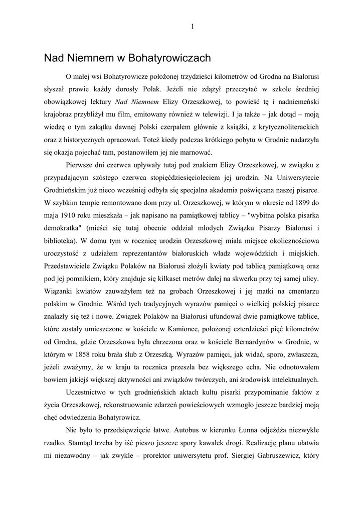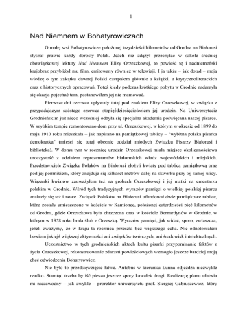 1 Nad Niemnem w Bohatyrowiczach O małej wsi Bohatyrowicze położonej trzydzieści kilometrów od Grodna na Białorusi słyszał prawie każdy dorosły Polak. Jeżeli nie zdążył przeczytać w szkole średniej obowiązkowej lektury Nad Niemnem Elizy Orzeszkowej, to powieść tę i nadniemeński krajobraz przybliżył mu film, emitowany również w telewizji. I ja także – jak dotąd – moją wiedzę o tym zakątku dawnej Polski czerpałem głównie z książki, z krytycznoliterackich oraz z historycznych opracowań. Toteż kiedy podczas krótkiego pobytu w Grodnie nadarzyła się okazja pojechać tam, postanowiłem jej nie marnować. Pierwsze dni czerwca upływały tutaj pod znakiem Elizy Orzeszkowej, w związku z przypadającym szóstego czerwca stopięćdziesięcioleciem jej urodzin. Na Uniwersytecie Grodnieńskim już nieco wcześniej odbyła się specjalna akademia poświęcana naszej pisarce. W szybkim tempie remontowano dom przy ul. Orzeszkowej, w którym w okresie od 1899 do maja 1910 roku mieszkała – jak napisano na pamiątkowej tablicy – "wybitna polska pisarka demokratka" (mieści się tutaj obecnie oddział młodych Związku Pisarzy Białorusi i biblioteka). W domu tym w rocznicę urodzin Orzeszkowej miała miejsce okolicznościowa uroczystość z udziałem reprezentantów białoruskich władz wojewódzkich i miejskich. Przedstawiciele Związku Polaków na Białorusi złożyli kwiaty pod tablicą pamiątkową oraz pod jej pomnikiem, który znajduje się kilkaset metrów dalej na skwerku przy tej samej ulicy. Wiązanki kwiatów zauważyłem też na grobach Orzeszkowej i jej matki na cmentarzu polskim w Grodnie. Wśród tych tradycyjnych wyrazów pamięci o wielkiej polskiej pisarce znalazły się też i nowe. Związek Polaków na Białorusi ufundował dwie pamiątkowe tablice, które zostały umieszczone w kościele w Kamionce, położonej czterdzieści pięć kilometrów od Grodna, gdzie Orzeszkowa była chrzczona oraz w kościele Bernardynów w Grodnie, w którym w 1858 roku brała ślub z Orzeszką. Wyrazów pamięci, jak widać, sporo, zwłaszcza, jeżeli zważymy, że w kraju ta rocznica przeszła bez większego echa. Nie odnotowałem bowiem jakiejś większej aktywności ani związków twórczych, ani środowisk intelektualnych. Uczestnictwo w tych grodnieńskich aktach kultu pisarki przypominanie faktów z życia Orzeszkowej, rekonstruowanie zdarzeń powieściowych wzmogło jeszcze bardziej moją chęć odwiedzenia Bohatyrowicz. Nie było to przedsięwzięcie łatwe. Autobus w kierunku Łunna odjeżdża niezwykle rzadko. Stamtąd trzeba by iść pieszo jeszcze spory kawałek drogi. Realizację planu ułatwia mi niezawodny – jak zwykle – prorektor uniwersytetu prof. Siergiej Gabruszewicz, który 2 prywatnym samochodem zdecydowała się na moją prośbę tam pojechać. Wyjeżdżamy po południu, kiedy już nieco uporał się ze swoimi rozlicznymi obowiązkami w rektoracie. W podróż udaje się z nami Walenty Czekin, przyjaciel profesora, rodowity moskwianin, poeta i malarz, od trzydziestu lat zamieszkały w Grodnie. Maluje głównie krajobrazy białoruskie, portrety, do niedawna również wodzów rewolucji i Gorbaczowa. Teraz – śmieje się – pozostałem przy osobach „świeckich”. – Może więc mnie namalujesz – żartuje profesor. – jak na to zasłużysz lub dobrze zapłacisz – odpowiada również żartobliwie artysta. Znają się przecież od lat. Na ścianach mieszkania Gabruszewicza wiszą pejzaże Czekina. Nasza wołga mknie prostą jak strzała drogą wśród lekko pofalowanych pól, co pewien czas poprzecinanych dorodnymi lasami. Prorektor Gabruszewicz zwraca mi uwagę na obsiane pola okolicznych kołchozów, na ich solidne zabudowania, na monumentalne wiejskie domy kultury. Jako rodowity Białorusin jest dumny ze swej krainy. Pochodzi spod Grodna. W Bohatyrowiczach jednak jeszcze nie był. Zna je podobnie jak i ja z powieści Elizy Orzeszkowej. Malarz nic nie wie ani a pisarce, ani o jej utworze. Jedzie tam, by szukać inspiracji estetycznych w nadniemeńskim krajobrazie. Na dwudziestym siódmym kilometrze skręcamy z drogi głównej w lewo i najpierw asfaltową, później piaszczystą dróżką, na której grzęzną koła samochodu docieramy do jakiejś wsi. Okazało się. że to jeszcze nie są Bohatyrowicze. Pytamy więc o drogę chłopów oczekujących na autobus. – Przejechali panowie trochę, trzeba wrócić jakie dwa kilometry i potem w prawo – tłumaczy ktoś z gromadki stojącej na przystanku. W tym momencie wychodzi z tej grupy średniego wzrostu mężczyzna o ogorzałej od słońca i wiatru twarzy, z rekoma jak dwa bochny chleba, w roboczym ubraniu, w czapce na głowie. – Ja was tam zaprowadza. jadę w tamtym kierunku, mieszkam w Bohatyrowiczach. Ruszamy Rozmowa toczy się najpierw w języku rosyjskim, prorektor zagaduje naszego gościa po białorusku. W obu językach wypowiada się on swobodnie. Jest jednak nieco nieufny. Pyta, co nas sprowadza do jego wioski. Kiedy dowiaduje się, że jestem z Polski, rozjaśnia mu się twarz, znika wcześniejsze napięcie. Zwraca się da mnie w najczystszej polszczyźnie. – Nazywają mnie Tadzik, Tadeusz Bohatyrowicz jestem z tych Bohatyrowiczów, co ich pani Orzeszkowa w powieści opisała. Mieszkam niedaleko miniewicz, obok dworu, do którego pisarka przyjeżdżała na wakacje. Czy ten sam dom wtedy tutaj stał, na pewno nie wiem. W tym miejscu to jednak było. Dom teraz opuszczony. Kupił go jakiś wojskowy, chyba generał, będzie rozbudowywał, nawiózł sporo materiału. Wcześniej tam była poczta, magazyn i diabeł sam wie jeszcze co. 3 Bohatyrowicz jest szoferem w kołchozie. Ma działkę przyzagrodową, na której uprawia i hoduje wszystko, co do życia jest potrzebne. W zakresie wyżywienia jest samowystarczalny. Na los swój nie narzeka. Ma auto "żyguli", stare, niestety osiemnastoletnie. Trzyma się ono jeszcze, gdyż jako szofer ma się na mechanice. Drobne remonty