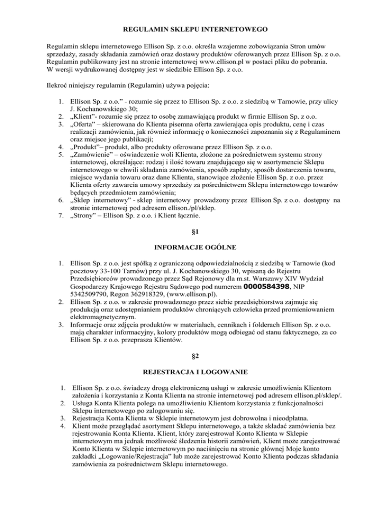 REGULAMIN SKLEPU INTERNETOWEGO Regulamin sklepu internetowego Ellison Sp. z o.o. określa wzajemne zobowiązania Stron umów sprzedaży, zasady składania zamówień oraz dostawy produktów oferowanych przez Ellison Sp. z o.o. Regulamin publikowany jest na stronie internetowej www.ellison.pl w postaci pliku do pobrania. W wersji wydrukowanej dostępny jest w siedzibie Ellison Sp. z o.o. Ilekroć niniejszy regulamin (Regulamin) używa pojęcia: 1. Ellison Sp. z o.o.” - rozumie się przez to Ellison Sp. z o.o. z siedzibą w Tarnowie, przy ulicy J. Kochanowskiego 30; 2. „Klient”- rozumie się przez to osobę zamawiającą produkt w firmie Ellison Sp. z o.o. 3. „Oferta” – skierowana do Klienta pisemna oferta zawierająca opis produktu, cenę i czas realizacji zamówienia, jak również informację o konieczności zapoznania się z Regulaminem oraz miejsce jego publikacji; 4. „Produkt”– produkt, albo produkty oferowane przez Ellison Sp. z o.o. 5. „Zamówienie” – oświadczenie woli Klienta, złożone za pośrednictwem systemu strony internetowej, określające: rodzaj i ilość towaru znajdującego się w asortymencie Sklepu internetowego w chwili składania zamówienia, sposób zapłaty, sposób dostarczenia towaru, miejsce wydania towaru oraz dane Klienta, stanowiące złożenie Ellison Sp. z o.o. przez Klienta oferty zawarcia umowy sprzedaży za pośrednictwem Sklepu internetowego towarów będących przedmiotem zamówienia; 6. „Sklep internetowy” - sklep internetowy prowadzony przez Ellison Sp. z o.o. dostępny na stronie internetowej pod adresem ellison./pl/sklep. 7. „Strony” – Ellison Sp. z o.o. i Klient łącznie. §1 INFORMACJE OGÓLNE 1. Ellison Sp. z o.o. jest spółką z ograniczoną odpowiedzialnością z siedzibą w Tarnowie (kod pocztowy 33-100 Tarnów) przy ul. J. Kochanowskiego 30, wpisaną do Rejestru Przedsiębiorców prowadzonego przez Sąd Rejonowy dla m.st. Warszawy XIV Wydział Gospodarczy Krajowego Rejestru Sądowego pod numerem 0000584398, NIP 5342509790, Regon 362918329, (www.ellison.pl). 2. Ellison Sp. z o.o. w zakresie prowadzonego przez siebie przedsiębiorstwa zajmuje się produkcją oraz udostępnianiem produktów chroniących człowieka przed promieniowaniem elektromagnetycznym. 3. Informacje oraz zdjęcia produktów w materiałach, cennikach i folderach Ellison Sp. z o.o. mają charakter informacyjny, kolory produktów mogą odbiegać od stanu faktycznego, za co Ellison Sp. z o.o. przeprasza Klientów. §2 REJESTRACJA I LOGOWANIE 1. Ellison Sp. z o.o. świadczy drogą elektroniczną usługi w zakresie umożliwienia Klientom założenia i korzystania z Konta Klienta na stronie internetowej pod adresem ellison.pl/sklep/. 2. Usługa Konta Klienta polega na umożliwieniu Klientom korzystania z funkcjonalności Sklepu internetowego po zalogowaniu się. 3. Rejestracja Konta Klienta w Sklepie internetowym jest dobrowolna i nieodpłatna. 4. Klient może przeglądać asortyment Sklepu internetowego, a także składać zamówienia bez rejestrowania Konta Klienta. Klient, który zarejestrował Konto Klienta w Sklepie internetowym ma jednak możliwość śledzenia historii zamówień, Klient może zarejestrować Konto Klienta w Sklepie internetowym po naciśnięciu na stronie głównej Moje konto zakładki „Logowanie/Rejestracja” lub może zarejestrować Konto Klienta podczas składania zamówienia za pośrednictwem Sklepu internetowego. 5. Zarejestrowanie Konta Klienta w Sklepie internetowym wymaga wypełnienia formularza rejestracji przez podanie adresu poczty elektronicznej (adresu e-mail) oraz hasła. W celu dokonania rejestracji Konta Klienta wymagane jest zapoznanie się i zaakceptowanie przez Klienta niniejszego Regulaminu, a także wyrażenie przez Klienta zgody na przetwarzanie jego danych osobowych podanych podczas rejestracji, oznaczonych jako obligatoryjne. Podanie danych oznaczonych jako obligatoryjne jest niezbędne do założenia Konta Klienta, realizacji i obsługi zamówień złożonych w Sklepie internetowym, a także prawidłowej realizacji usług świadczonych drogą elektroniczną. Podanie danych oznaczonych jako obligatoryjne jest dobrowolne, jednakże konieczne w celu założenia Konta Klienta. Podanie danych osobowych nieoznaczonych jako obligatoryjne jest dobrowolne i nie jest konieczne do założenia Konta Klienta. 6. Po wypełnieniu formularza rejestracji należy nacisnąć przycisk „Zarejestruj się”. Następnie, na podany w formularzu rejestracji adres poczty elektronicznej (adres e-mail), zostanie przez Ellison.pl wysłana wiadomość potwierdzająca zarejestrowanie Konta Klienta. Umowa o świadczenie usług drogą elektroniczną w zakresie umożliwienia Klientowi założenia i korzystania z Konta Klienta na stronie internetowej Sklepu internetowego zostaje zawarta w momencie otrzymania przez Klienta wiadomości elektronicznej potwierdzającej zarejestrowanie Konta Klienta. Usługa Konta Klienta świadczona jest nieodpłatnie przez czas nieoznaczony. 7. Po zarejestrowaniu Konta Klienta, Klient może zalogować się do Sklepu internetowego podając wskazany podczas rejestracji adres poczty elektronicznej (adres e-mail) oraz hasło. 8. Klient może wypowiedzieć umowę o świadczenie usługi Konta Klienta w każdej chwili, bez podania przyczyny i bez ponoszenia kosztów, w szczególności przez przesłanie Ellison.pl za pośrednictwem poczty elektronicznej na adres: [email protected] albo w formie pisemnej na adres pocztowy Ellison Sp. z o.o. wskazany w § 1 punkt 1.1) Regulaminu, żądania usunięcia Konta Klienta wraz ze wskazaniem adresu poczty elektronicznej (adresu e-mail) aktualnie zarejestrowanego w Sklepie internetowym. 9. Ellison Sp. z o.o. może wypowiedzieć umowę o świadczenie usługi Konta Klienta z zachowaniem 14-dniowego okresu wypowiedzenia z ważnych przyczyn, do których należą: 1) korzystanie przez Klienta ze Sklepu internetowego w sposób naruszający przepisy prawa lub postanowien