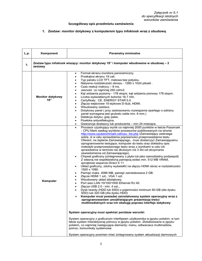Załącznik nr 5.1 do specyfikacji istotnych warunków zamówienia Szczegółowy opis przedmiotu zamówienia 1. Zestaw: monitor dotykowy z komputerem typu infokiosk wraz z obudową L.p. 1. Komponent Parametry minimalne Zestaw typu infokiosk wiszący: monitor dotykowy 19” i komputer wbudowane w obudowę – 3 zestawy Monitor dotykowy 19” Komputer Format ekranu monitora panoramiczny. Przekątna ekranu 19 cali. Typ panelu LCD TFT, matowa bez połysku. Natywna rozdzielczość obrazu - 1280 x 1024 pikseli . Czas reakcji matrycy – 8 ms. Jasność co najmniej 250 cd/m2. Kąt widzenia poziomy - 178 stopni, kąt widzenia pionowy 178 stopni. Liczba wyświetlanych kolorów 16,7 mln. Certyfikaty: CE, ENERGY STAR 5.0. Złącza wejściowe 15-stykowe D-Sub, HDMI. Wbudowany zasilacz. Dotykowy panel ( przy zastosowaniu rozwiązania opartego o szklany panel wymagana jest grubośc szkła min. 6 mm.) Detekcja dotyku: goły palec. Powłoka antyrefleksyjna. Gwarancja dostawcy lub producenta – min 24 miesiące. Procesor uzyskujący wynik co najmniej 2000 punktów w teście Passmark - CPU Mark według wyników procesorów publikowanych na stronie http://www.cpubenchmark.net/cpu_list.php (Zamawiający zastrzega sobie, iż w celu sprawdzenia poprawności przeprowadzenia testu Oferent, na żądanie Zamawiającego, musi dostarczyć Zamawiającemu oprogramowanie testujące, komputer do testu oraz dokładny opis metodyki przeprowadzonego testu wraz z wynikami w celu ich sprawdzenia w terminie nie dłuższym niż 3 dni od otrzymania zawiadomienia od Zamawiającego). Chipset graficzny.(zintegrowany z płyta lub jako samodzielny podzespół) Z własną nie współdzieloną pamięcią wideo min. 512 MB VRAM, sprzętowe wsparcie Direct X 11 Układ graficzny, zdolny wyświetlić na złączu HDMI obraz w rozdzielczości 1920 x 1080. Pamięć maks. 4096 MB, pamięć zainstalowana 2 GB. Złącze HDMI 1 szt., VGA 1 szt. Wbudowany układ dźwiękowy. Port sieci LAN 10/100/1000 Ethernet RJ 45. Złącza USB 2.0 - min. 4 szt.,. Dysk twardy (HDD lub SSD) o pojemności minimum 60 GB (dla dysku SSD) lub 320 GB (dla dysku HDD) Komputer musi posiadać zainstalowany system operacyjny wraz z oprogramowaniem umożliwiającym prezentację treści multimedialnych oraz ich obsługę poprzez interfejs dotykowy System operacyjny musi spełniać poniższe warunki: System operacyjny z graficznym interfejsem użytkownika w języku polskim, w tym także system interaktywnej pomocy w języku polskim. Zlokalizowane w języku polskim, co najmniej następujące elementy: menu, odtwarzacz multimediów, pomoc, komunikaty systemowe. System operacyjny powinien mieć zintegrowany system aktualizacji darmowych 1 Załącznik nr 5.1 do specyfikacji istotnych warunków zamówienia Szczegółowy opis przedmiotu zamówienia 1. Zestaw: monitor dotykowy z komputerem typu infokiosk wraz z obudową poprawek bezpieczeństwa, przy czym komunikacja z użytkownikiem powinna odbywać się w języku polskim. Możliwość zdalnej automatycznej instalacji, konfiguracji, administrowania oraz aktualizowania systemu. Dostępność bezpłatnej telefonicznej pomocy technicznej dotyczącej systemu operacyjnego świadczonej w języku polskim u producenta sprzętu komputerowego (związane z problemami współdziałania sprzętu i systemu operacyjnego) – cena połączenia nie większa niż cena połączenia lokalnego. Dostępność w Internecie na stronach producenta biuletynów technicznych, w tym opisów poprawek bezpieczeństwa, w języku polskim, a także telefonicznej pomocy technicznej producenta systemu operacyjnego świadczonej w języku polskim w dni robocze w godzinach od 8-16 – cena połączenia nie większa niż cena połączenia lokalnego. Możliwość dostosowania do pracy dla osób niepełnosprawnych np. słabowidzących (zgodnie z wytycznymi WCAG 2.0) - zgodnie z wymogami Krajowych Ram Interoperacyjności. System operacyjny musi pozwalać na pracę w różnych sieciach komputerowych (sieci lokalne LAN, Internet), w tym także automatycznie rozpoznawać sieci i ich ustawienia bezpieczeństwa, rozpoznawać automatycznie urządzenia peryferyjne działające w tej sieci (np. drukarki, tablice interaktywne) oraz łączyć się automatycznie z raz zdefiniowanymi sieciami. Obudowa infokiosku 2. Gwarancja dostawcy lub producenta – min 24 miesiące. Obudowa wisząca 19” oparta na konstrukcji stali odpornej na warunki atmosferyczne (blacha o grubości maks. 2 mm), uniemożliwiająca niepowołany dostęp do jednostki sterującej oraz połączeń mocujących. Frontowa część Infokiosku wiszącego pokryta blachą, Drzwiczki rewizyjne zamykane na minimum jeden zamek. Maksymalne całkowite wymiary Infokiosku wiszącego (wys. x szer. x gr.) 1400 x 650 x 130 mm. Ekran monitora montowany równolegle do ściany. Sposób wykonania obudowy musi zapewnić odpowiednią wentylację oraz chłodzenie urządzeń w jej wnętrzu. Wbudowane głośniki stereo – min. 3 Wat. Wysoka estetyka całej obudowy i zabudowy ekranu. Połączenie pomiędzy blachą obudowy a monitorem zabezpieczone uszczelką. Elementy wykonane ze stali malowane proszkowo na kolor wskazany przez Zamawiającego według palety kolorów RAL. Możliwość trwałego i bezpiecznego mocowania Infokiosku do konstrukcji stalowej. Gwarancja dostawcy lub producenta – min 24 miesiące. Zestaw typu infokiosk dualny stojący: Rozwiązanie obejmujące 2 monitory dotykowe 19” i komputer lub 2 komputery wbudowane w jedną obudowę zapewniające funkcjonalność pozwalającą na niezależna prezentacje różnych treści na każdym z monitorów – 2 szt. Monitor do zastosowania dwustronnego Format ekranu monitora panoramiczny. Przekątna ekranu 19 cali. Typ panelu LCD TFT, matowa bez połysku. Natywna rozdzielczość obrazu - 1280 x 1024 pikseli . Czas reakcji matrycy – 8 ms. Jasność co najmniej 250 cd/m2. Kąt widzenia poziomy - 178 stopni, kąt widzenia pionowy 178 stopni. Liczba wyświetlanych kolorów 16,7 mln. 2
