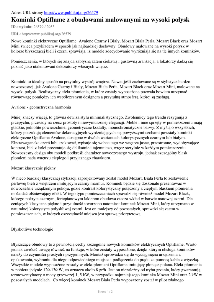 Adres URL strony http://www.publikuj.org/26579 Kominki Optiflame z obudowami malowanymi na wysoki połysk ID artykułu: 26579 / 2053 URL: http://www.publikuj.org/26579 Nowe kominki elektryczne Optiflame: Avalone Czarny i Biały, Mozart Biała Perła, Mozart Black oraz Mozart Mini świecą przykładem w sposób jak najbardziej dosłowny. Obudowy malowane na wysoki połysk w kolorze błyszczącej bieli i czerni sprawiają, iż modele zdecydowanie wyróżniają się na tle innych kominków. Pomieszczenia, w których się znajdą zabłysną zatem ciekawą i gustowną aranżacją, a lokatorzy dadzą się poznać jako utalentowani dekoratorzy własnych wnętrz. Kominki to idealny sposób na przytulny wystrój wnętrza. Nawet jeśli zachowane są w stylistyce bardzo nowoczesnej, jak Avalone Czarny i Biały, Mozart Biała Perła, Mozart Black oraz Mozart Mini, malowane na wysoki połysk. Realistyczny efekt płomienia, w które zostały wyposażone pozwala bowiem utrzymać równowagę pomiędzy ich współczesnym designem a przytulną atmosferą, której są zasługą. Avalone - geometryczna harmonia Mniej znaczy więcej, to główna dewiza stylu minimalistycznego. Zwolennicy tego trendu rezygnują z przepychu, przesady na rzecz prostoty i niewymuszonej elegancji. Meble i inne sprzęty w pomieszczeniu mają gładkie, jednolite powierzchnie, geometryczne kształty, monochromatyczne barwy. Z myślą o wszystkich, którzy poszukują elementów dekoracyjnych wyróżniających się powyższymi cechami powstały kominki elektryczne Optiflame Avalone, dostępne w dwóch wariantach kolorystycznych czarnym lub białym. Ekstrawagancka czerń lubi szokować, wpisuje się wobec tego we wnętrza jasne, przestronne, wydobywające kontrast, biel z kolei prezentuje się delikatnie i tajemniczo, wręcz sterylnie w każdym pomieszczeniu. Nowoczesny design obu modeli podkreśli charakter nowoczesnego wystroju, jednak szczególny blask płomieni nada wnętrzu ciepłego i przyjaznego charakteru. Mozart klasycznie piękny W nieco bardziej klasycznej stylizacji zaprojektowany został model Mozart. Biała Perła to zestawienie perłowej bieli z wnętrzem imitującym czarny marmur. Kominek będzie się doskonale prezentować w nowocześnie urządzonym pokoju, gdzie kontrast kolorystyczny połączony z ciepłym blaskiem płomienia może dać olśniewający efekt. W tego typu pomieszczeniach sprawdzi się również model Mozart Black, którego pokryta czarnym, fortepianowym lakierem obudowa otacza wkład w barwie matowej czerni. Dla ceniących klasyczne piękno i przytulność stworzono natomiast kominek Mozart Mini, który utrzymano w naturalnej kolorystyce połyskliwej czerni. Jest on mniejszy od pozostałych, sprawdzi się zatem w pomieszczeniach, w których oszczędność miejsca jest sprawą priorytetową. Błyskotliwe technologie Błyszczące obudowy to z pewnością cechy szczególne nowych kominków elektrycznych Optiflame. Warto jednak zwrócić uwagę również na funkcje, w które zostały wyposażone, dzięki którym obsługa kominków należy do czynności prostych i przyjemnych. Montaż sprowadza się do wyciągnięcia urządzenia z opakowania, wybraniu dla niego odpowiedniego miejsca i podłączenia do prądu za pomocą kabla z wtyczką. Wszystkie modele wyposażone zostały w efekt płomieni Optiflame imitujący płonące polana. Efekt płomienia w pobiera jedynie 120-130 W, co oznacza około 8 gr/h. Jest on niezależny od trybu grzania, który gwarantują termowentylatory o mocy grzewczej 1, 5 kW, w przypadku najmniejszego kominka Mozart Mini oraz 2 kW w pozostałych modelach. Co więcej kominek Mozart Biała Perła wyposażony został w pilot zdalnego Strona 1 / 2 sterowania, który dodatkowo ułatwia pracę z urządzeniem. Nowości Optiflame - kominki elektryczne z obudowami w kolorze połyskliwej czerni oraz bieli będą stanowić niepowtarzalny element dekoracyjny każdego domu. Ich lśniący lakier, podkreślony blaskiem płomieni, doda bowiem splendoru, elegancji, nowoczesności i szyku wszystkim pomieszczeniom, w których się znajdą. Kominki z obudowami malowanymi na wysoki połysk: Avalone: Typ: kominek plus obudowa Kolor obudowy: czarny/biały Wymiary (wysokość x szerokość x głębokość): 900x900x320 mm Moc grzewcza: 2, 0 kW Pobór energii przez efekt optyczny: 130 W Cena brutto: 2 250, 00 zł Mozart Biała Perła: Kominek wyposażony w pilot zdalnego sterowania Typ: kominek plus obudowa Kolor obudowy: perłowy biały z połyskiem Wymiary (wysokość x szerokość x głębokość): 857x920x375 mm Moc grzewcza: 2, 0 kW Pobór energii przez efekt optyczny: 130 W Cena brutto: 1 490, 00 zł Mozart Black: Typ: kominek plus obudowa Kolor obudowy: czarny z połyskiem Wymiary (wysokość x szerokość x głębokość): 857x920x375 mm Moc grzewcza: 2, 0 kW Pobór energii przez efekt optyczny: 130 W Cena brutto: 1 390, 00 zł Mozart Mini: Typ: kominek plus obudowa Kolor obudowy: czarny z połyskiem Wymiary (wysokość x szerokość x głębokość): 760x700x280 mm Moc grzewcza: 1, 5 kW Pobór energii przez efekt optyczny: 120 W Cena brutto czarny: 1 150, 00 zł Cena brutto orzech: 1 100, 00 zł - - -Grupa Glen Dimplex powstała w 1973 roku i obecnie jest największą na świecie firmą produkującą elektryczne urządzenia grzewcze. Zajmuje ona również uznane miejsce w branży AGD. Glen Dimplex pozostaje w prywatnych rękach i finansuje swój ciągły rozwój z własnych środków. Podstawą jej sukcesu jest polityka ciągłych inwestycji w budowanie marek, wprowadzanie innowacji w zakresie produktu oraz zapewnianie klientom produktów zgodnych z ich oczekiwaniami. Grupa Glen Dimplex stosuje przedsiębiorcze podejście do zarządzania swoimi firmami w wymiarze międzynarodowym, unikając jednocześnie biurokratycznego stylu zarządzania. Podstawową filozofią jej działalności jest budowanie silnych, energicznych i skutecznych firm, od których oczekuje się pracy zgodnie z najwyższymi standard