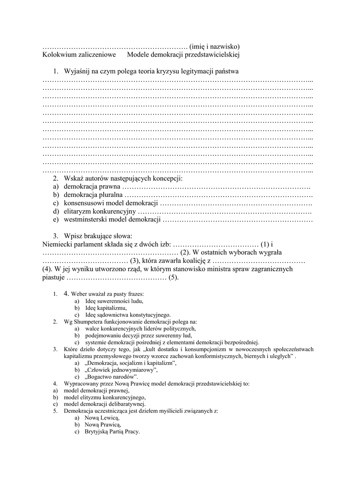 ……………………………………………………. (imię i nazwisko) Kolokwium zaliczeniowe Modele demokracji przedstawicielskiej 1. Wyjaśnij na czym polega teoria kryzysu legitymacji państwa …………………………………………………………………………………………………... …………………………………………………………………………………………………... …………………………………………………………………………………………………... …………………………………………………………………………………………………... …………………………………………………………………………………………………... …………………………………………………………………………………………………... …………………………………………………………………………………………………... …………………………………………………………………………………………………... …………………………………………………………………………………………………... …………………………………………………………………………………………………... …………………………………………………………………………………………………... …………………………………………………………………………………………………... 2. Wskaż autorów następujących koncepcji: a) demokracja prawna ……………………………………………………………………. b) demokracja pluralna ……………………………………………………………………. c) konsensusowi model demokracji ………………………………………………………. d) elitaryzm konkurencyjny ………………………………………………………………. e) westminsterski model demokracji ……………………………………………………… 3. Wpisz brakujące słowa: Niemiecki parlament składa się z dwóch izb: ……………………………… (1) i ………………………………………………… (2). W ostatnich wyborach wygrała ……………………………… (3), która zawarła koalicję z ………………………………… (4). W jej wyniku utworzono rząd, w którym stanowisko ministra spraw zagranicznych piastuje …………………………………… (5). 1. 4. Weber uważał za pusty frazes: a) Ideę suwerenności ludu, b) Ideę kapitalizmu, c) Ideę sądownictwa konstytucyjnego. 2. Wg Shumpetera funkcjonowanie demokracji polega na: a) walce konkurencyjnych liderów politycznych, b) podejmowaniu decyzji przez suwerenny lud, c) systemie demokracji pośredniej z elementami demokracji bezpośredniej. 3. Które dzieło dotyczy tego, jak „kult dostatku i konsumpcjonizm w nowoczesnych społeczeństwach kapitalizmu przemysłowego tworzy wzorce zachowań konformistycznych, biernych i uległych” . a) „Demokracja, socjalizm i kapitalizm”, b) „Człowiek jednowymiarowy”, c) „Bogactwo narodów”. 4. Wypracowany przez Nową Prawicę model demokracji przedstawicielskiej to: a) model demokracji prawnej, b) model elityzmu konkurencyjnego, c) model demokracji delibaratywnej. 5. Demokracja uczestnicząca jest dziełem myślicieli związanych z: a) Nową Lewicą, b) Nową Prawicą, c) Brytyjską Partią Pracy. Scharakteryzuj konsensusowy model demokracji: ………………………………………………………………………………………………… ………………………………………………………………………………………………… ………………………………………………………………………………………………… ………………………………………………………………………………………………… ………………………………………………………………………………………………… ………………………………………………………………………………………………… ………………………………………………………………………………………………… ………………………………………………………………………………………………… ………………………………………………………………………………………………… ………………………………………………………………………………………………… ………………………………………………………………………………………………… ………………………………………………………………………………………………… ………………………………………………………………………………………………… ………………………………………………………………………………………………… ………………………………………………………………………………………………… ………………………………………………………………………………………………… ………………………………………………………………………………………………… ………………………………………………………………………………………………… ………………………………………………………………………………………………… ………………………………………………………………………………………………… ………………………………………………………………………………………………… ……………………………