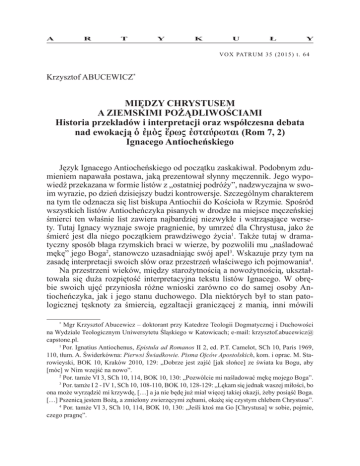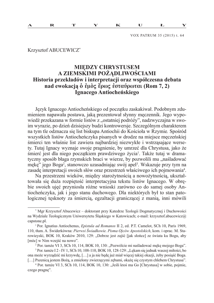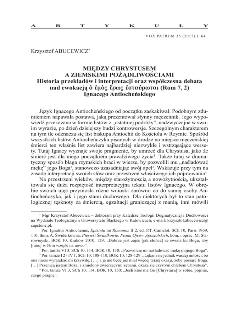 A R T Y K U Ł Y V O X PAT R U M 3 5 ( 2 0 1 5 ) t . 6 4 Krzysztof ABUCEWICZ* MIĘDZY CHRYSTUSEM A ZIEMSKIMI POŻĄDLIWOŚCIAMI Historia przekładów i interpretacji oraz współczesna debata nad ewokacją m rw starwtai (Rom 7, 2) Ignacego Antiocheńskiego Język Ignacego Antiocheńskiego od początku zaskakiwał. Podobnym zdumieniem napawała postawa, jaką prezentował słynny męczennik. Jego wypowiedź przekazana w formie listów z „ostatniej podróży”, nadzwyczajna w swoim wyrazie, po dzień dzisiejszy budzi kontrowersje. Szczególnym charakterem na tym tle odznacza się list biskupa Antiochii do Kościoła w Rzymie. Spośród wszystkich listów Antiocheńczyka pisanych w drodze na miejsce męczeńskiej śmierci ten właśnie list zawiera najbardziej niezwykłe i wstrząsające wersety. Tutaj Ignacy wyznaje swoje pragnienie, by umrzeć dla Chrystusa, jako że śmierć jest dla niego początkiem prawdziwego życia1. Także tutaj w dramatyczny sposób błaga rzymskich braci w wierze, by pozwolili mu „naśladować mękę” jego Boga2, stanowczo uzasadniając swój apel3. Wskazuje przy tym na zasadę interpretacji swoich słów oraz przestrzeń właściwego ich pojmowania4. Na przestrzeni wieków, między starożytnością a nowożytnością, ukształtowała się duża rozpiętość interpretacyjna tekstu listów Ignacego. W obrębie swoich ujęć przyniosła różne wnioski zarówno co do samej osoby Antiocheńczyka, jak i jego stanu duchowego. Dla niektórych był to stan patologicznej tęsknoty za śmiercią, egzaltacji graniczącej z manią, inni mówili Mgr Krzysztof Abucewicz – doktorant przy Katedrze Teologii Dogmatycznej i Duchowości na Wydziale Teologicznym Uniwersytetu Śląskiego w Katowicach; e-mail: krzysztof.abucewicz@ capstone.pl. 1 Por. Ignatius Antiochenus, Epistula ad Romanos II 2, ed. P.T. Camelot, SCh 10, Paris 1969, 110, tłum. A. Świderkówna: Pierwsi Świadkowie. Pisma Ojców Apostolskich, kom. i oprac. M. Starowieyski, BOK 10, Kraków 2010, 129: „Dobrze jest zajść [jak słońce] ze świata ku Bogu, aby [móc] w Nim wzejść na nowo”. 2 Por. tamże VI 3, SCh 10, 114, BOK 10, 130: „Pozwólcie mi naśladować mękę mojego Boga”. 3 Por. tamże I 2 - IV 1, SCh 10, 108-110, BOK 10, 128-129: „Lękam się jednak waszej miłości, bo ona może wyrządzić mi krzywdę, […] a ja nie będę już miał więcej takiej okazji, żeby posiąść Boga. […] Pszenicą jestem Bożą, a zmielony zwierzęcymi zębami, okażę się czystym chlebem Chrystusa”. 4 Por. tamże VI 3, SCh 10, 114, BOK 10, 130: „Jeśli ktoś ma Go [Chrystusa] w sobie, pojmie, czego pragnę”. * 38 KRZYSZTOF ABUCEWICZ o niezrównoważeniu psychicznym5. Dla jeszcze innych to właśnie język Ignacego miał wskazywać, że utracił on kontakt z rzeczywistością6. Niemniej jednak, zdaniem większości badaczy, integralnie ujęta wypowiedź biskupa – wraz z Listem do Rzymian – prowadzi do zgoła odmiennych wniosków, ukazując wyjątkową więź z Chrystusem, niepozbawioną warstwy racjonalnej. Podobieństwa do niej odnaleźć można u wielu chrześcijańskich mistyków. Język Ignacego, porywający i mocno oryginalny, gardzi stylistycznymi subtelnościami. Podobnie jego duch, będąc w niezrównanym zapale i gorliwości, unosi się ponad i poza zwykłe sposoby wyrażania. Całokształt wypowiedzi okazał się mieć nieocenioną ważność i znaczenie dla historii dogmatów7. Nie bez powodu zajmujący centralne miejsce list Ignacego do Kościoła w Rzymie – i tak umiejscowiony zarówno w zestawieniu przytoczonym przez Euzebiusza z Cezarei oraz w powszechnie uznawanej dziś recenzji średniej8 – od początku przyciągał dużą uwagę9. Najstarszy cytat z listów Ignacego, który znajdujemy u Ireneusza z Lyonu, pochodzi właśnie z Listu do Rzymian. Ukazuje wielki podziw i uznanie dla męczennika10. Z dwóch wyraźnych cytatów Por. W.H.C. Frend, Martyrdom and Persecution in the Early Church, Oxford 1965, 197; zob. także G.E.M. de Ste. Croix, Why were the Early Christians Persecuted?, „Past & Present” 26 (1963) 23-24. Autor ten sugeruje, że Ignacy stał się prekursorem pewnego typu dobrowolnego męczennika mocno krytykowanego przez przywódców Kościoła. Jednak nie ma dowodów na poparcie tej sugestii. Na łamach „Past & Present” wywiązała się polemiczna dyskusja wokół tez de Ste. Croix. Zob. m.in. A.N. Sherwin-White, Why Were the Early Christians Persecuted? – An Amendment, „Past & Present” 27 (1964) 23-27. 6 Por. J. Lieu, Image and reality, London 2003, 25. 7 Por. J. Quasten, Patrology, vol. 1: The Beginnings of Patristic Literature, Utrecht 1950, 63-73. Zob. także W.R. Schoedel, Ignatius of Antioch. A commentary on the Letters of Ignatius of Antioch, Philadelphia 1985, 7-8, szczególnie w odniesieniu do stylu listów Ignacego, ich literackiego charakteru i retoryki. Z kolei M.A.G. Haykin (Come to the Father. Ignatius of Antioch and his calling to be a martyr, „Themelios” 32 (2007) fasc. 2, 28) podkreśla, że staranna i wnikliwa analiza refleksji Ignacego nad swoją śmiercią odsłania człowieka, który jest słusznie przekonany, że chrześcijańska wiara wymaga pełnego pasji zaangażowania całej osoby, nawet do poniesienia fizycznej śmierci. 8 Por. Eusebius Caesariensis, HE III 36, ed. G. Bardy, SCh 31, Paris 1952, 147-149, tłum. A. Lisiecki: Euzebiusz z Cezarei, Historia Kościelna. O męczennikach palestyńskich, POK 3, Poznań 1924, 135-137. Chronologia powstawania listów Ignacego podana przez Euzebiusza umieszcza List do Rzymian jako czwarty z kolei, a więc zajmujący centralne miejsce. To zestawienie odzwierciedla recenzja średnia listów Ignacego, której autentyczność jest uznawana współcześnie przez większość badaczy, jak wskazuje W.R. Schoedel (Ignatius of Antioch, s. 5). 9 Duża część badaczy określa List do Rzymian mianem „centralnego”, jak np. M.A.G. Haykin (Come to the Father, s. 28), który dodatkowo n