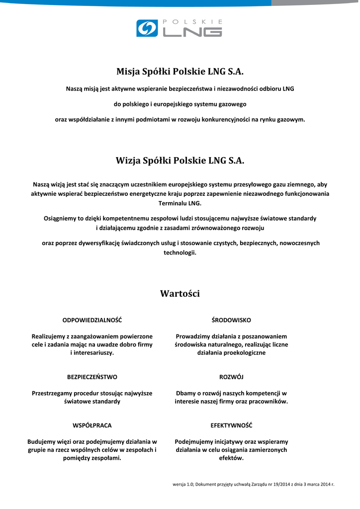 Misja Spółki Polskie LNG S.A. Naszą misją jest aktywne wspieranie bezpieczeństwa i niezawodności odbioru LNG do polskiego i europejskiego systemu gazowego oraz współdziałanie z innymi podmiotami w rozwoju konkurencyjności na rynku gazowym. Wizja Spółki Polskie LNG S.A. Naszą wizją jest stać się znaczącym uczestnikiem europejskiego systemu przesyłowego gazu ziemnego, aby aktywnie wspierać bezpieczeństwo energetyczne kraju poprzez zapewnienie niezawodnego funkcjonowania Terminalu LNG. Osiągniemy to dzięki kompetentnemu zespołowi ludzi stosującemu najwyższe światowe standardy i działającemu zgodnie z zasadami zrównoważonego rozwoju oraz poprzez dywersyfikację świadczonych usług i stosowanie czystych, bezpiecznych, nowoczesnych technologii. Wartości ODPOWIEDZIALNOŚĆ ŚRODOWISKO Realizujemy z zaangażowaniem powierzone cele i zadania mając na uwadze dobro firmy i interesariuszy. Prowadzimy działania z poszanowaniem środowiska naturalnego, realizując liczne działania proekologiczne BEZPIECZEŃSTWO ROZWÓJ Przestrzegamy procedur stosując najwyższe światowe standardy Dbamy o rozwój naszych kompetencji w interesie naszej firmy oraz pracowników. WSPÓŁPRACA EFEKTYWNOŚĆ Budujemy więzi oraz podejmujemy działania w grupie na rzecz wspólnych celów w zespołach i pomiędzy zespołami. Podejmujemy inicjatywy oraz wspieramy działania w celu osiągania zamierzonych efektów. wersja 1.0; Dokument przyjęty uchwałą Zarządu nr 19/2014 z dnia 3 marca 2014 r.
