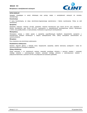 MHA/K 101 Skraplacze z wentylatorami osiowymi OPIS OGÓLNY Agregaty skraplające zewnętrznego. w wersji chłodzącej oraz pompy ciepła, z wentylatorami osiowymi do montażu Konstrukcja Z ramą konstrukcyjną, ze stopu aluminiowo-magnezowego (peralumanu) i blachy ocynkowanej . Śruby ze stali nierdzewnej. Sprężarka Sprężarka rotacyjna 1-fazowa (15÷25), sprężarka 1-fazowa hermetyczna typu Scroll (31-41) oraz sprężarka 3fazowa hermetyczna typu Scroll (51÷131), wyposażona w zabezpieczenie przeciążeniowe (klixon) wbudowane w silnik, oraz grzałkę karteru, w razie potrzeby, montowana na gumowych amortyzatorach . Wentylatory Wentylatory osiowe o zewnętrznymi silnikami wylocie powietrza. niskim sprężu wirnikowymi o o specjalnie wyprofilowanych łopatkach, bezpośrednio sprzężone z stopniu zabezpieczenia IP54, osłony wentylatora zamontowane na Skraplacz Rury miedziane oraz aluminiowe użebrowanie. Rozdzielnica elektryczna Zawiera: włącznik główny z blokadą drzwi, bezpieczniki, sprężarkę, zdalnie sterowany przełącznik i karta do sterowania głównymi funkcjami urządzenia. Obieg chłodniczy Obieg wykonany z rur miedzianych zawiera: presostat wysokiego ciśnienia z ręcznym resetem i presostat niskiego ciśnienia z automatycznym resetem, presostat niskiego ciśnienia z automatycznym resetem i połączenia kielichowe z zaworem (15÷81) lub połączenia do lutowania (çàù0029). Wersja 2.1.3.1 03 grudzień 2014 MHA/K 101 Skraplacze z wentylatorami osiowymi OFERTA: 1 POZYCJA: 1 ILOŚĆ: 1 INFORMACJE OGÓLNE Lato Wydajność chłodzenia kW Wydajność grzania kW Zima 30,9 Pobór mocy sprężarek kW Czynnik chłodniczy Typ R410A Sprężarki Typ Hermetyczna 8,2 Sprężarki / Obiegi chłodnicze Stopnie wydajności n° 1/1 % 0-100 Ilość czynnika chłodniczego kg ESEER IPLV DANE ELEKTRYCZNE Pobór mocy, jednostka kW Pobór prądu jednostki A 28,0 Maks. pobór prądu, jednostka A 29,0 Początkowy prąd rozruchowy, jednostka¹ A 147,0 Napięcie zasilania (zasilanie główne) V/Hz/Ph 400/50/3+N Napięcie zasilania (zasilanie pomocnicze) V/Hz/Ph 230-24/50/1 dB(A) 54 Typ Żebrowane wężownice 9,2 CIŚNIENIE AKUSTYCZNE Sound pressure level at 1 m from the unit (ISO 3744) SEKCJA WENTYLATOROWA (GŁÓWNA) Skraplacz Wentylatory n° Temperatura powietrza zewnętrznego °C 2 35,0 Przepływ powietrza m³/s Zastosowany spręż Pa Pobór mocy kW 1,0 Pobór prądu A 4,8 °C 5,0 Długość x Szerokość x Wysokość mm 1850x1000x1300 Masa transportowa / Masa robocza kg Temperatura parowania 4,6 WYMIARY I MASA Wersja 2.1.3.1 232 / 03 grudzień 2014 MHA/K 101 Skraplacze z wentylatorami osiowymi 1) Przewód ssawny 2) Przewód cieczowy 3) Wolna przestrzeń Wersja 2.1.3.1 03 grudzień 2014