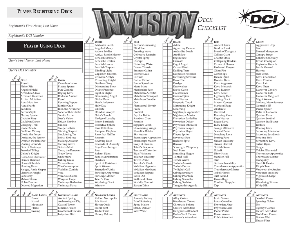 PLAYER REGISTERING DECK Pl ay ed To tal al ed GREEN Aggressive Urge Bind Blurred Mongoose Canopy Surge Elfhame Sanctuary Elvish Champion Explosive Growth Fertile Ground Harrow Jade Leech Kavu Chameleon Kavu Climber Kavu Lair Kavu Titan Llanowar Cavalry Llanowar Elite Llanowar Vanguard Might Weaver Molimo, Maro-Sorcerer Nomadic Elf Pincer Spider Pulse of Llanowar Quirion Elves Quirion Sentinel Quirion Trailblazer Restock Rooting Kavu Saproling Infestation Saproling Symbiosis Scouting Trek Serpentine Kavu Sulam Djinn Tangle Thicket Elemental Thornscape Apprentice Thornscape Master Tranquility Treefolk Healer Utopia Tree Verdeloth the Ancient Verduran Emissary Vigorous Charge Wallop Wandering Stream Whip Silk Pl ay ARTIFACTS Juntu Stakes Lotus Guardian Phyrexian Altar Phyrexian Lens Planar Portal Power Armor Rith’s Attendant ™ To t al ed Pl ay ARTIFACTS Alloy Golem Bloodstone Cameo Chromatic Sphere Crosis’s Attendant Darigaaz’s Attendant Drake-Skull Cameo Dromar’s Attendant RED Ancient Kavu Bend or Break Breath of Darigaaz Callous Giant Chaotic Strike Collapsing Borders Crown of Flames Firebrand Ranger Ghitu Fire Goblin Spy Halam Djinn Hooded Kavu Kavu Aggressor Kavu Monarch Kavu Runner Kavu Scout Lightning Dart Loafing Giant Mages’ Contest Maniacal Rage Obliterate Overload Pouncing Kavu Rage Weaver Rogue Kavu Ruby Leech Savage Offensive Scarred Puma Scorching Lava Searing Rays Shivan Emissary Shivan Harvest Skittish Kavu Skizzik Slimy Kavu Stand or Fall Stun Tectonic Instability Thunderscape Apprentice Thunderscape Master Tribal Flames Turf Wound Urza’s Rage Viashino Grappler Zap To t Pl ay ed To tal ed al SPLIT CARDS Assault/Battery Pain/Suffering Spite/Malice Stand/Deliver Wax/Wane BLACK Addle Agonizing Demise Andradite Leech Annihilate Bog Initiate Cremate Crypt Angel Cursed Flesh Defiling Tears Desperate Research Devouring Strossus Do or Die Dredge Duskwalker Exotic Curse Firescreamer Goham Djinn Hate Weaver Hypnotic Cloud Marauding Knight Mourning Nightscape Apprentice Nightscape Master Phyrexian Battleflies Phyrexian Delver Phyrexian Infiltrator Phyrexian Reaper Phyrexian Slayer Plague Spitter Ravenous Rats Reckless Spite Recover Scavenged Weaponry Soul Burn Spreading Plague Tainted Well Trench Wurm Tsabo’s Assassin Tsabo’s Decree Twilight’s Call Urborg Emissary Urborg Phantom Urborg Shambler Urborg Skeleton Yawgmoth’s Agenda Pl ay al Pl ay ed To tal ed al NONBASIC LANDS Keldon Necropolis Salt Marsh Shivan Oasis Sulfur Vent Tinder Farm Urborg Volcano BLUE Barrin’s Unmaking Blind Seer Breaking Wave Collective Restraint Crystal Spray Disrupt Distorting Wake Dream Thrush Empress Galina Essence Leak Exclude Fact or Fiction Faerie Squadron Mana Maze Manipulate Fate Metathran Aerostat Metathran Transport Metathran Zombie Opt Phantasmal Terrain Probe Prohibit Psychic Battle Rainbow Crow Repulse Sapphire Leech Shimmering Wings Shoreline Raider Sky Weaver Stormscape Apprentice Stormscape Master Sway of Illusion Teferi’s Response Temporal Distortion Tidal Visionary Tolarian Emissary Tower Drake Traveler’s Cloak Vodalian Hypnotist Vodalian Merchant Vodalian Serpent Wash Out Well-Laid Plans Worldly Counsel Zanam Djinn To t NONBASIC LANDS Ancient Spring Archaeological Dig Coastal Tower Elfhame Palace Geothermal Crevice Irrigation Ditch To t al ed ay Pl BASIC LANDS Forest Island Mountain Plains Swamp To t al Ou t To t Pl ay In ed Heroes’ Reunion Horned Cheetah Hunting Kavu Kangee, Aerie Keeper Llanowar Knight Lobotomy Meteor Storm Noble Panther Ordered Migration ay Hanna, Ship’s Navigator ed GOLD Overabundance Plague Spores Pyre Zombie Raging Kavu Reckless Assault Recoil Reviving Vapors Riptide Crab Rith, the Awakener Sabertooth Nishoba Samite Archer Seer’s Vision Shivan Zombie Simoon Sleeper’s Robe Slinking Serpent Smoldering Tar Spinal Embrace Stalking Assassin Sterling Grove Teferi’s Moat Treva, the Renewer Tsabo Tavoc Undermine Urborg Drake Vicious Kavu Vile Consumption Vodalian Zombie Void Voracious Cobra Wings of Hope Yavimaya Barbarian Yavimaya Kavu Pl GOLD Absorb Æther Rift Angelic Shield Armadillo Cloak Armored Guardian Artifact Mutation Aura Mutation Aura Shards Backlash Barrin’s Spite Blazing Specter Captain Sisay Cauldron Dance Charging Troll Cinder Shade Coalition Victory Crosis, the Purger Darigaaz, the Igniter Dromar, the Banisher Dueling Grounds Fires of Yavimaya Frenzied Tilling Galina’s Knight Pl ay ed To tal Pl ay ed To tal User’s DCI Number ay User’s First Name, Last Name WHITE Alabaster Leech Angel of Mercy Ardent Soldier Atalya, Samite Master Benalish Emissary Benalish Heralds Benalish Lancer Benalish Trapper Blinding Light Capashen Unicorn Crimson Acolyte Crusading Knight Death or Glory Dismantling Blow Divine Presence Fight or Flight Glimmering Angel Global Ruin Harsh Judgment Holy Day Liberate Obsidian Acolyte Orim’s Touch Pledge of Loyalty Prison Barricade Protective Sphere Pure Reflection Rampant Elephant Razorfoot Griffin Restrain Reviving Dose Rewards of Diversity Reya Dawnbringer Rout Ruham Djinn Samite Ministration Shackles Spirit of Resistance Spirit Weaver Strength of Unity Sunscape Apprentice Sunscape Master Teferi’s Care Wayfaring Giant Winnow Pl PLAYER USING DECK To t Pl ay ed To tal Registrant’s DCI Number Pl ay ed To tal DECK CHECKLIST Registrant’s First Name, Last Name ARTIFACTS Seashell Cameo Sparring Golem Tek Tigereye Cameo Treva’s Attendant Troll-Horn Cameo Tsabo’s Web Urza’s Filter