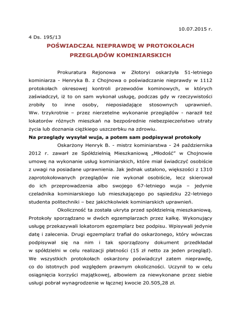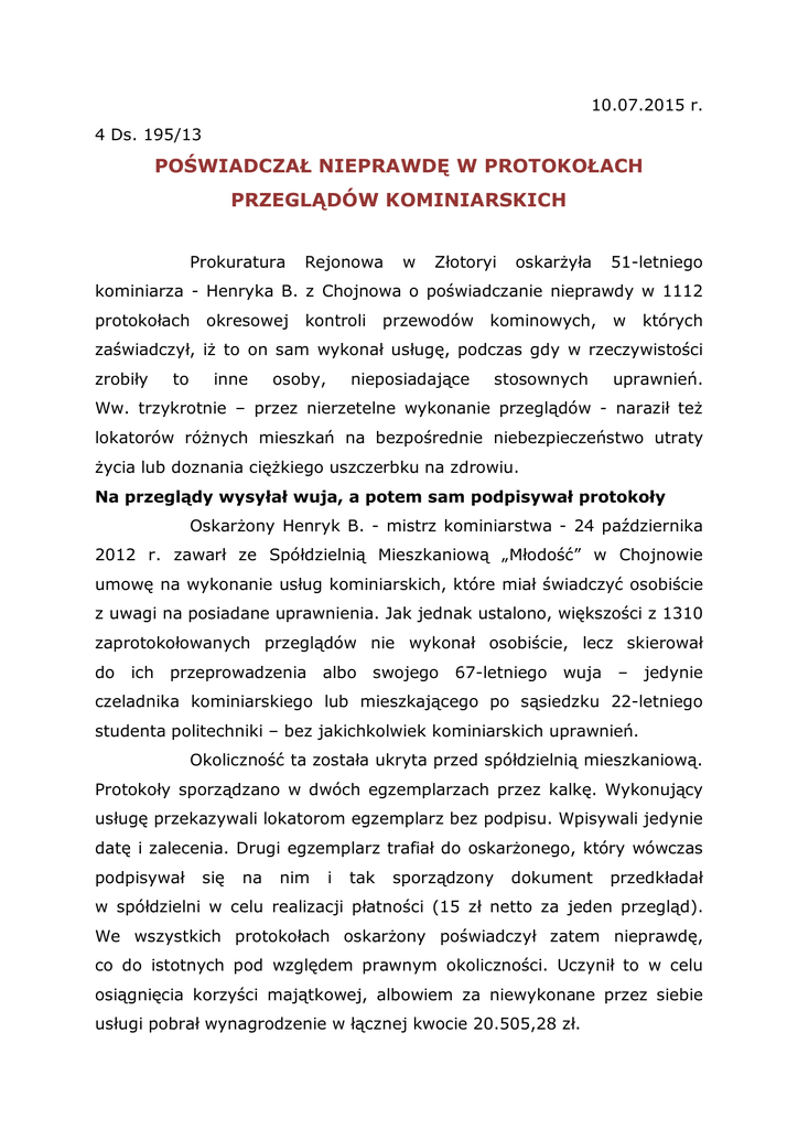 10.07.2015 r. 4 Ds. 195/13 POŚWIADCZAŁ NIEPRAWDĘ W PROTOKOŁACH PRZEGLĄDÓW KOMINIARSKICH Prokuratura Rejonowa w Złotoryi oskarżyła 51-letniego kominiarza - Henryka B. z Chojnowa o poświadczanie nieprawdy w 1112 protokołach okresowej kontroli przewodów kominowych, w których zaświadczył, iż to on sam wykonał usługę, podczas gdy w rzeczywistości zrobiły to inne osoby, nieposiadające stosownych uprawnień. Ww. trzykrotnie – przez nierzetelne wykonanie przeglądów - naraził też lokatorów różnych mieszkań na bezpośrednie niebezpieczeństwo utraty życia lub doznania ciężkiego uszczerbku na zdrowiu. Na przeglądy wysyłał wuja, a potem sam podpisywał protokoły Oskarżony Henryk B. - mistrz kominiarstwa - 24 października 2012 r. zawarł ze Spółdzielnią Mieszkaniową „Młodość” w Chojnowie umowę na wykonanie usług kominiarskich, które miał świadczyć osobiście z uwagi na posiadane uprawnienia. Jak jednak ustalono, większości z 1310 zaprotokołowanych przeglądów nie wykonał osobiście, lecz skierował do ich przeprowadzenia albo swojego 67-letniego wuja – jedynie czeladnika kominiarskiego lub mieszkającego po sąsiedzku 22-letniego studenta politechniki – bez jakichkolwiek kominiarskich uprawnień. Okoliczność ta została ukryta przed spółdzielnią mieszkaniową. Protokoły sporządzano w dwóch egzemplarzach przez kalkę. Wykonujący usługę przekazywali lokatorom egzemplarz bez podpisu. Wpisywali jedynie datę i zalecenia. Drugi egzemplarz trafiał do oskarżonego, który wówczas podpisywał się na nim i tak sporządzony dokument przedkładał w spółdzielni w celu realizacji płatności (15 zł netto za jeden przegląd). We wszystkich protokołach oskarżony poświadczył zatem nieprawdę, co do istotnych pod względem prawnym okoliczności. Uczynił to w celu osiągnięcia korzyści majątkowej, albowiem za niewykonane przez siebie usługi pobrał wynagrodzenie w łącznej kwocie 20.505,28 zł. 2 Lokatorzy narażeni na niebezpieczeństwo Nadto w trzech przypadkach ustalono, że nieprawidłowo przeprowadzone przez nieposiadające uprawnień osoby kontrole kominiarskie naraziły lokatorów mieszkań na niebezpieczeństwo. Pierwszy z nich miał miejsce 19 lutego 2013 r., kiedy to w mieszkaniu położonym przy ul. Piotra Skargi doszło do zatrucia tlenkiem węgla wówczas 21-letniej córki najemców lokalu. Ww. będąc w łazience ogrzewanej piecykiem typu junkers podczas kąpieli zasłabła i upadła na podłogę. Rodzice otworzyli okno i wezwali karetkę. W szpitalu stwierdzono u kobiety stan po omdleniu, powierzchowny uraz głowy oraz podwyższone stężenie tlenku węgla. Po zastosowaniu tlenoterapii kobieta opuściła szpital. Jak ustalono, kontrolę w powyższym mieszkaniu 27 października 2012 r. wykonał wuj oskarżonego. W protokole nie wpisał żadnych zaleceń. Dopiero po zatruciu oskarżony w dniu 19 lutego 2013 r. przeprowadził kontrolę osobiście stwierdzając, iż w łazience zamontowano niewłaściwą kratkę wentylacyjną, która - zdaniem biegłego z zakresu eksploatacji instalacji i urządzeń gazowniczych - ograniczyła skuteczność wentylacji łazienki do wartości 47 %, a skuteczność wentylacji całego lokalu do 27,5%. W dniu 27 października 2012 r. na wniosek innej lokatorki bloku przy ul. Piotra Skargi skarżącej się na dziwne zapachy także wuj oskarżonego dokonał przeglądu instalacji. W protokole nie zawarł jednak żadnych pisemnych zaleceń dla użytkowniczki. Jedynie ustnie wskazał na potrzebę zdemontowania mechanicznego wentylatora w łazience i założenie zwykłej kratki wentylacyjnej. Nie było to - zgodnie z przepisami - wystarczające. Zdaniem biegłego, skuteczność wentylacji łazienki spadła do 46 %, a wentylacji całego lokalu do 18,8%. Stosowanie wentylacji mechanicznej zakłócało wentylację grawitacyjną i odprowadzanie spalin do komina. Stosowne zalecenia winny zatem znaleźć się w protokole. Taki stan rzeczy, narażający lokatorkę na bezpośrednie niebezpieczeństwo 3 utraty życia, obciąża oskarżonego, który winien działać osobiście, a nie zlecać wykonanie przeglądu osobie bez uprawnień. W dniu 1 marca 2015 r. w Złotoryi doszło do zatrucia tlenkiem węgla trojga dorosłych członków rodziny mieszkającej w budynku położonym przy ul. Złotej. Małżonkowie w dniu zdarzenia nastawili na kuchence gazowej obiad. Kobieta nie czuła się dobrze, w związku z czym położyła się w pokoju. Jej mąż doglądał obiadu. W pewnym momencie stracił świadomość. Kiedy się obudził wyłączył palnik pod przypalonymi ziemniakami. Obudził żonę. Kiedy ta weszła do kuchni nagle osunęła się na podłogę i zaczęła wymiotować. Pokrzywdzony zorientował się, że coś jest nie tak i pootwierał wszystkie okna. Obudził też córkę i wezwał pomoc. W szpitalu u wszystkich rozpoznano stan po zatruciu tlenkiem węgla. Z uzyskanej do sprawy opinii biegłego z zakresu eksploatacji instalacji i urządzeń gazowniczych wynika, że w lokalu pokrzywdzonych kontrola wykazana w protokole datowanym na 27 czerwca 2014 r. w ogóle nie została wykonana. W protokole w związku z tym nie wskazano na brak w budynku otworów nawiewnych, wentylacji grawitacyjnej oraz istnienia wentylatorów mechanicznych w łazience i okapach nadkuchennych, co spowodowało pojawienie się w atmosferze lokali tlenku węgla i doprowadziło do zatrucia. Zarzuty Mając postawiono powyższe zarzuty okoliczności poświadczenia na uwadze nieprawdy w Henrykowi B. dokumentach w celu osiągnięcia korzyści majątkowej (art. 271 § 1 i 3 kk) oraz narażenia lokatorów wymienionych wyżej mieszkań na niebezpieczeństwo, co doprowadziło do powstania u nich obrażeń ciała na okres poniżej 7 dni (art. 160 § 1 kk i art. 157 § 2 kk i inne). Oskarżony przesłuchany w charakterze podejrzanego nie przyznał się do popełnienia żadnego z zarzuconych mu czynów i odmówił składania wyjaśnień. He