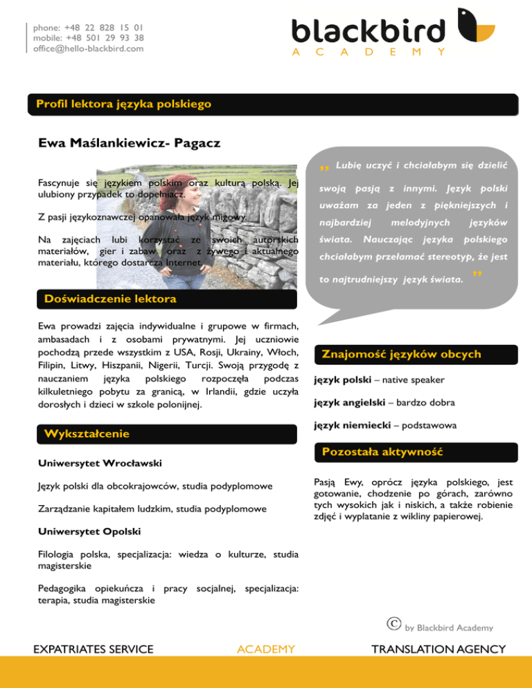 phone: +48 22 828 15 01 mobile: +48 501 29 93 38 [email protected] Profil lektora języka polskiego Ewa Maślankiewicz- Pagacz „ Fascynuje się językiem polskim oraz kulturą polską. Jej ulubiony przypadek to dopełniacz. Z pasji językoznawczej opanowała język migowy. Na zajęciach lubi korzystać ze swoich autorskich materiałów, gier i zabaw oraz z żywego i aktualnego materiału, którego dostarcza Internet. Lubię uczyć i chciałabym się dzielić swoją pasją z innymi. Język polski uważam za jeden z piękniejszych i najbardziej melodyjnych języków świata. Nauczając języka polskiego chciałabym przełamać stereotyp, że jest to najtrudniejszy język świata. ” Doświadczenie lektora Ewa prowadzi zajęcia indywidualne i grupowe w firmach, ambasadach i z osobami prywatnymi. Jej uczniowie pochodzą przede wszystkim z USA, Rosji, Ukrainy, Włoch, Filipin, Litwy, Hiszpanii, Nigerii, Turcji. Swoją przygodę z nauczaniem języka polskiego rozpoczęła podczas kilkuletniego pobytu za granicą, w Irlandii, gdzie uczyła dorosłych i dzieci w szkole polonijnej. Znajomość języków obcych polski – native speaker język polski – native speaker język angielski – bardzo dobra język niemiecki – podstawowa Wykształcenie Pozostała aktywność Uniwersytet Wrocławski Język polski dla obcokrajowców, studia podyplomowe Zarządzanie kapitałem ludzkim, studia podyplomowe Pasją Ewy, oprócz języka polskiego, jest gotowanie, chodzenie po górach, zarówno tych wysokich jak i niskich, a także robienie zdjęć i wyplatanie z wikliny papierowej. Uniwersytet Opolski Filologia polska, specjalizacja: wiedza o kulturze, studia magisterskie Pedagogika opiekuńcza i pracy socjalnej, specjalizacja: terapia, studia magisterskie by Blackbird Academy EXPATRIATES SERVICE ACADEMY TRANSLATION AGENCY