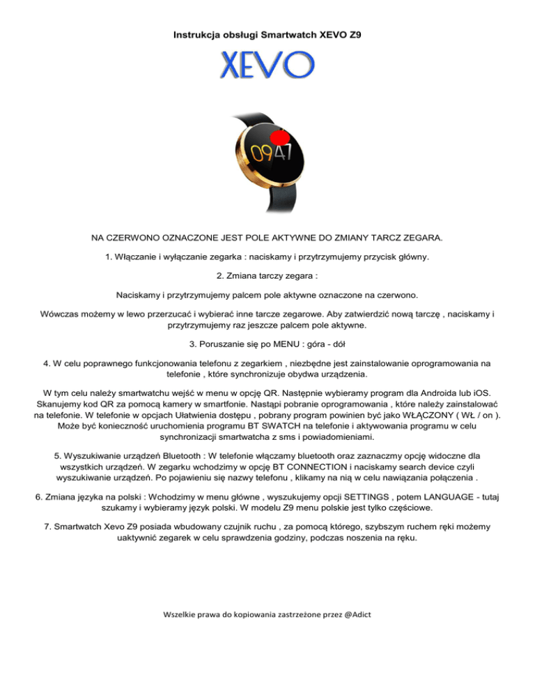 Instrukcja obsługi Smartwatch XEVO Z9 NA CZERWONO OZNACZONE JEST POLE AKTYWNE DO ZMIANY TARCZ ZEGARA. 1. Włączanie i wyłączanie zegarka : naciskamy i przytrzymujemy przycisk główny. 2. Zmiana tarczy zegara : Naciskamy i przytrzymujemy palcem pole aktywne oznaczone na czerwono. Wówczas możemy w lewo przerzucać i wybierać inne tarcze zegarowe. Aby zatwierdzić nową tarczę , naciskamy i przytrzymujemy raz jeszcze palcem pole aktywne. 3. Poruszanie się po MENU : góra - dół 4. W celu poprawnego funkcjonowania telefonu z zegarkiem , niezbędne jest zainstalowanie oprogramowania na telefonie , które synchronizuje obydwa urządzenia. W tym celu należy smartwatchu wejść w menu w opcję QR. Następnie wybieramy program dla Androida lub iOS. Skanujemy kod QR za pomocą kamery w smartfonie. Nastąpi pobranie oprogramowania , które należy zainstalować na telefonie. W telefonie w opcjach Ułatwienia dostępu , pobrany program powinien być jako WŁĄCZONY ( WŁ / on ). Może być konieczność uruchomienia programu BT SWATCH na telefonie i aktywowania programu w celu synchronizacji smartwatcha z sms i powiadomieniami. 5. Wyszukiwanie urządzeń Bluetooth : W telefonie włączamy bluetooth oraz zaznaczmy opcję widoczne dla wszystkich urządzeń. W zegarku wchodzimy w opcję BT CONNECTION i naciskamy search device czyli wyszukiwanie urządzeń. Po pojawieniu się nazwy telefonu , klikamy na nią w celu nawiązania połączenia . 6. Zmiana języka na polski : Wchodzimy w menu główne , wyszukujemy opcji SETTINGS , potem LANGUAGE - tutaj szukamy i wybieramy język polski. W modelu Z9 menu polskie jest tylko częściowe. 7. Smartwatch Xevo Z9 posiada wbudowany czujnik ruchu , za pomocą którego, szybszym ruchem ręki możemy uaktywnić zegarek w celu sprawdzenia godziny, podczas noszenia na ręku. Wszelkie prawa do kopiowania zastrzeżone przez @Adict
