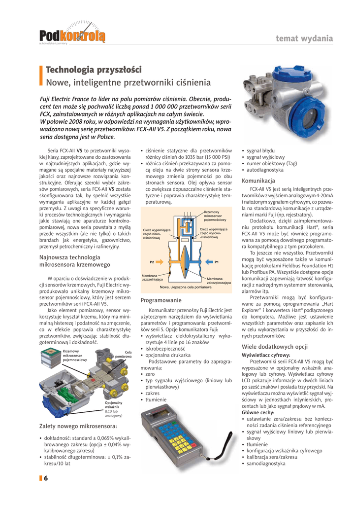 temat wydania Technologia przyszłości Nowe, inteligentne przetworniki ciśnienia Fuji Electric France to lider na polu pomiarów ciśnienia. Obecnie, producent ten może się pochwalić liczbą ponad 1 000 000 przetworników serii FCX, zainstalowanych w różnych aplikacjach na całym świecie. W połowie 2008 roku, w odpowiedzi na wymagania użytkowników, wprowadzono nową serię przetworników: FCX-AII V5. Z początkiem roku, nowa seria dostępna jest w Polsce. Seria FCX-AII V5 to przetworniki wysokiej klasy, zaprojektowane do zastosowania w najtrudniejszych aplikacjach, gdzie wymagane są specjalne materiały najwyższej jakości oraz najnowsze rozwiązania konstrukcyjne. Oferując szeroki wybór zakresów pomiarowych, seria FCX-AII V5 została skonfigurowana tak, by spełnić wszystkie wymagania aplikacyjne w każdej gałęzi przemysłu. Z uwagi na specyficzne warunki procesów technologicznych i wymagania jakie stawiają one aparaturze kontrolnopomiarowej, nowa seria powstała z myślą przede wszystkim (ale nie tylko) o takich branżach jak energetyka, gazownictwo, przemysł petrochemiczny i rafineryjny. Najnowsza technologia mikrosensora krzemowego Cela pomiarowa Opcjonalny wskaźnik (LCD lub analogowy) Zalety nowego mikrosensora: • dokładność: standard ± 0,065% wykalibrowanego zakresu (opcja ± 0,04% wykalibrowanego zakresu) • stabilność długoterminowa: ± 0,1% zakresu/10 lat 6 Krzemowy mikrosensor pojemnościowy Ciecz wypełniająca część niskociśnieniową Ciecz wypełniająca część wysoko-ciśnieniową P2 W oparciu o doświadczenie w produkcji sensorów krzemowych, Fuji Electric wyprodukowało unikalny krzemowy mikrosensor pojemnościowy, który jest sercem przetworników serii FCX-AII V5. Jako element pomiarowy, sensor wykorzystuje kryształ krzemu, który ma minimalną histerezę i podatność na zmęczenie, co w efekcie poprawia charakterystykę przetworników, zwiększając stabilność długoterminową i dokładność. Krzemowy mikrosensor pojemnosciowy • ciśnienie statyczne dla przetworników różnicy ciśnień do 1035 bar (15 000 PSI) • różnica ciśnień przekazywana za pomocą oleju na dwie strony sensora krzemowego zmienia pojemności po obu stronach sensora. Olej opływa sensor co zwiększa dopuszczalne ciśnienie statyczne i poprawia charakterystykę temperaturową. P1 Membrana uszczelniająca Membrana zabezpieczająca Nowa, ulepszona cela pomiarowa Programowanie Komunikator przenośny Fuji Electric jest użytecznym narzędziem do wyświetlania parametrów i programowania przetworników serii 5. Opcje komunikatora Fuji: • wyświetlacz ciekłokrystaliczny wykorzystuje 4 linie po 16 znaków • iskrobezpieczność • opcjonalna drukarka Podstawowe parametry do zaprogramowania: • zero • typ sygnału wyjściowego (liniowy lub pierwiastkowy) • zakres • tłumienie • • • • sygnał błędu sygnał wyjściowy numer obiektowy (Tag) autodiagnostyka Komunikacja FCX-AII V5 jest serią inteligentnych przetworników z wyjściem analogowym 4-20mA i nałożonym sygnałem cyfrowym, co pozwala na standardową komunikacje z urządzeniami marki Fuji (np. rejestratory). Dodatkowo, dzięki zaimplementowaniu protokołu komunikacji Hart®, seria FCX-AII V5 może być również programowana za pomocą dowolnego programatora kompatybilnego z tym protokołem. To jeszcze nie wszystko. Przetworniki mogą być wyposażone także w komunikację protokołami Fieldbus Foundation H1 lub Profibus PA. Wszystkie dostępne opcje komunikacji zapewniają łatwość konfiguracji z nadrzędnym systemem sterowania, alarmów itp. Przetworniki mogą być konfigurowane za pomocą oprogramowania „Hart Explorer” i konwertera Hart® podłączonego do komputera. Możliwe jest ustawienie wszystkich parametrów oraz zapisanie ich w celu wykorzystania w przyszłości do innych przetworników. Wiele dodatkowych opcji Wyświetlacz cyfrowy: Przetworniki serii FCX-AII V5 mogą być wyposażone w opcjonalny wskaźnik analogowy lub cyfrowy. Wyświetlacz cyfrowy LCD pokazuje informacje w dwóch liniach po sześć znaków i posiada trzy przyciski. Na wyświetlaczu można wyświetlić sygnał wyjściowy w jednostkach inżynierskich, procentach lub jako sygnał prądowy w mA. Główne cechy: • ustawianie zera/zakresu bez konieczności zadania ciśnienia referencyjnego • sygnał wyjściowy liniowy lub pierwiaskowy • tłumienie • konfiguracja wskaźnika cyfrowego • kalibracja zera/zakresu • samodiagnostyka temat wydania błędu, kierunek sygnału błędu na wyjściu przetwornika może być określony jako poniżej zakresu „down scaled” (3,2 do 4 mA) lub powyżej zakresu „up scaled” (20 do 22,5 mA) i może być w tych granicach programowany. Dzięki tej funkcji, nowa seria spełnia wymagania NAMUR NE 43. Obsługa: Parametry kalibracyjne są zapisane w przetworniku, co pozwala w każdej chwili powrócić do nastaw fabrycznych. Minimalna i maksymalna temperatura zapisana jest w pamięci i można je wyświetlić na wyświetlaczu przetwornika lub komunikatora. Wszystkie parametry i funkcje programowalne mogą być zabezpieczone za pomocą hasła (zewnętrzna śruba kalibracyjna jest także zabezpieczona). • kalibracja pętli prądowej • kierunek i wartość sygnału błędu. Przełącznik - Wyświetlane wartości procesu Przełącznik + Przełącznik trybu Jednostki inżynierskie Wartość sygnału błędu: Na wyjściu przetwornika można wystawić specyficzną wartość w przypadku błędu/awarii. Standardowe wartości sygnału to 3,2 do 22,5 mA. W przypadku Na zakończenie Podsumowując należy zaznaczyć, że podstawową zaletą piątej serii przetworników FUJI jest najnowsza technologia mikrosensora krzemowego, zapewniająca wysoką dokładność i wydłużoną stabliność. Producent zadbał także o funkcjonalność, czytelność i intuicyjność obsługi nowych przetworników. Dzięki temu, seria V5 świetnie sprawdza się w aplikacjach gdzie istotna jes