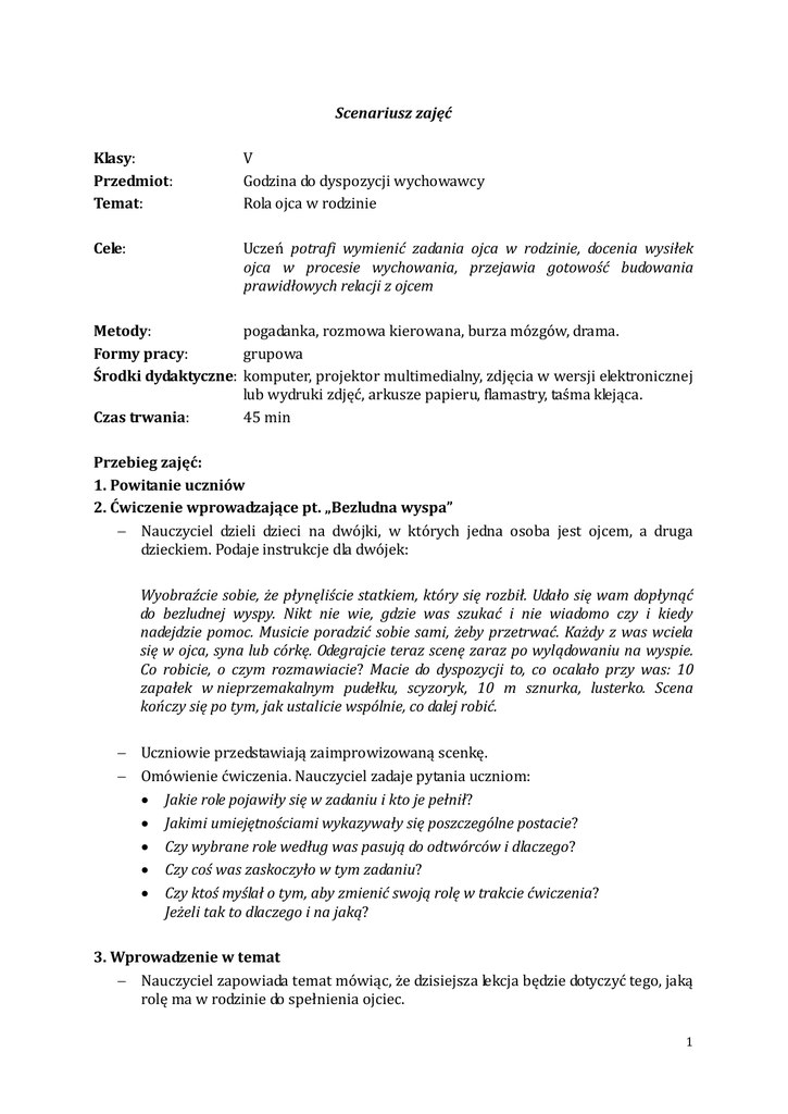 Scenariusz zajęć Klasy: Przedmiot: Temat: V Godzina do dyspozycji wychowawcy Rola ojca w rodzinie Cele: Uczeń potrafi wymienić zadania ojca w rodzinie, docenia wysiłek ojca w procesie wychowania, przejawia gotowość budowania prawidłowych relacji z ojcem Metody: pogadanka, rozmowa kierowana, burza mózgów, drama. Formy pracy: grupowa Środki dydaktyczne: komputer, projektor multimedialny, zdjęcia w wersji elektronicznej lub wydruki zdjęć, arkusze papieru, flamastry, taśma klejąca. Czas trwania: 45 min Przebieg zajęć: 1. Powitanie uczniów 2. Ćwiczenie wprowadzające pt. „Bezludna wyspa” Nauczyciel dzieli dzieci na dwójki, w których jedna osoba jest ojcem, a druga dzieckiem. Podaje instrukcje dla dwójek: Wyobraźcie sobie, że płynęliście statkiem, który się rozbił. Udało się wam dopłynąć do bezludnej wyspy. Nikt nie wie, gdzie was szukać i nie wiadomo czy i kiedy nadejdzie pomoc. Musicie poradzić sobie sami, żeby przetrwać. Każdy z was wciela się w ojca, syna lub córkę. Odegrajcie teraz scenę zaraz po wylądowaniu na wyspie. Co robicie, o czym rozmawiacie? Macie do dyspozycji to, co ocalało przy was: 10 zapałek w nieprzemakalnym pudełku, scyzoryk, 10 m sznurka, lusterko. Scena kończy się po tym, jak ustalicie wspólnie, co dalej robić. Uczniowie przedstawiają zaimprowizowaną scenkę. Omówienie ćwiczenia. Nauczyciel zadaje pytania uczniom: Jakie role pojawiły się w zadaniu i kto je pełnił? Jakimi umiejętnościami wykazywały się poszczególne postacie? Czy wybrane role według was pasują do odtwórców i dlaczego? Czy coś was zaskoczyło w tym zadaniu? Czy ktoś myślał o tym, aby zmienić swoją rolę w trakcie ćwiczenia? Jeżeli tak to dlaczego i na jaką? 3. Wprowadzenie w temat Nauczyciel zapowiada temat mówiąc, że dzisiejsza lekcja będzie dotyczyć tego, jaką rolę ma w rodzinie do spełnienia ojciec. 1 Nauczyciel pisze na tablicy w centralnej części słowo „ojciec” i pyta uczniów: Co Wam się kojarzy ze słowem „ojciec”? Uczniowie podają swoje skojarzenia, a nauczyciel zapisuje je na tablicy wokół słowa-klucza. Nauczyciel mówi o tym, że każdy ma swojego tatę, choć nie zawsze jest tak, że wszystkie dzieci mają możliwość mieszkania razem z tatą, bywa, że taty nie ma w domu bo wyjechał, pracuje gdzieś daleko lub nie żyje. Niezależnie od tego, jakiego mamy tatę, każdy z nas zawdzięcza mu to, co najważniejsze – życie. Zaznacza, że nie wszyscy ojcowie radzą sobie w wypełnianiu pewnych zadań i muszą się tego uczyć. Wspomina, że czasami rolę taty wypełnia w rodzinie ktoś inny – ojczym, wujek, dziadek. 4. Rozwinięcie tematu Nauczyciel wyświetla zdjęcia, które wskazują zadania, wypełniane przez ojca w rodzinie. Uczniowie mają odgadnąć, w jaki sposób zdjęcie wiąże się z tą rolą. a) Pierwszy obraz: latarnia morska. Pytania do obrazu: Co przedstawia zdjęcie? Do czego służą latarnie morskie? Jeśli jest taka potrzeba, naprowadza uczniów na właściwą odpowiedź: latarnie nocą i we mgle wskazują drogę okrętom, ostrzegają przed skałami, niebezpiecznymi częściami brzegu. Mówi, że każdy ojciec ma w rodzinie do spełnienia zadanie podobne do latarni morskiej. Pyta uczniów, jak sądzą – na czym polega to zadanie. Uczniowie powinni dojść do wniosku, że ojciec chroni dzieci, ostrzegając przed różnymi niebezpieczeństwami, przed konsekwencjami niewłaściwych wyborów, powinien wskazywać i dawać osobisty przykład jak należy się zachowywać w konkretnych sytuacjach życiowych, które wybory są słuszne, a które nie oraz jakie są tego konsekwencje. b) Drugi obraz: parasol. Pytania do obrazu: Co przedstawia zdjęcie? Do czego służy parasol? Następnie mówi, że każdy ojciec ma w rodzinie do spełnienia zadanie podobne do parasola. Pyta uczniów, jak sądzą, na czym polega to zadanie. Jeśli jest taka potrzeba naprowadza uczniów na właściwą odpowiedź: ojciec powinien chronić rodzinę przed niebezpieczeństwami, tak jak parasol chroni przed deszczem lub przed zbyt mocnym słońcem. 2 Nauczyciel zadaje pytanie: Przed jakimi niebezpieczeństwami może swoje dzieci ochronić ojciec? Spodziewane odpowiedzi: sytuacja napadu, wojny, zagrożenia życia itp. Nauczyciel naprowadza uczniów na inne odpowiedzi: niezaspokojone potrzeby psychiczne dziecka (miłości, akceptacji, uznania, szacunku), niebezpieczeństwa finansowe (brak pieniędzy na jedzenie, ubranie i inne codzienne potrzeby), moralne (nieprawidłowy system wartości, niewłaściwie ustalone priorytety i cele życiowe, podatność na presję i manipulację ze strony grupy rówieśniczej i in.) c) Trzeci obraz: świeca. Pytania do obrazu: Co przedstawia zdjęcie? Do czego służy świeca? Kiedy zapalamy świece? (oczekiwane odpowiedzi: gdy jest ciemno, gdy zabraknie prądu) Jak czuje się człowiek, który nagle znajdzie się w ciemności? (oczekiwane odpowiedzi: odczuwa niepokój, boi się), Jak czuje się człowiek po zapaleniu świecy? (oczekiwane odpowiedzi: uspokaja się, czuje się bezpiecznie). Nauczyciel mówi, że zadanie ojca w rodzinie jest podobne do zadania świecy i pyta uczniów na czym ono może polegać. Oczekiwane odpowiedzi: daje poczucie bezpieczeństwa, pociesza gdy jest smutno, wspiera, umacnia, dodaje odwagi i pewności siebie. d) Czwarty obraz: ogrodzone pastwisko, na którym pasą się owce. Pytania do obrazu: Co przedstawia zdjęcie? W jakim celu stosuje się ogrodzenie na pastwiskach? Nauczyciel powinien pokierować uczniami tak by sami doszli do wniosku, że ogrodzenie z jednej strony ogranicza teren na którym mogą poruszać się owce, ale z drugiej strony wyznacza też im bezpieczne granice, chroni przed dzikimi zwierzętami, przed niebezpieczeństwami, przed własną bezmyślnością i nieodpowiedzialnością itp. Ograniczenie służy ich dobru, bezpieczeństwu. Nauczyciel mówi, że zadanie ojca w rodzinie jest podobne do zadania ogrodzenia na pastw