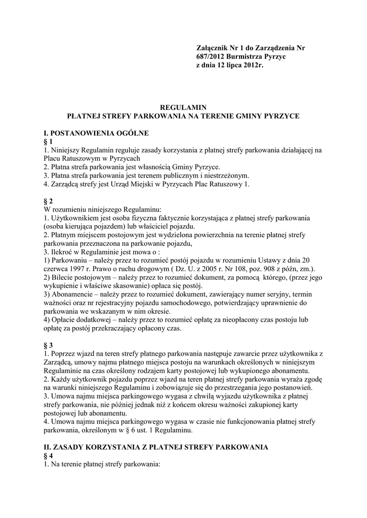 Załącznik Nr 1 do Zarządzenia Nr 687/2012 Burmistrza Pyrzyc z dnia 12 lipca 2012r. REGULAMIN PŁATNEJ STREFY PARKOWANIA NA TERENIE GMINY PYRZYCE I. POSTANOWIENIA OGÓLNE §1 1. Niniejszy Regulamin reguluje zasady korzystania z płatnej strefy parkowania działającej na Placu Ratuszowym w Pyrzycach 2. Płatna strefa parkowania jest własnością Gminy Pyrzyce. 3. Płatna strefa parkowania jest terenem publicznym i niestrzeżonym. 4. Zarządcą strefy jest Urząd Miejski w Pyrzycach Plac Ratuszowy 1. §2 W rozumieniu niniejszego Regulaminu: 1. Użytkownikiem jest osoba fizyczna faktycznie korzystająca z płatnej strefy parkowania (osoba kierująca pojazdem) lub właściciel pojazdu. 2. Płatnym miejscem postojowym jest wydzielona powierzchnia na terenie płatnej strefy parkowania przeznaczona na parkowanie pojazdu, 3. Ilekroć w Regulaminie jest mowa o : 1) Parkowaniu – należy przez to rozumieć postój pojazdu w rozumieniu Ustawy z dnia 20 czerwca 1997 r. Prawo o ruchu drogowym ( Dz. U. z 2005 r. Nr 108, poz. 908 z późn, zm.). 2) Bilecie postojowym – należy przez to rozumieć dokument, za pomocą którego, (przez jego wykupienie i właściwe skasowanie) opłaca się postój. 3) Abonamencie – należy przez to rozumieć dokument, zawierający numer seryjny, termin ważności oraz nr rejestracyjny pojazdu samochodowego, potwierdzający uprawnienie do parkowania we wskazanym w nim okresie. 4) Opłacie dodatkowej – należy przez to rozumieć opłatę za nieopłacony czas postoju lub opłatę za postój przekraczający opłacony czas. §3 1. Poprzez wjazd na teren strefy płatnego parkowania następuje zawarcie przez użytkownika z Zarządcą, umowy najmu płatnego miejsca postoju na warunkach określonych w niniejszym Regulaminie na czas określony rodzajem karty postojowej lub wykupionego abonamentu. 2. Każdy użytkownik pojazdu poprzez wjazd na teren płatnej strefy parkowania wyraża zgodę na warunki niniejszego Regulaminu i zobowiązuje się do przestrzegania jego postanowień. 3. Umowa najmu miejsca parkingowego wygasa z chwilą wyjazdu użytkownika z płatnej strefy parkowania, nie później jednak niż z końcem okresu ważności zakupionej karty postojowej lub abonamentu. 4. Umowa najmu miejsca parkingowego wygasa w czasie nie funkcjonowania płatnej strefy parkowania, określonym w § 6 ust. 1 Regulaminu. II. ZASADY KORZYSTANIA Z PŁATNEJ STREFY PARKOWANIA §4 1. Na terenie płatnej strefy parkowania: 1) obowiązują zasady ruchu pojazdów zawarte w ustawie z dnia 20 czerwca 1997r. Prawo o ruchu drogowym (Dz. U. z 2005 r. Nr 108, poz. 908 ze zm.); 2) zabronione jest parkowanie pojazdów poza miejscami wyznaczonymi do parkowania; 3) obowiązuje bezwzględny zakaz wjazdu: a) pojazdów przewożących materiały łatwopalne, żrące, wybuchowe oraz inne podobne materiały i substancje mogące stworzyć zagrożenie dla osób i mienia; b) pojazdów pełniących funkcje obwoźnych sklepów, jeśli ich celem byłoby prowadzenie działalności handlowej. 2. Pojazd po ustawieniu na miejscu parkingowym powinien być unieruchomiony, mieć wyłączony zapłon, światła, zamknięte okna, drzwi oraz bagażnik. Użytkownik zobowiązany jest do wyłączenia pozostawionych w pojeździe urządzeń radiofonicznych. 3. W czasie postoju na miejscu parkingowym zabronione jest pozostawianie w pojeździe zwierząt. 4. Użytkownik we własnym zakresie zabezpiecza swój pojazd przed kradzieżą. 5. Na jednym miejscu parkingowym wyznaczonym dla samochodów osobowych dozwolone jest parkowanie dwóch motocykli. §5 1. Zarządca nie ponosi odpowiedzialności za jakiekolwiek szkody powstałe w wyniku siły wyższej, żywiołów, kradzieży (włamania, rozboju itp.), zniszczenia lub uszkodzenia pojazdów znajdujących się na terenie płatnej strefy parkowania, jak również rzeczy w nich pozostawionych lub stanowiących ich wyposażenie. 2. Wyłącza się odpowiedzialność Zarządcy z tytułu szkód komunikacyjnych i parkingowych dotyczących pojazdów i osób korzystających z płatnej strefy parkowania. §6 1. Opłatę za parkowanie pobiera się w dni robocze, od poniedziałku do piątku, w godzinach od 7.00 – 15.00. 2. Poza okresami wymienionymi w ust. 1 opłat nie pobiera się. §7 Na terenie płatnej strefy parkowania zabrania się: 1. Spożywania alkoholu, 2. Zaśmiecania, 3. Niszczenia urządzeń, 4. Naprawiania pojazdów, 5. Mycia i odkurzania pojazdów, 6. Tankowania pojazdów, 7. Używania otwartego ognia, 8. Parkowania pojazdów z nieszczelnymi układami powodującymi wycieki, 9. Wymiany lub uzupełniania płynów w pojazdach - cieczy chłodzącej, oleju itp., 10. Magazynowania paliw, substancji łatwopalnych i pustych pojemników po paliwie, 11. Działania niezgodnego z przepisami BHP i PPOŻ, 12. Zachowania sprzecznego z zasadami współżycia społecznego lub zakłócającego korzystania z płatnej strefy parkowania. §8 1. W przypadku naruszenia przez użytkownika postanowień niniejszego Regulaminu Zarządca może rozwiązać umowę najmu miejsca parkingowego w trybie natychmiastowym 2 oraz zastosować środki niezbędne dla przywrócenia stanu zgodnego z Regulaminem, w tym również poprzez usunięcie pojazdu z płatnej strefy parkowania. 2. W przypadkach określonych w ust. 1 użytkownik zobowiązany jest do pokrycia kosztów związanych z usunięciem pojazdu z płatnej strefy parkowania oraz jego zabezpieczeniem i przechowaniem do czasu odbioru pojazdu przez użytkownika. 3. Użytkownik ponosi odpowiedzialność za wszelkie szkody spowodowane przez pojazd lub powstałe w związku z korzystaniem z miejsca parkingowego, w szczególności z tytułu zanieczyszczenia powierzchni parkingowej na skutek wycieku płynów z pojazdu (wyciek oleju, płynu hamulcowego, płynu chłodniczego itp.). §9 Zakazane jest parkowanie pojazdów samochodowych na miejscach parkingowych przeznaczonych dla osób niepełnosprawnych innym osobom niż użytkownikom pojazdów, o których mowa w art. 8 Ust