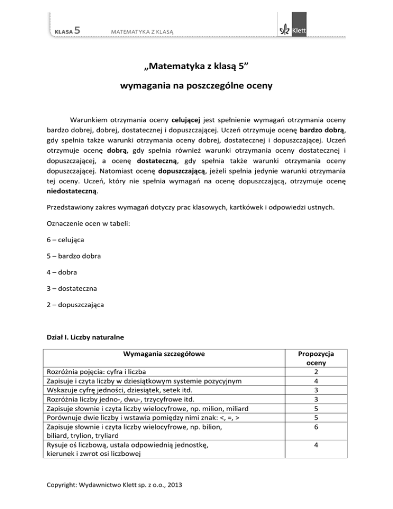 „Matematyka z klasą 5” wymagania na poszczególne oceny