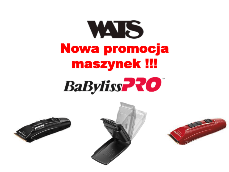 Nowa promocja maszynek !!! Promocyjny zestaw 2 maszynek super maszynka Volare z silnikiem Ferrari + profesjonalny trymer podróżny Babyliss Pro FX 37E - gratis !!! Super maszynka Volare X2 z silnikiem Ferrari w cenie 799,00 zł brutto + trymer FX 37E o wartości 149,00 zł brutto GRATIS !!! Maszynka profesjonalna Volare X2 Ferrari Challenge • profesjonalna maszynka przewodowo–bezprzewodowa z silnikiem Ferrari • akumulator litowo–polimerowy • 4–stopniowy, diodowy wskaźnik naładowania • pełne naładowanie w 3 godziny • 8 nakładek dystansowych • regulacja wysokości strzyżenia 0,8÷2,0 mm • czas pracy bez ładowania do 3 godzin • 6.300 ruchów ostrza na minutę • ergonomiczny kształt Cena 799 zł * FX 811 E (czarna) * FX 811 RE (czerwona) Maszynka podróżna - trymer FX 37E Przeznaczona do precyzyjnego przycinania włosów przy skórze głowy, na szyi oraz zarostu i baczków • • • • • • • włącza się samoczynnie po otwarciu wytrzymałe ostrze ze stali nierdzewnej wykonane w technologii MIM (Metal Injection Molding) tytanowa obudowa ściągana nakładka, regulowany grzebień silniczek na baterię AAA (2szt.) ergonomiczny kształt w opakowaniu: 2 baterie AAA, pędzelek do czyszczenia, olejek do konserwacji Cena 149 zł Dystrybutor: WATS Sp. z o.o. Mysłowice ul. Obrzeżna Płn. 15 C Tel. (32) 222 60 57; (32) 223 42 42 www.wats.pl