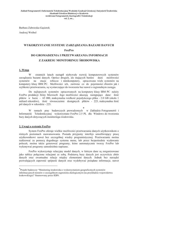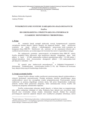 Zakáad Fotogrametrii i Informatyki Teledetekcyjnej Wydziaáu Geodezji Górniczej i InĪynierii ĝrodowiska Akademii Górniczo-Hutniczej w Krakowie Archiwum Fotogrametrii, Kartografii i Teledetekcji vol. 2, str... Barbara Zabrzeska-Gąsiorek Andrzej Wróbel WYKORZYSTANIE SYSTEMU ZARZĄDZANIA BAZAMI DANYCH FoxPro DO GROMADZENIA I PRZETWARZANIA INFORMACJI Z ZAKRESU MONITORINGU ĝRODOWISKA 1. WstĊp W ostatnich latach nastąpiá niebywaáy rozwój komputerowych systemów zarządzania bazami danych. Oprócz drogich, ale mających bardzo duĪe moĪliwoĞci systemów na stacje robocze i minikomputery, opracowano wiele systemów na komputery klasy IBM PC. MoĪliwoĞci ich, zarówno co do pojemnoĞci zbiorów jak i szybkoĞci przetwarzania, są wystarczające do tworzenia baz nawet o regionalnym zasiĊgu. Do najlepszych systemów opracowanych na komputery klasy IBM PC naleĪy FoxPro produkcji firmy Microsoft. Jego moĪliwoĞci ukazują nastĊpujące dane: iloĞü plików w bazie - 65 000, maksymalna wielkoĞü pojedyĔczego pliku - 2.0 GB (okoáo 1 miliard rekordów), iloĞü równoczeĞnie dostĊpnych plików - 225, maksymalna iloĞü pól danych w rekordzie - 225. W ramach prac badawczych prowadzonych w Zakáadzie Fotogrametrii i Informatyki Teledetekcyjnej wykorzystano FoxPro 2.5 PL dla Windows do tworzenia bazy danych dotyczących monitoringu Ğrodowiska. 2. Uwagi o systemie FoxPro System FoxPro oferuje wielkie moĪliwoĞci przetwarzania danych uĪytkownikom o róĪnych poziomach zaawansowania. Posiada przyjazny interfejs umoĪliwiający pracĊ uĪytkownikowi nawet bez szczególnej wiedzy programistycznej. Przetwarzanie moĪna realizowaü za pomocą dogodnego systemu menu, lub przez bezpoĞrednie wydawanie poleceĔ, moĪna takĪe generowaü programy, które automatycznie tworzy FoxPro lub wykonywaü programy samodzielnie napisane. FoxPro wykorzystuje relacyjny model danych, w którym dane są zorganizowane jako tablice poáączone relacjami ze sobą. Podstawą bazy danych jest oczywiĞcie zbiór danych oraz ewentualne relacje miĊdzy elementami danych. Jednak bez narzĊdzi pozwalających zapewniü spójnoĞü danych oraz wydobywaü poĪądane informacje, nawet Projekt badawczy “Monitoring Ğrodowiska z wykorzystaniem geograficznych systemów informacyjnych terenów o szczególnym zagroĪeniu ekologicznym (na przykáadzie województwa krakowskiego)” finansowany przez KBN. 2 Barbara Zabrzeska-Gąsiorek, Andrzej Wróbel najbardziej wartoĞciowe dane byáy by maáo uĪyteczne. FoxPro oferuje moĪliwoĞü przetwarzania danych w spójnym Ğrodowisku poprzez dogodne narzĊdzia. NarzĊdzia te tworzą elementy skáadowe systemu. MoĪna je wykorzystywaü opcjonalnie, zgodnie z zapotrzebowaniem projektującego bazĊ danych. NajwaĪniejsze elementy, które umoĪliwiają i uáatwiają przetwarzanie to : x Generowanie zapytaĔ, które są doskonaáym narzĊdziem do szybkiego i efektywnego wyszukiwania informacji. Mogą one dotyczyü pojedynczej tabeli danych, a takĪe wielu plików dla których zdefiniuje siĊ warunki áączenia. Tworzenie zapytaĔ jest realizowane w bardzo przyjaznej dla uĪytkownika formie. System niejako podpowiada poszczególne kroki : warunki áączenia plików, warunki definiujące kryteria wyboru przy wyszukiwaniu, wybór pól danych, które mają zostaü zwrócone w wyniku wyszukiwania, sposób ich uporządkowania i grupowania oraz obliczenia jakie bĊdą wykonywane na zgromadzonych danych. MoĪna takĪe okreĞliü przeznaczenie informacji wynikowych : prezentacja na ekranie, zapis do pliku czy teĪ utworzenie raportu. x Makrodefinicje, dziĊki którym unika siĊ powtarzania tych samych czynnoĞci, poniewaĪ moĪna je wykorzystaü do automatycznego generowania komend. Przez naciĞniĊcie jednego lub kombinacji kilku klawiszy moĪna uruchomiü pewne komendy (np. komendy edytora, polecenia FoxPro), wywoáywaü okreĞlone dane lub wprowadzaü powtarzające siĊ dane do kolejnych rekordów. x Generator ekranów uáatwiający dostosowanie FoxPro do konkretnego rozwiązywanego zagadnienia i przez to uáatwienie pracy nawet zupeánie nie znającym siĊ na informatyce uĪytkownikom. Kryje on w sobie ogromne moĪliwoĞci. Pozwala na projektowanie ekranów zawierających pola bazy danych, pola tekstu, grafikĊ, okna. MoĪna takĪe do wáasnego ekranu wáączyü funkcje interfejsu FoxPro. Zbudowany ekran moĪe np. zawieraü przyciski opcji, pola wyboru, pole menu, listy przewijane, które realizują te same funkcje jak w standardowych ekranach FoxPro. Wprowadzając odpowiednio skonstruowane funkcje kontrolne moĪna zapewniü integralnoĞü i dokáadnoĞü wprowadzanych danych. x Edytor raportów jest kolejnym waĪnym narzĊdziem, które oferuje FoxPro. Pozwala on na tworzenie profesjonalnych raportów przy maáym nakáadzie pracy. Raport jest elementem niezbĊdnym w pracy z duĪymi iloĞciami informacji. Forma raportu, który moĪna zdefiniowaü w systemie jest w zasadzie dowolna, zaleĪy od zadeklarowania przez uĪytkownika. Oprócz wybranych z tabeli pól, raport moĪe zawieraü takie elementy jak : tytuá, nagáówki, dowolny tekst, rysunki, obrazy, wykresy, wyniki obliczeĔ na danych przechowywanych w bazie (np. wartoĞci Ğrednie, sumy, wartoĞci maksymalne, itp.). DuĪą zaletą raportu jest moĪliwoĞü wielokrotnego uĪycia. Np. raport o zanieczyszczeniach Ğrodowiska w danym miesiącu wystarczy tylko uruchomiü dla danych z innego miesiąca aby od razu otrzymaü wyniki. Wydruk bĊdzie zawsze podobny; taką dokumentacjĊ áatwo póĨniej porównywaü i analizowaü. x Wáasne menu, które bĊdzie zawieraáo tylko to co uĪytkownik potrzebuje do wáasnych zadaĔ, podobnie jak wáasny ekran uáatwia dostosowanie FoxPro do konkretnej aplikacji. MoĪliwe jest doáączanie wybranych opcji z menu systemowego oraz utworzenie dodatkowych opcji pozwalających na realizacjĊ szczególnych operacji przetwarzania danych. Np. przy czĊstym drukowaniu róĪnych raportów korzystne jest doáącz
