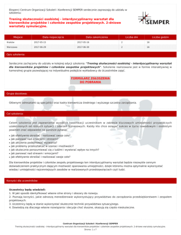 Eksperci Centrum Organizacji Szkoleń i Konferencji SEMPER serdecznie zapraszają do udziału w szkoleniu: Trening skuteczności osobistej - interdyscyplinarny warsztat dla kierowników projektów i członków zespołów projektowych. 2-dniowe warsztaty symulacyjne. Miejsce Data rozpoczęcia Data zakończenia Liczba dni Liczba godzin Kraków 2017-05-15 2017-05-16 2 16 Warszawa 2017-06-29 2017-06-30 2 16 Opis szkolenia: Serdecznie zachęcamy do udziału w kolejnej edycji szkolenia: "Trening skuteczności osobistej - interdyscyplinarny warsztat dla kierowników projektów i członków zespołów projektowych". Szkolenie realizowane jest w formie interaktywnej w kameralnej grupie pozwalającej na indywidualne podejście wykładowcy do Uczestników zajęć. FORMULARZ ZGŁOSZENIA DO POBRANIA Grupa docelowa: Głównymi adresatami są specjaliści oraz kadra kierownicza średniego i wyższego szczebla zarządzania. Cel szkolenia: Celem szkolenia jest zapewnienie wysokich kwalifikacji uczestnikom w zakresie kluczowych umiejętności przywódczych uzależnionych od różnych sytuacji i zdarzeń biznesowych. Każdy kto chce osiągać sukces w życiu zawodowym i osobistym powinien znać odpowiedzi na poniższe pytania: ● ● ● ● ● ● ● Jak efektywnie określać i realizować swoje cele? Jak panować nad emocjami i stresem? Jak aktywnie podejmować wyzwania? Jak problemy przekształcać w szanse i możliwości? Jak skutecznie porozumiewać się z ludźmi i wywierać wpływ na innych? Jak panować nad stresem i emocjami? Jak efektywnie określać i realizować swoje cele? Dla kierowników projektów i członków zespołu projektowego ten interdyscyplinarny warsztat będzie niezwykle cennym doświadczeniem praktycznym dającym możliwość opanowania umiejętności, dzięki któremu można optymalnie wykorzystać wiedzę i umiejętności najcenniejszych zasobów w realizowanych przedsięwzięciach czyli ludzi. Korzyści dla uczestników: Uczestnicy będą wiedzieli: 1. W jaki sposób identyfikować własne silne strony i obszary do rozwoju. 2. Poznają korzyści, jakie odnoszą menedżerowie wykorzystujący przywództwo do zarządzania przedsiębiorstwem i zespołem projektowych. 3. Uczestnicy będą w stanie wykorzystać skutecznie techniki przywództwa sytuacyjnego. 4. Dowiedzą się dlaczego własne rozwiązania i decyzje choć słuszne, okazują się często nieskuteczne. Centrum Organizacji Szkoleń i Konferencji SEMPER Trening skuteczności osobistej - interdyscyplinarny warsztat dla kierowników projektów i członków zespołów projektowych. 2-dniowe warsztaty symulacyjne. Strona: 1 z 7 5. Poznają skuteczne sposoby motywowania pracowników i rozwiązywania konfliktów 6. Dowiedzą się czym są blokady komunikacyjne i jak je pokonywać. 7. Zrozumieją działanie firmy i zespołu jako systemu wzajemnych oddziaływań. 8. Poznają sposoby działania najlepszych zespołów. Uczestnicy będą potrafili: 1. Identyfikować nie tylko własne silne strony i obszary do rozwoju lecz również wpływać na rozwój komunikacyjny członków zespołu projektowego. 2. Świadomie wykorzystać techniki i narzędzia komunikacyjne niezbędne do skutecznego zarządzania ludźmi. 3. Rozwinąć techniki motywowania pracowników w zależności od ich indywidualnych potrzeb. Zalecana literatura po szkoleniu: ● ● ● ● Blanchard K., Przywództwo wyższego stopnia. Blanchard o przywództwie i tworzeniu, PWN , Czerwiec 2007. Dalajlama, The Way of the Leader, Czarna Owca dawniej Santorski & CO, Październik 2009. Benton D., Menadżer z charyzmą, Gdańskie Wydawnictwo Psychologiczne, Sierpień 2008. Zittlau J., Gandhi dla menedżerów, Studio Emka , Maj 2005. Metodologia: Zajęcia są prowadzone w formie interaktywnej, z wykorzystaniem następujących metod szkoleniowych: ● ● ● Warsztaty, prezentacje, praca zespołowa, konsultacje indywidualne, burza mózgów, case study, dyskusja nad osiągniętymi wynikami. Projekt warsztatów ma charakter autorski i został opracowany w oparciu o doświadczenia praktyczne trenera, wynikające ze współpracy z organizacjami przy doskonaleniu ich systemów zarządzania. Uczestnicy mogą liczyć na praktyczny i przystępny komentarz w odniesieniu do prezentowanego materiału, również z perspektywy własnej organizacji i problemów. Trener: dr inż Martin Daliga Specjalizacja trenerska: Jest ekspertem w zakresie zarządzania projektami. Jako niestrudzony propagator przywództwa sytuacyjnego Kennetha Blancharda skutecznie zarządzał zespołami interdyscyplinarnymi. Na przestrzeni ostatnich kilkunastu lat pracował z zespołami realizującymi projekty o budżetach sięgających ponad 10 mln zł. Pełnił szereg funkcji i ról w największych polskich przedsiębiorstwach, najbardziej dumny jest z udziału swojego zespołu w projektach związanych z optymalizacją procesów biznesowych i zwiększaniem ich konkurencyjności. Posiada kilkuletnią praktykę trenerską w kreowaniu wartości biznesowych i zarządzania ograniczeniami. Akredytowany trener metodyki PRINCE2? (PRINCE2? Approved Trainer). Specjalizacja: zarządzanie projektami, wykorzystanie metodyk zarządzania projektami PCM, PMBoK, PRINCE2, Agile, SCRUM do optymalizacji działań biznesowych. Trener: Zygmunt Dolata Specjalizacja trenerska: Trener biznesu, menedżer projektów, coach, wykładowca i konsultant HR. Posiada wieloletnie doświadczenie zawodowe na stanowiskach menedżerskich. Ekspert w zakresie zarządzania projektami, zarządzania ludźmi w organizacji i przywództwa. Prowadzi szkolenia z zarządzania projektami wg. istniejących na rynku nowoczesnych Centrum Organizacji Szkoleń i Konferencji SEMPER Trening skuteczności osobistej - interdyscyplinarny warsztat dla kierowników projektów i członków zespołów projektowych. 2-dniowe warsztaty symulacyjne. Strona: 2 z 7 metodyk dopasowanych do specyfiki projektu, firmy i branży. Autor wielu publikacji w prasie specjalistycznej i serwisach in