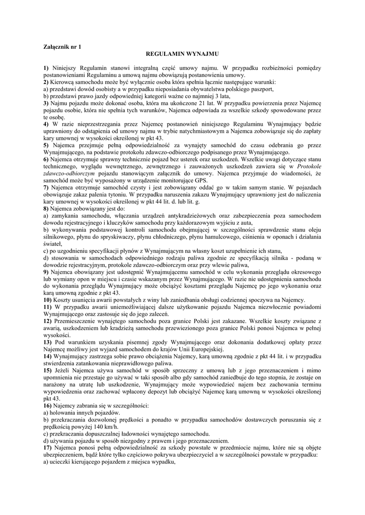 Załącznik nr 1 REGULAMIN WYNAJMU 1) Niniejszy Regulamin stanowi integralną część umowy najmu. W przypadku rozbieżności pomiędzy postanowieniami Regulaminu a umową najmu obowiązują postanowienia umowy. 2) Kierowcą samochodu może być wyłącznie osoba która spełnia łącznie następujące warunki: a) przedstawi dowód osobisty a w przypadku nieposiadania obywatelstwa polskiego paszport, b) przedstawi prawo jazdy odpowiedniej kategorii ważne co najmniej 3 lata, 3) Najmu pojazdu może dokonać osoba, która ma ukończone 21 lat. W przypadku powierzenia przez Najemcę pojazdu osobie, która nie spełnia tych warunków, Najemca odpowiada za wszelkie szkody spowodowane przez te osobę. 4) W razie nieprzestrzegania przez Najemcę postanowień niniejszego Regulaminu Wynajmujący będzie uprawniony do odstąpienia od umowy najmu w trybie natychmiastowym a Najemca zobowiązuje się do zapłaty kary umownej w wysokości określonej w pkt 43. 5) Najemca przejmuje pełną odpowiedzialność za wynajęty samochód do czasu odebrania go przez Wynajmującego, na podstawie protokołu zdawczo-odbiorczego podpisanego przez Wynajmującego. 6) Najemca otrzymuje sprawny technicznie pojazd bez usterek oraz uszkodzeń. Wszelkie uwagi dotyczące stanu technicznego, wyglądu wewnętrznego, zewnętrznego i zauważonych uszkodzeń zawiera się w Protokole zdawczo-odbiorczym pojazdu stanowiącym załącznik do umowy. Najemca przyjmuje do wiadomości, że samochód może być wyposażony w urządzenie monitorujące GPS. 7) Najemca otrzymuje samochód czysty i jest zobowiązany oddać go w takim samym stanie. W pojazdach obowiązuje zakaz palenia tytoniu. W przypadku naruszenia zakazu Wynajmujący uprawniony jest do naliczenia kary umownej w wysokości określonej w pkt 44 lit. d. lub lit. g. 8) Najemca zobowiązany jest do: a) zamykania samochodu, włączania urządzeń antykradzieżowych oraz zabezpieczenia poza samochodem dowodu rejestracyjnego i kluczyków samochodu przy każdorazowym wyjściu z auta, b) wykonywania podstawowej kontroli samochodu obejmującej w szczególności sprawdzenie stanu oleju silnikowego, płynu do spryskiwaczy, płynu chłodniczego, płynu hamulcowego, ciśnienia w oponach i działania świateł, c) po uzgodnieniu specyfikacji płynów z Wynajmującym na własny koszt uzupełnienie ich stanu, d) stosowania w samochodach odpowiedniego rodzaju paliwa zgodnie ze specyfikacją silnika - podaną w dowodzie rejestracyjnym, protokole zdawczo-odbiorczym oraz przy wlewie paliwa, 9) Najemca obowiązany jest udostępnić Wynajmującemu samochód w celu wykonania przeglądu okresowego lub wymiany opon w miejscu i czasie wskazanym przez Wynajmującego. W razie nie udostępnienia samochodu do wykonania przeglądu Wynajmujący może obciążyć kosztami przeglądu Najemcę po jego wykonaniu oraz karą umowną zgodnie z pkt 43. 10) Koszty usunięcia awarii powstałych z winy lub zaniedbania obsługi codziennej spoczywa na Najemcy. 11) W przypadku awarii uniemożliwiającej dalsze użytkowanie pojazdu Najemca niezwłocznie powiadomi Wynajmującego oraz zastosuje się do jego zaleceń. 12) Przemieszczenie wynajętego samochodu poza granice Polski jest zakazane. Wszelkie koszty związane z awarią, uszkodzeniem lub kradzieżą samochodu przewiezionego poza granice Polski ponosi Najemca w pełnej wysokości. 13) Pod warunkiem uzyskania pisemnej zgody Wynajmującego oraz dokonania dodatkowej opłaty przez Najemcę możliwy jest wyjazd samochodem do krajów Unii Europejskiej. 14) Wynajmujący zastrzega sobie prawo obciążenia Najemcy, karą umowną zgodnie z pkt 44 lit. i w przypadku stwierdzenia zatankowania nieprawidłowego paliwa. 15) Jeżeli Najemca używa samochód w sposób sprzeczny z umową lub z jego przeznaczeniem i mimo upomnienia nie przestaje go używać w taki sposób albo gdy samochód zaniedbuje do tego stopnia, że zostaje on narażony na utratę lub uszkodzenie, Wynajmujący może wypowiedzieć najem bez zachowania terminu wypowiedzenia oraz zachować wpłacony depozyt lub obciążyć Najemcę karą umowną w wysokości określonej pkt 43. 16) Najemcy zabrania się w szczególności: a) holowania innych pojazdów. b) przekraczania dozwolonej prędkości a ponadto w przypadku samochodów dostawczych poruszania się z prędkością powyżej 140 km/h. c) przekraczania dopuszczalnej ładowności wynajętego samochodu. d) używania pojazdu w sposób niezgodny z prawem i jego przeznaczeniem. 17) Najemca ponosi pełną odpowiedzialność za szkody powstałe w przedmiocie najmu, które nie są objęte ubezpieczeniem, bądź które tylko częściowo pokrywa ubezpieczyciel a w szczególności powstałe w przypadku: a) ucieczki kierującego pojazdem z miejsca wypadku, b) prowadzenia pojazdu pod wpływem alkoholu lub innych środków odurzających, c) prowadzenia pojazdu bez wymaganych uprawnień, d) złożenia nieprawdziwego oświadczenia co do miejsca, czasu, okoliczności i przyczyn powstania szkody, e) gdy nie zostaną zwrócone Wynajmującemu kluczyki lub dokumenty najmowanego pojazdu oraz w przypadku, gdy pojazd nie został właściwie zabezpieczony przed kradzieżą i włamaniem, f) odmowy współpracy z ubezpieczycielem w zakresie niezbędnym do uzyskania przez Wynajmującego odszkodowania za utratę lub uszkodzenie pojazdu, g) gdy szkoda jest wynikiem umyślnego działania lub zaniechania bądź niedbalstwa Najemcy, h) uszkodzenia opony i uszkodzenia wnętrza samochodu, pozostawienia trwałych zabrudzeń, i) wyjazdu samochodem poza terytorium Polski bez zgody Wynajmującego. j) przekroczenia dopuszczalnej prędkości lub ładowności, k) uczestnictwa w zawodach, rajdach, wyścigach, pokazach i innych tego typu imprezach . 18) Wynajmujący wypożycza samochody na czas określony przez klienta z zastrzeżeniem, iż najkrótszy czas wypożyczenia wynosi 1 dobę. 19) Najemca zobowiązuje się zwrócić pojazd nieuszkodzony, z kompletnym wyposażeniem i z dokumentami w miejscu, gdzi