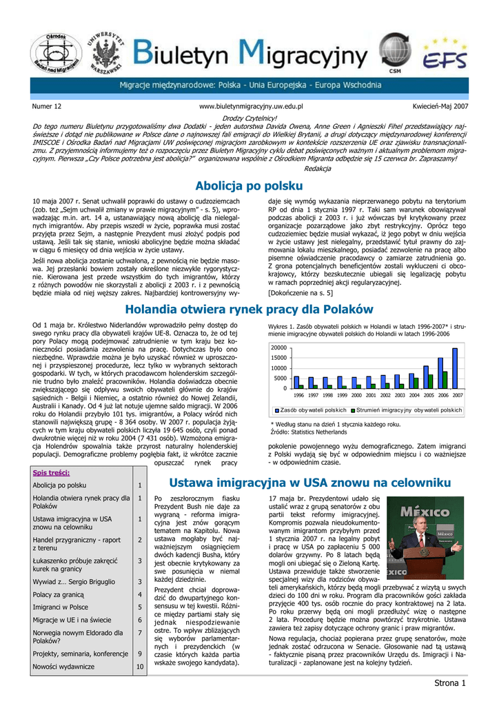 Numer 12 www.biuletynmigracyjny.uw.edu.pl Kwiecień-Maj 2007 Drodzy Czytelnicy! Do tego numeru Biuletynu przygotowaliśmy dwa Dodatki - jeden autorstwa Davida Owena, Anne Green i Agnieszki Fihel przedstawiający najświeższe i dotąd nie publikowane w Polsce dane o najnowszej fali emigracji do Wielkiej Brytanii, a drugi dotyczący międzynarodowej konferencji IMISCOE i Ośrodka Badań nad Migracjami UW poświęconej migracjom zarobkowym w kontekście rozszerzenia UE oraz zjawisku transnacjonalizmu. Z przyjemnością informujemy też o rozpoczęciu przez Biuletyn Migracyjny cyklu debat poświęconych ważnym i aktualnym problemom migracyjnym. Pierwsza „Czy Polsce potrzebna jest abolicja?” organizowana wspólnie z Ośrodkiem Migranta odbędzie się 15 czerwca br. Zapraszamy! Redakcja Abolicja po polsku 10 maja 2007 r. Senat uchwalił poprawki do ustawy o cudzoziemcach (zob. też „Sejm uchwalił zmiany w prawie migracyjnym” - s. 5), wprowadzając m.in. art. 14 a, ustanawiający nową abolicję dla nielegalnych imigrantów. Aby przepis wszedł w życie, poprawka musi zostać przyjęta przez Sejm, a następnie Prezydent musi złożyć podpis pod ustawą. Jeśli tak się stanie, wnioski abolicyjne będzie można składać w ciągu 6 miesięcy od dnia wejścia w życie ustawy. Jeśli nowa abolicja zostanie uchwalona, z pewnością nie będzie masowa. Jej przesłanki bowiem zostały określone niezwykle rygorystycznie. Kierowana jest przede wszystkim do tych imigrantów, którzy z różnych powodów nie skorzystali z abolicji z 2003 r. i z pewnością będzie miała od niej węższy zakres. Najbardziej kontrowersyjny wy- daje się wymóg wykazania nieprzerwanego pobytu na terytorium RP od dnia 1 stycznia 1997 r. Taki sam warunek obowiązywał podczas abolicji z 2003 r. i już wówczas był krytykowany przez organizacje pozarządowe jako zbyt restrykcyjny. Oprócz tego cudzoziemiec będzie musiał wykazać, iż jego pobyt w dniu wejścia w życie ustawy jest nielegalny, przedstawić tytuł prawny do zajmowania lokalu mieszkalnego, posiadać zezwolenie na pracę albo pisemne oświadczenie pracodawcy o zamiarze zatrudnienia go. Z grona potencjalnych beneficjentów zostali wykluczeni ci obcokrajowcy, którzy bezskutecznie ubiegali się legalizację pobytu w ramach poprzedniej akcji regularyzacyjnej. [Dokończenie na s. 5] Holandia otwiera rynek pracy dla Polaków Od 1 maja br. Królestwo Niderlandów wprowadziło pełny dostęp do swego rynku pracy dla obywateli krajów UE-8. Oznacza to, że od tej pory Polacy mogą podejmować zatrudnienie w tym kraju bez konieczności posiadania zezwolenia na pracę. Dotychczas było ono niezbędne. Wprawdzie można je było uzyskać również w uproszczonej i przyspieszonej procedurze, lecz tylko w wybranych sektorach gospodarki. W tych, w których pracodawcom holenderskim szczególnie trudno było znaleźć pracowników. Holandia doświadcza obecnie zwiększającego się odpływu swoich obywateli głównie do krajów sąsiednich - Belgii i Niemiec, a ostatnio również do Nowej Zelandii, Australii i Kanady. Od 4 już lat notuje ujemne saldo migracji. W 2006 roku do Holandii przybyło 101 tys. imigrantów, a Polacy wśród nich stanowili największą grupę - 8 364 osoby. W 2007 r. populacja żyjących w tym kraju obywateli polskich liczyła 19 645 osób, czyli ponad dwukrotnie więcej niż w roku 2004 (7 431 osób). Wzmożona emigracja Holendrów spowalnia także przyrost naturalny holenderskiej populacji. Demograficzne problemy pogłębia fakt, iż wkrótce zacznie opuszczać rynek pracy Spis treści: Abolicja po polsku 1 Holandia otwiera rynek pracy dla Polaków 1 Ustawa imigracyjna w USA znowu na celowniku 1 Handel przygraniczny - raport z terenu 2 Łukaszenko próbuje zakręcić kurek na granicy 3 Wywiad z… Sergio Briguglio 3 Polacy za granicą 4 Imigranci w Polsce 5 Migracje w UE i na świecie 6 Norwegia nowym Eldorado dla Polaków? 7 Projekty, seminaria, konferencje 9 Nowości wydawnicze 10 Wykres 1. Zasób obywateli polskich w Holandii w latach 1996-2007* i strumienie imigracyjne obywateli polskich do Holandii w latach 1996-2006 20000 15000 10000 5000 0 1996 1997 1998 1999 2000 2001 2002 2003 2004 2005 2006 2007 Zasób oby wateli polskich Strumień imigracy jny oby wateli polskich * Według stanu na dzień 1 stycznia każdego roku. Źródło: Statistics Netherlands pokolenie powojennego wyżu demograficznego. Zatem imigranci z Polski wydają się być w odpowiednim miejscu i co ważniejsze - w odpowiednim czasie. Ustawa imigracyjna w USA znowu na celowniku Po zeszłorocznym fiasku Prezydent Bush nie daje za wygraną - reforma imigracyjna jest znów gorącym tematem na Kapitolu. Nowa ustawa mogłaby być najważniejszym osiągnięciem dwóch kadencji Busha, który jest obecnie krytykowany za swe posunięcia w niemal każdej dziedzinie. Prezydent chciał doprowadzić do dwupartyjnego konsensusu w tej kwestii. Różnice między partiami stały się jednak niespodziewanie ostre. To wpływ zbliżających się wyborów parlamentarnych i prezydenckich (w czasie których każda partia wskaże swojego kandydata). 17 maja br. Prezydentowi udało się ustalić wraz z grupą senatorów z obu partii tekst reformy imigracyjnej. Kompromis pozwala nieudokumentowanym imigrantom przybyłym przed 1 stycznia 2007 r. na legalny pobyt i pracę w USA po zapłaceniu 5 000 dolarów grzywny. Po 8 latach będą mogli oni ubiegać się o Zieloną Kartę. Ustawa przewiduje także stworzenie specjalnej wizy dla rodziców obywateli amerykańskich, którzy będą mogli przebywać z wizytą u swych dzieci do 100 dni w roku. Program dla pracowników gości zakłada przyjęcie 400 tys. osób rocznie do pracy kontraktowej na 2 lata. Po roku przerwy będą oni mogli przedłużyć wizę o następne 2 lata. Procedurę będzie można powtórzyć trzykrotnie. Ustawa zawiera też zapisy dotyczące ochrony granic i praw migrantów. Nowa regulacja, chociaż popierana przez grupę senator