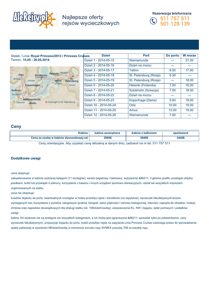 Dzień Statek / Linia: Royal Princess/2013 / Princess Cruises Termin: 15.05 - 26.05.2014 Dzień 1 - 2014-05-15 Port Do portu W morze --- 21.00 Warnemunde Dzień 2 - 2014-05-16 Dzień na morzu --- --- Dzień 3 - 2014-05-17 Tallinn 8.00 17.00 Dzień 4 - 2014-05-18 St. Petersburg (Rosja) 6.30 --- Dzień 5 - 2014-05-19 St. Petersburg (Rosja) --- 18.00 Dzień 6 - 2014-05-20 Helsinki (Finlandia) 7.00 16.00 Dzień 7 - 2014-05-21 Sztokholm (Szwecja) 7.00 18.00 Dzień 8 - 2014-05-22 Dzień na morzu --- --- Dzień 9 - 2014-05-23 Kopenhaga (Dania) 5.00 18.00 Dzień 10 - 2014-05-24 Oslo 10.00 19.00 Dzień 11 - 2014-05-25 Arhus 12.00 19.00 Dzień 12 - 2014-05-26 Warnemunde 7.00 --- Ceny Kabina: Cena za osobę w kabinie dwuosobowej od: kabina wewnętrzna kabina z balkonem apartament 2099$ 2949$ 3449$ Ceny orientacyjne. Aby uzyskać cenę aktualną w danym dniu, zadzwoń na nr tel. 511 757 511 Dodatkowe uwagi cena obejmuje: zakwaterowanie w kabinie wybranej kategorii (11 noclegów); serwis bagażowy i kabinowy; wyżywienie – 3 główne posiłki, przekąski między posiłkami, bufet lub przekąski o północy; korzystanie z basenu i innych urządzeń sportowo-rekreacyjnych; udział we wszystkich imprezach organizowanych na statku. cena nie obejmuje: kosztów dojazdu do portu; ewentualnych noclegów w hotelu przed/po rejsie i transferów (na zapytanie); wycieczek fakultatywnych;kosztu wymaganych wiz; korzystania z punktów usługowych (pralnia, fotograf, salon piękności i odnowy biologicznej, internet); napojów do obiadów i kolacji, drinków oraz napiwków obowiązkowych dla obsługi statku (ok. 10$/dzień/osobę); ubezpieczenia KL, NW i bagażu; opłat portowych i podatków. uwagi: kabiny 3/4 osobowe nie są dostępne we wszystkich kategoriach, a ich liczba jest ograniczona – sprzedaż tylko po potwierdzeniu; ceny wycieczek fakultatywnych, propozycje dojazdu do portu, hoteli przed/po rejsie na zapytanie.Linia Princess Cruises zastrzega prawo do wprowadzenia opłaty paliwowej w wysokości 9$/dzień/osobę w momencie wzrostu ropy NYMEX powyżej 70$ za baryłkę ropy. Royal Princess/2013 Royal Princess Tonaż: 141.000 ton Rok budowy: 2013 Pokłady pasażerskie: 14 Pasażerowie: 3.600 Royal Princess - obecnie najnowszy statek linii Princess Cruises na swoim pokładzie posiada między innymi:- kilkupiętrowe atrium gdzie odkryć możemy niezwykłe restauracje, w tym Gelato czy Ocean Terrace Bar Seafood. Goście na statku Royal Princess mogą poznać ekscytujące formy rozrywki; żywą muzykę, wspaniałą choreografię oraz występy gwiazd.- mnóstwo restauracji oraz lokali rozrywkowych- kino pod gwiazdami z ogromnym ekranem.- Water & Light Show - wieczorem strefa basenów przekształca się w olśniewające widowisko z pokazem fontann, któremu towarzyszy gra świateł oraz muzyka.- SeaWalk – czyli deptak z przeszklonym chodnikiem, wysunięty 28 m poza krawędź statku. Spacerując po SeaWalk można poczuć dreszczyk emocji spoglądając z ponad 100 m wysokości w morze.- Aby na chwilę odetchnąć można wybrać jedną z form wypoczynku na statku; poćwiczyć jogę, wyciszyć się w Sanktuarium lub po prostu zrelaksować się podczas kąpieli w jednym z basenów.- Princess Cruises oferuje wspaniałą zabawę dla całej rodziny; z atrakcjami dla dzieci oraz specjalnym programem dla nastolatków.• Pelicans (dla dzieci w wieku: 3-7) – zajęcia dla maluchów, zabawy, atrakcje takie jak np. wieczór filmowy.• Shockwaves (dla dzieci w wieku: 8-12) – gry i zabawy; hokej, skeeball, stanowiska do gier, sala z ogromnym telewizorem.• Remix (dla młodzieży w wieku: 13-17) – gry wideo, piłkarzyki. To wspaniałe miejsce aby poznać nowych przyjaciół.Kabiny:Kabiny wewnętrzne wyposażone są w dwa pojedyncze łóżka, które można połączyć w jedno łóżko typu queen-size, lodówkę, telewizor, szafę oraz łazienkę z prysznicem.Kabiny z balkonem wyposażone są w dwa pojedyncze łóżka, które można połączyć w jedno łóżko typu queen-size, lodówkę, telewizor, przestronną szafę, biurko, meble ogrodowe na balkonie oraz łazienkę z prysznicem.Kabiny z balkonem Deluxe są większe od standardowych kabin z balkonem. Wyposażone są w dwa pojedyncze łóżka, które można połączyć w jedno łóżko typu queen-size, lodówkę, telewizor, przestronną szafę, wygodną sofę, biurko, meble ogrodowe na balkonie oraz łazienkę z prysznicem, szlafrok, klapki frotte.Apartamenty z balkonem Mini-suite są większe od kabin z balkonem. Wyposażone są w dwa pojedyncze łóżka, które można połączyć w jedno łóżko typu queen-size, lodówkę, dwa telewizory LCD, przestronne szafy, wygodną sofę, biurko, meble ogrodowe na balkonie, łazienkę z wanną, marmurowe blaty, osobną toaletę, szlafrok, klapki frotte. Na gości czeka powitalna lamka szampana.Apartamenty z balkonem Suite są bardzo przestronne. Wyposażone są w dwa pojedyncze łóżka, które można połączyć w jedno łóżko typu queen-size, lodówkę, dwa 42`` telewizory LCD, duże szafy, wygodną sofę, biurko, meble ogrodowe na balkonie, łazienkę z wanną i prysznicem, marmurowe blaty oraz podłogi, osobną toaletę, szlafrok, klapki frotte. Na gości czeka powitalna lamka szampana. A ponadto dostęp do dedykowanego salonu Concierge oraz bezpłatny dostęp do pralni.