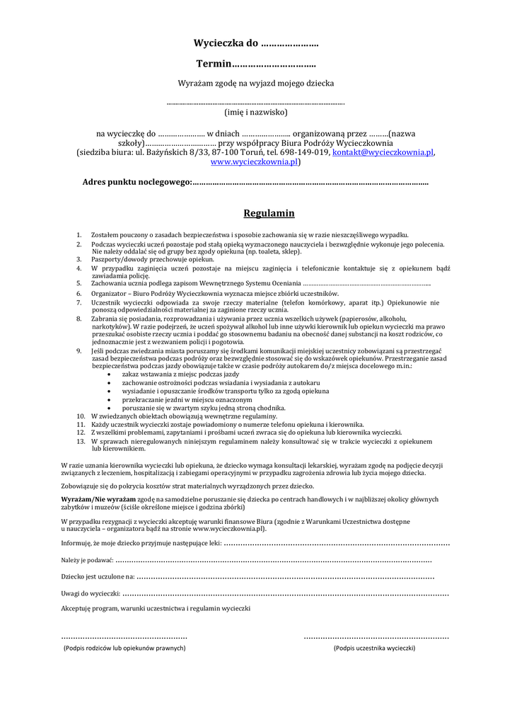 Wycieczka do …………………. Termin………………………….. Wyrażam zgodę na wyjazd mojego dziecka ..................................................................................................... (imię i nazwisko) na wycieczkę do …………………. w dniach ………………….. organizowaną przez ………(nazwa szkoły)…………………………… przy współpracy Biura Podróży Wycieczkownia (siedziba biura: ul. Bażyńskich 8/33, 87-100 Toruń, tel. 698-149-019, [email protected], www.wycieczkownia.pl) Adres punktu noclegowego:…………………………………………………………………………………………….. Regulamin 1. 2. 3. 4. 5. 6. 7. 8. 9. 10. 11. 12. 13. Zostałem pouczony o zasadach bezpieczeństwa i sposobie zachowania się w razie nieszczęśliwego wypadku. Podczas wycieczki uczeń pozostaje pod stałą opieką wyznaczonego nauczyciela i bezwzględnie wykonuje jego polecenia. Nie należy oddalać się od grupy bez zgody opiekuna (np. toaleta, sklep). Paszporty/dowody przechowuje opiekun. W przypadku zaginięcia uczeń pozostaje na miejscu zaginięcia i telefonicznie kontaktuje się z opiekunem bądź zawiadamia policję. Zachowania ucznia podlega zapisom Wewnętrznego Systemu Oceniania ………………………………………………………………... Organizator – Biuro Podróży Wycieczkownia wyznacza miejsce zbiórki uczestników. Uczestnik wycieczki odpowiada za swoje rzeczy materialne (telefon komórkowy, aparat itp.) Opiekunowie nie ponoszą odpowiedzialności materialnej za zaginione rzeczy ucznia. Zabrania się posiadania, rozprowadzania i używania przez ucznia wszelkich używek (papierosów, alkoholu, narkotyków). W razie podejrzeń, że uczeń spożywał alkohol lub inne używki kierownik lub opiekun wycieczki ma prawo przeszukać osobiste rzeczy ucznia i poddać go stosownemu badaniu na obecność danej substancji na koszt rodziców, co jednoznacznie jest z wezwaniem policji i pogotowia. Jeśli podczas zwiedzania miasta poruszamy się środkami komunikacji miejskiej uczestnicy zobowiązani są przestrzegać zasad bezpieczeństwa podczas podróży oraz bezwzględnie stosować się do wskazówek opiekunów. Przestrzeganie zasad bezpieczeństwa podczas jazdy obowiązuje także w czasie podróży autokarem do/z miejsca docelowego m.in.: zakaz wstawania z miejsc podczas jazdy zachowanie ostrożności podczas wsiadania i wysiadania z autokaru wysiadanie i opuszczanie środków transportu tylko za zgodą opiekuna przekraczanie jezdni w miejscu oznaczonym poruszanie się w zwartym szyku jedną stroną chodnika. W zwiedzanych obiektach obowiązują wewnętrzne regulaminy. Każdy uczestnik wycieczki zostaje powiadomiony o numerze telefonu opiekuna i kierownika. Z wszelkimi problemami, zapytaniami i prośbami uczeń zwraca się do opiekuna lub kierownika wycieczki. W sprawach nieregulowanych niniejszym regulaminem należy konsultować się w trakcie wycieczki z opiekunem lub kierownikiem. W razie uznania kierownika wycieczki lub opiekuna, że dziecko wymaga konsultacji lekarskiej, wyrażam zgodę na podjęcie decyzji związanych z leczeniem, hospitalizacją i zabiegami operacyjnymi w przypadku zagrożenia zdrowia lub życia mojego dziecka. Zobowiązuje się do pokrycia kosztów strat materialnych wyrządzonych przez dziecko. Wyrażam/Nie wyrażam zgodę na samodzielne poruszanie się dziecka po centrach handlowych i w najbliższej okolicy głównych zabytków i muzeów (ściśle określone miejsce i godzina zbórki) W przypadku rezygnacji z wycieczki akceptuję warunki finansowe Biura (zgodnie z Warunkami Uczestnictwa dostępne u nauczyciela – organizatora bądź na stronie www.wycieczkownia.pl). Informuję, że moje dziecko przyjmuje następujące leki: ............................................................................................... Należy je podawać: ........................................................................................................................................... Dziecko jest uczulone na: ............................................................................................................................. Uwagi do wycieczki: ......................................................................................................................................... Akceptuję program, warunki uczestnictwa i regulamin wycieczki ..................................................... ............................................................. (Podpis rodziców lub opiekunów prawnych) (Podpis uczestnika wycieczki)