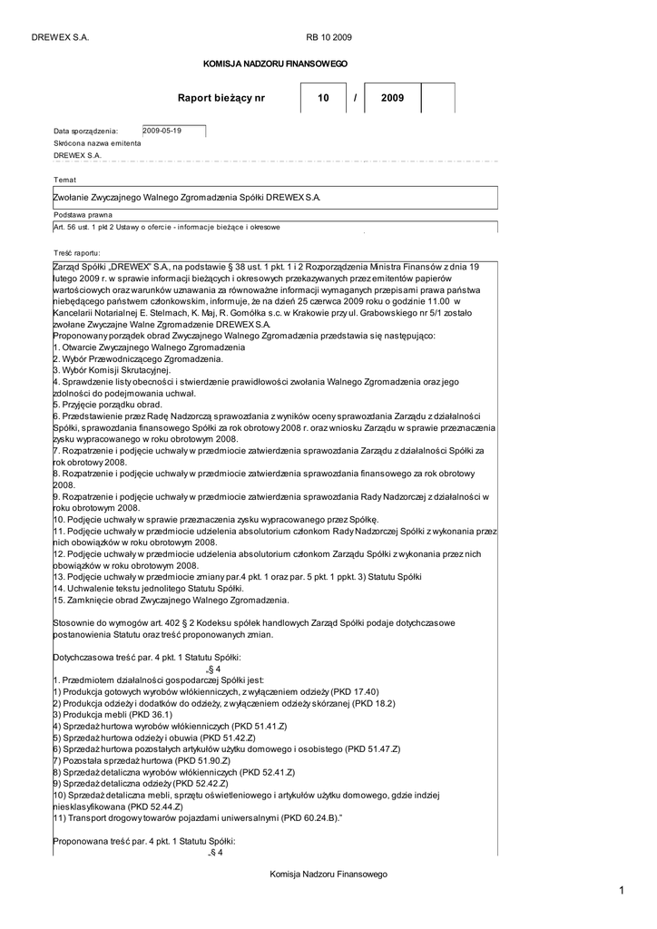 DREWEX S.A. RB 10 2009 KOMISJA NADZORU FINANSOWEGO Raport bieżący nr Data sporządzenia: 10 / 2009 2009-05-19 Skrócona nazwa emitenta DREWEX S.A. Temat Zwołanie Zwyczajnego Walnego Zgromadzenia Spółki DREWEX S.A. Podstawa prawna Art. 56 ust. 1 pkt 2 Ustawy o oferc ie - informacje bieżące i okresowe Treść raportu: Zarząd Spółki „DREWEX” S.A., na podstawie § 38 ust. 1 pkt. 1 i 2 Rozporządzenia Ministra Finansów z dnia 19 lutego 2009 r. w sprawie informacji bieżących i okresowych przekazywanych przez emitentów papierów wartościowych oraz warunków uznawania za równoważne informacji wymaganych przepisami prawa państwa niebędącego państwem członkowskim, informuje, że na dzień 25 czerwca 2009 roku o godzinie 11.00 w Kancelarii Notarialnej E. Stelmach, K. Maj, R. Gomółka s.c. w Krakowie przy ul. Grabowskiego nr 5/1 zostało zwołane Zwyczajne Walne Zgromadzenie DREWEX S.A. Proponowany porządek obrad Zwyczajnego Walnego Zgromadzenia przedstawia się następująco: 1. Otwarcie Zwyczajnego Walnego Zgromadzenia 2. Wybór Przewodniczącego Zgromadzenia. 3. Wybór Komisji Skrutacyjnej. 4. Sprawdzenie listy obecności i stwierdzenie prawidłowości zwołania Walnego Zgromadzenia oraz jego zdolności do podejmowania uchwał. 5. Przyjęcie porządku obrad. 6. Przedstawienie przez Radę Nadzorczą sprawozdania z wyników oceny sprawozdania Zarządu z działalności Spółki, sprawozdania finansowego Spółki za rok obrotowy 2008 r. oraz wniosku Zarządu w sprawie przeznaczenia zysku wypracowanego w roku obrotowym 2008. 7. Rozpatrzenie i podjęcie uchwały w przedmiocie zatwierdzenia sprawozdania Zarządu z działalności Spółki za rok obrotowy 2008. 8. Rozpatrzenie i podjęcie uchwały w przedmiocie zatwierdzenia sprawozdania finansowego za rok obrotowy 2008. 9. Rozpatrzenie i podjęcie uchwały w przedmiocie zatwierdzenia sprawozdania Rady Nadzorczej z działalności w roku obrotowym 2008. 10. Podjęcie uchwały w sprawie przeznaczenia zysku wypracowanego przez Spółkę. 11. Podjęcie uchwały w przedmiocie udzielenia absolutorium członkom Rady Nadzorczej Spółki z wykonania przez nich obowiązków w roku obrotowym 2008. 12. Podjęcie uchwały w przedmiocie udzielenia absolutorium członkom Zarządu Spółki z wykonania przez nich obowiązków w roku obrotowym 2008. 13. Podjęcie uchwały w przedmiocie zmiany par.4 pkt. 1 oraz par. 5 pkt. 1 ppkt. 3) Statutu Spółki 14. Uchwalenie tekstu jednolitego Statutu Spółki. 15. Zamknięcie obrad Zwyczajnego Walnego Zgromadzenia. Stosownie do wymogów art. 402 § 2 Kodeksu spółek handlowych Zarząd Spółki podaje dotychczasowe postanowienia Statutu oraz treść proponowanych zmian. Dotychczasowa treść par. 4 pkt. 1 Statutu Spółki: „§ 4 1. Przedmiotem działalności gospodarczej Spółki jest: 1) Produkcja gotowych wyrobów włókienniczych, z wyłączeniem odzieży (PKD 17.40) 2) Produkcja odzieży i dodatków do odzieży, z wyłączeniem odzieży skórzanej (PKD 18.2) 3) Produkcja mebli (PKD 36.1) 4) Sprzedaż hurtowa wyrobów włókienniczych (PKD 51.41.Z) 5) Sprzedaż hurtowa odzieży i obuwia (PKD 51.42.Z) 6) Sprzedaż hurtowa pozostałych artykułów użytku domowego i osobistego (PKD 51.47.Z) 7) Pozostała sprzedaż hurtowa (PKD 51.90.Z) 8) Sprzedaż detaliczna wyrobów włókienniczych (PKD 52.41.Z) 9) Sprzedaż detaliczna odzieży (PKD 52.42.Z) 10) Sprzedaż detaliczna mebli, sprzętu oświetleniowego i artykułów użytku domowego, gdzie indziej niesklasyfikowana (PKD 52.44.Z) 11) Transport drogowy towarów pojazdami uniwersalnymi (PKD 60.24.B).” Proponowana treść par. 4 pkt. 1 Statutu Spółki: „§ 4 Komisja Nadzoru Finansowego 1 DREWEX S.A. RB 10 2009 „§ 4 1. Przedmiotem działalności gospodarczej Spółki jest: 1) Produkcja pozostałych mebli (PKD 31.09.Z) 2) Produkcja pozostałych wyrobów z drewna; produkcja wyrobów z korka, słomy i materiałów używanych do wyplatania (PKD 16.29.Z) 3) Produkcja gotowych wyrobów tekstylnych (PKD13.92.Z) 4) Produkcja bielizny (PKD 14.14.Z) 5) Produkcja pozostałej odzieży i dodatków do odzieży (PKD 14.19.Z) 6) Produkcja pozostałych wyrobów, gdzie indziej niesklasyfikowana (PKD 32.99.Z) 7) Produkcja materaców (PKD 31.03.Z) 8) Sprzedaż hurtowa wyrobów tekstylnych (PKD 46.41.Z) 9) Sprzedaż hurtowa odzieży i obuwia (PKD 46.42.Z) 10) Sprzedaż hurtowa mebli, dywanów i sprzętu oświetleniowego (PKD 46.47.Z) 11) Sprzedaż detaliczna wyrobów tekstylnych prowadzona w wyspecjalizowanych sklepach (PKD 47.51.Z) 12) Sprzedaż detaliczna odzieży prowadzona w wyspecjalizowanych sklepach (PKD 47.71.Z) 13) Sprzedaż detaliczna mebli, sprzętu oświetleniowego i pozostałych artykułów użytku domowego prowadzona w wyspecjalizowanych sklepach (PKD 47.59.Z) 14) Transport drogowy towarów (PKD 49.41.Z).” Dotychczasowa treść par. 5 pkt. 1 ppkt. 3) Statutu Spółki: „3.375.000 (trzy miliony trzysta siedemdziesiąt pięć tysięcy) akcji imiennych zwykłych serii C” Proponowana treść par. 5 pkt. 1 ppkt. 3) Statutu Spółki: „3.375.000 (trzy miliony trzysta siedemdziesiąt pięć tysięcy) akcji zwykłych na okaziciela serii C.” Zarząd Spółki informuje, iż prawo uczestniczenia w Walnym Zgromadzeniu mają właściciele akcji imiennych, jeżeli zostali wpisani do księgi akcyjnej co najmniej na tydzień przed odbyciem Walnego Zgromadzenia oraz właściciele akcji na okaziciela, których dokumenty akcji zostaną złożone w siedzibie Spółki co najmniej na tydzień przed terminem zwołanego zgromadzenia i nie będą odebrane przed jego ukończeniem. Zamiast akcji najpóźniej do dnia 17 czerwca 2009 roku do godz. 17.00 mogą być złożone w sekretariacie siedziby Spółki w Krakowie przy ul. Obozowej nr 42A/2 (sekretariat czynny codziennie od godziny 9-tej do godziny 17-tej) imienne świadectwa depozytowe wydane przez podmiot prowadzący rachunek papierów wartościowych Akcjonariusza, stwierdzające ilość posiadanych akcji oraz że akcje t