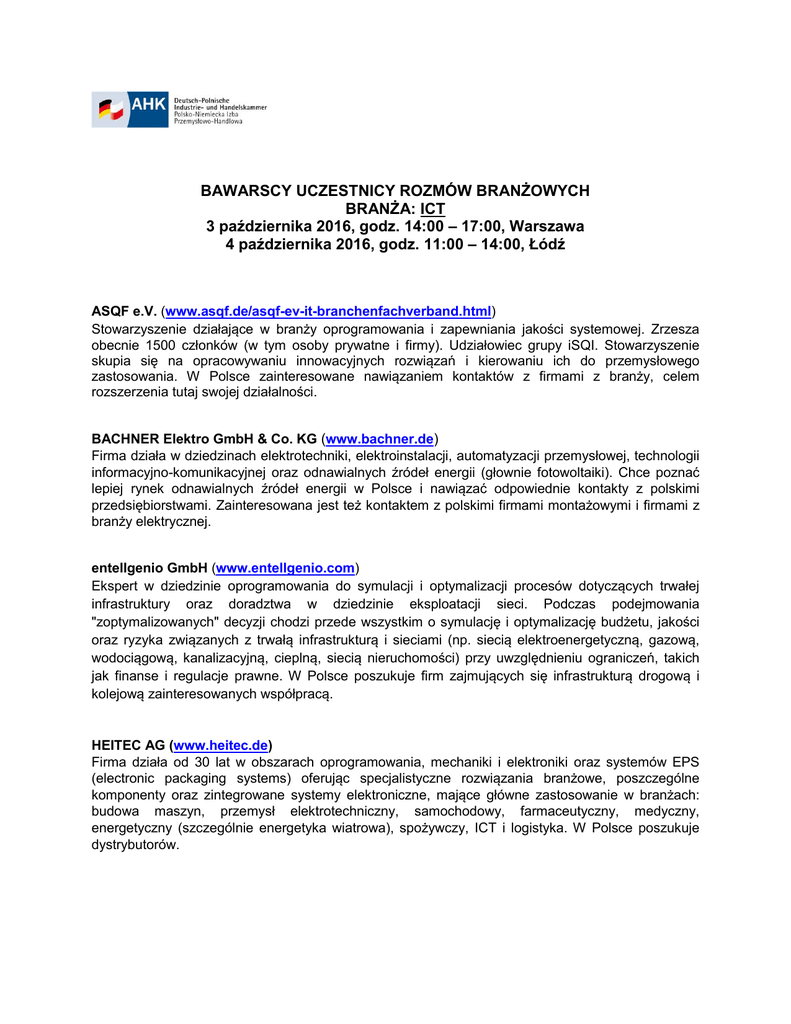 BAWARSCY UCZESTNICY ROZMÓW BRANŻOWYCH BRANŻA: ICT 3 października 2016, godz. 14:00 – 17:00, Warszawa 4 października 2016, godz. 11:00 – 14:00, Łódź ASQF e.V. (www.asqf.de/asqf-ev-it-branchenfachverband.html) Stowarzyszenie działające w branży oprogramowania i zapewniania jakości systemowej. Zrzesza obecnie 1500 członków (w tym osoby prywatne i firmy). Udziałowiec grupy iSQI. Stowarzyszenie skupia się na opracowywaniu innowacyjnych rozwiązań i kierowaniu ich do przemysłowego zastosowania. W Polsce zainteresowane nawiązaniem kontaktów z firmami z branży, celem rozszerzenia tutaj swojej działalności. BACHNER Elektro GmbH & Co. KG (www.bachner.de) Firma działa w dziedzinach elektrotechniki, elektroinstalacji, automatyzacji przemysłowej, technologii informacyjno-komunikacyjnej oraz odnawialnych źródeł energii (głownie fotowoltaiki). Chce poznać lepiej rynek odnawialnych źródeł energii w Polsce i nawiązać odpowiednie kontakty z polskimi przedsiębiorstwami. Zainteresowana jest też kontaktem z polskimi firmami montażowymi i firmami z branży elektrycznej. entellgenio GmbH (www.entellgenio.com) Ekspert w dziedzinie oprogramowania do symulacji i optymalizacji procesów dotyczących trwałej infrastruktury oraz doradztwa w dziedzinie eksploatacji sieci. Podczas podejmowania "zoptymalizowanych" decyzji chodzi przede wszystkim o symulację i optymalizację budżetu, jakości oraz ryzyka związanych z trwałą infrastrukturą i sieciami (np. siecią elektroenergetyczną, gazową, wodociągową, kanalizacyjną, cieplną, siecią nieruchomości) przy uwzględnieniu ograniczeń, takich jak finanse i regulacje prawne. W Polsce poszukuje firm zajmujących się infrastrukturą drogową i kolejową zainteresowanych współpracą. HEITEC AG (www.heitec.de) Firma działa od 30 lat w obszarach oprogramowania, mechaniki i elektroniki oraz systemów EPS (electronic packaging systems) oferując specjalistyczne rozwiązania branżowe, poszczególne komponenty oraz zintegrowane systemy elektroniczne, mające główne zastosowanie w branżach: budowa maszyn, przemysł elektrotechniczny, samochodowy, farmaceutyczny, medyczny, energetyczny (szczególnie energetyka wiatrowa), spożywczy, ICT i logistyka. W Polsce poszukuje dystrybutorów. in-tech industry GmbH (www.in-tech.de Specjalizuje się w digitalizacji produktów przemysłowych. Łączy inżynierię z informatyką i sprawia, że koncepcja Przemysł 4.0 nabiera realnych kształtów i staje się rzeczywistością. Proces rozwoju firmy in-tech industry ma na celu komputeryzację inżynierii mechanicznej i techniki kolejowej i obejmuje zarówno inżynierię oprogramowania dla inteligentnych systemów sterowania, inżynierię systemów dla złożonych i krytycznych pod względem bezpieczeństwa systemów, rozwiązania w zakresie obsługi mobilnej i intuicyjnej jak również stworzenie bezpiecznych i skutecznych aplikacji stosownie do koncepcji Przemysł 4.0. W Polsce poszukuje klientów z branży budowy maszyn i techniki kolejowej. Lemisoft (www.lemisoft.de) Firma zajmuje się doradztwem i udziela wsparcia klientom w projektowaniu ich produktów tak, aby były bardziej efektywne, wydajne i prostsze w obsłudze. Dzięki konsekwentnej realizacji procesu projektowego (ang. user centered design) potrzeby użytkownika produktu znajdują się zawsze na pierwszym miejscu. Celem jest, aby wrażenia, jakich doświadcza użytkownik podczas korzystania z produktu (ang. user experience) były jak najbardziej pozytywne. Do podstawowego zakresu działalności spółki należą technika medyczna, rozwiązania dla przemysłu i mediów. W Polsce zainteresowana nawiązaniem kontaktu z firmami w dziedzinie rozwoju oprogramowania. SEP AG (www.sep.de) Firma oferuje oprogramowanie SEP sesam do backupów, restores i disaster recovery, ekstremalnie elastyczne i niezawodne, które pasuje do każdego otoczenia IT od małych przedsiębiorstw aż do dużych koncernów. SEP sesam wspiera wszystkie powszechnie znane systemy operacyjne, platformy wirtualizacyjne, zastosowania, bazy danych i technologie przechowywania. Firma posiada tysiące klientów na całym świecie. W Krakowie od 2012 działa jej filia, obsługująca ponad 20 klientów z przemysłu, instytucji publicznych i rządowych. Firma zainteresowana pozyskaniem nowych klientów i partnerów dystrybucyjnych w Polsce. TRIPS GmbH (www.trips-group.com) Integrator systemów oferuje usługi w zakresie automatyzacji maszyn i instalacji przemysłu procesowego i wytwórczego. Portfolio firmy sięga od wspomaganego komputerowo projektowania technik sterowania poprzez inżynierię oprogramowania dla systemów sterujących, układów sterowania i wizualizacji procesów produkcyjnych aż po montaż, okablowanie i uruchamianie rozdzielnic na całym świecie. Główna domena branży obejmuje następujące dziedziny: wytwarzanie i dystrybucję energii elektrycznej, sektor ropy naftowej i gazu ziemnego, przemysł chemiczny, gospodarkę wodno-ściekową oraz zakłady wapiennicze i cementownie. Celem firmy jest znalezienie klientów z branży budowy maszyn i urządzeń. Wirecard Central Eastern Europe GmbH (www.wirecard.com) Globalna firma technologiczna, która wspomaga sprzedawców wielu branż w elektronicznym dokonywaniu płatności odnośnie wszystkich kanałów dystrybucji i sprzedaży. Jako jeden z wiodących dostawców w tym segmencie jest niezależna i oferuje oprócz outsourcingu rozwiązań dla płatności elektronicznych także koncepcje "white label". Międzynarodowe procedury akceptacji płatności oraz ważnej ochrony przed nadużyciami i dostępem osób niepowołanych są scentralizowane na jednej globalnej platformie. Cel w Polsce to rozwój biznesu w zakresie klientów kluczowych i klientów MŚP oraz strategiczne partnerstwo w dziedzinie elektronicznego dokonywania płatności (procedura dokonywania płatności payment processing, zarządzanie ryzykiem, akwizycja kart kredytowych do transakcji w