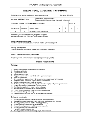 SYLABUS - Karta programu przedmiotu WYDZIAŁ FIZYKI, MATEMATYKI I INFORMATYKI Rodzaj studiów: studia stacjonarne pierwszego stopnia Kierunek: MATEMATYKA Rok akad. 2010/2011 Przedmiot specjalizacyjny 3 Specjalność: Matematyka w finansach i ekonomii Przedmiot: TEORIA PODEJMOWANIA DECYZJI Rok studiów: Semestr: III 6 ECTS: 7 Rodzaj zajęć: W Ć Liczba godzin w semestrze: 30 30 Przedmioty wprowadzające / wymagania wstępne Analiza matematyczna, rachunek prawdopodobieństwa Założenia i cele przedmiotu Podstawy teoretyczne do budowy różnych modeli optymalizacyjnych. Metody dydaktyczne Wykłady tablicowe. Ćwiczenia audytoryjne z udziałem studentów. Forma i warunki zaliczenia przedmiotu: Pozytywny wynik kolokwium ( ćwiczenia ) i egzaminu ( wykład ). TREŚCI PROGRAMOWE Wykłady: 1. 2. 3. 4. 5. 6. 7. 8. 9. 10. 11. 12. 13. 14. 15. 16. Ogólne zagadnienie programowania liniowego. Metoda simpleksów. Zagadnienie dualne. Modele transportowe. Programowanie liniowe wielokryterialne i parametryczne. Wstęp do teorii gier. Równoważność gry macierzowej i zagadnienia programowania liniowego. Programowanie nieliniowe, wypukłe oraz kwadratowe. Modele obsługi masowej, strumień prosty. Rozkład prawdopodobieństwa długości okresów między kolejnymi zgłoszeniami. Rozkłady prawdopodobieństwa czasów obsługi. Model systemu z jednym stanowiskiem obsługi. Model systemu z wieloma stanowiskami obsługi. Proces urodzin i śmierci. Zagadnienie konserwatorów. Inne modele obsługi masowej. Podejmowanie decyzji w warunkach ryzyka i niepewności. Ćwiczenia audytoryjne 1. 2. 3. 4. 5. 6. 7. 8. Rozwiązywanie układów równań liniowych metodą eliminacji. Konstrukcja modeli programowania liniowego dla konkretnych danych. Rozwiązywanie prostych modeli metodą graficzną. Rozwiązywanie modeli metodą simpleksów. Budowa i rozwiązywanie modeli parametrycznych. Rozwiązywanie gier macierzowych. Przykłady modeli nieliniowych. Rozwiązywanie modelu obsługi z jednym stanowiskiem. S L 9. Rozwiązywanie modelu obsługi z wieloma stanowiskami obsługi. 10. Przykłady podejmowania decyzji w warunkach ryzyka i niepewności. Wykaz literatury podstawowej: [1] S.I.Gass, Programowanie liniowe, PWN, Warszawa 1976. [2] W. Grabowski. Programowanie matematyczne, PWE, Warszawa 1980. [3] B.Filipowicz, Modele stochastyczne w badaniach operacyjnych, WNT, Warszawa 1996. [4] G. Owen, Teoria gier, PWN, Warszawa 1975. Wykaz literatury uzupełniającej: [1] O. Tikhonenko, Modele obsługi masowej w systemach informacyjnych, EXIT, W-wa 2003. [2] F. Zitek, Stracony czas: elementy teorii obsługi masowej, PWN, Poznań, W-wa 1974. Osoba(y) odpowiedzialna(e) za przedmiot: dr K.azimierz WARCHULSKI Zatwierdził: dr hab. Teresa WINIARSKA, prof. PK