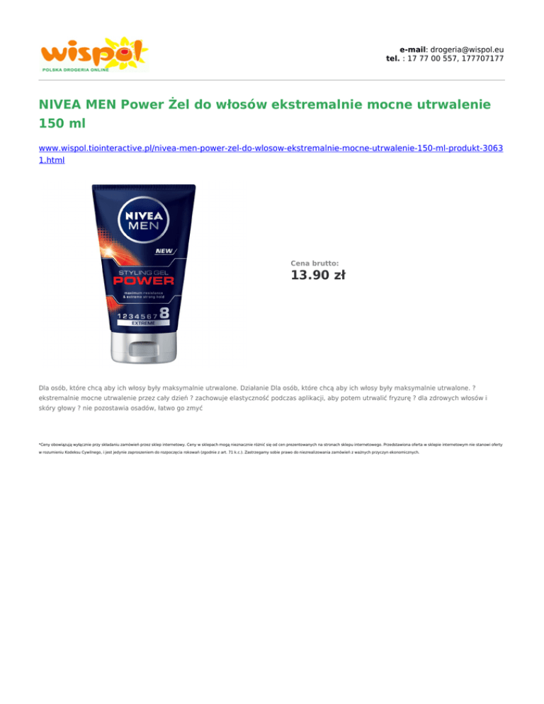 e-mail: [email protected] tel. : 17 77 00 557, 177707177 NIVEA MEN Power Żel do włosów ekstremalnie mocne utrwalenie 150 ml www.wispol.tiointeractive.pl/nivea-men-power-zel-do-wlosow-ekstremalnie-mocne-utrwalenie-150-ml-produkt-3063 1.html Cena brutto: 13.90 zł Dla osób, które chcą aby ich włosy były maksymalnie utrwalone. Działanie Dla osób, które chcą aby ich włosy były maksymalnie utrwalone. ? ekstremalnie mocne utrwalenie przez cały dzień ? zachowuje elastyczność podczas aplikacji, aby potem utrwalić fryzurę ? dla zdrowych włosów i skóry głowy ? nie pozostawia osadów, łatwo go zmyć *Ceny obowiązują wyłącznie przy składaniu zamówień przez sklep internetowy. Ceny w sklepach mogą nieznacznie różnić się od cen prezentowanych na stronach sklepu internetowego. Przedstawiona oferta w sklepie internetowym nie stanowi oferty w rozumieniu Kodeksu Cywilnego, i jest jedynie zaproszeniem do rozpoczęcia rokowań (zgodnie z art. 71 k.c.). Zastrzegamy sobie prawo do niezrealizowania zamówień z ważnych przyczyn ekonomicznych.