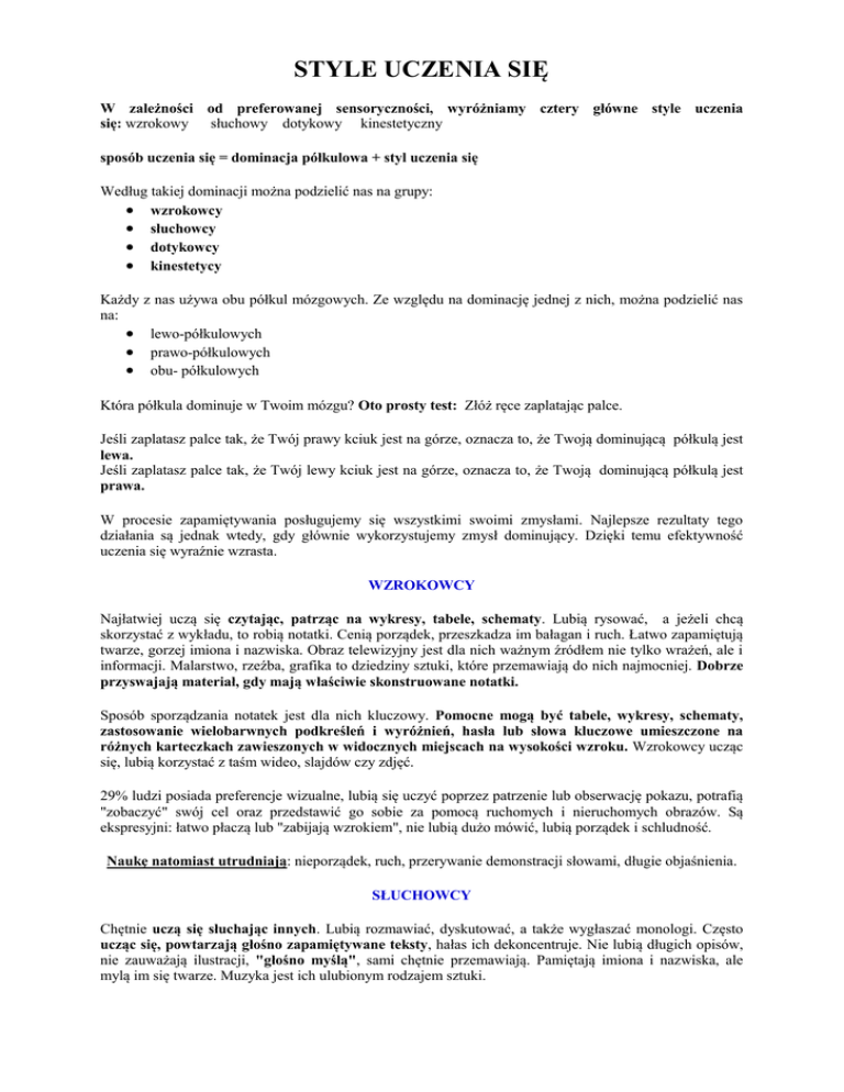 STYLE UCZENIA SIĘ W zależności od preferowanej sensoryczności, wyróżniamy cztery główne style uczenia się: wzrokowy słuchowy dotykowy kinestetyczny sposób uczenia się = dominacja półkulowa + styl uczenia się Według takiej dominacji można podzielić nas na grupy: wzrokowcy słuchowcy dotykowcy kinestetycy Każdy z nas używa obu półkul mózgowych. Ze względu na dominację jednej z nich, można podzielić nas na: lewo-półkulowych prawo-półkulowych obu- półkulowych Która półkula dominuje w Twoim mózgu? Oto prosty test: Złóż ręce zaplatając palce. Jeśli zaplatasz palce tak, że Twój prawy kciuk jest na górze, oznacza to, że Twoją dominującą półkulą jest lewa. Jeśli zaplatasz palce tak, że Twój lewy kciuk jest na górze, oznacza to, że Twoją dominującą półkulą jest prawa. W procesie zapamiętywania posługujemy się wszystkimi swoimi zmysłami. Najlepsze rezultaty tego działania są jednak wtedy, gdy głównie wykorzystujemy zmysł dominujący. Dzięki temu efektywność uczenia się wyraźnie wzrasta. WZROKOWCY Najłatwiej uczą się czytając, patrząc na wykresy, tabele, schematy. Lubią rysować, a jeżeli chcą skorzystać z wykładu, to robią notatki. Cenią porządek, przeszkadza im bałagan i ruch. Łatwo zapamiętują twarze, gorzej imiona i nazwiska. Obraz telewizyjny jest dla nich ważnym źródłem nie tylko wrażeń, ale i informacji. Malarstwo, rzeźba, grafika to dziedziny sztuki, które przemawiają do nich najmocniej. Dobrze przyswajają materiał, gdy mają właściwie skonstruowane notatki. Sposób sporządzania notatek jest dla nich kluczowy. Pomocne mogą być tabele, wykresy, schematy, zastosowanie wielobarwnych podkreśleń i wyróżnień, hasła lub słowa kluczowe umieszczone na różnych karteczkach zawieszonych w widocznych miejscach na wysokości wzroku. Wzrokowcy ucząc się, lubią korzystać z taśm wideo, slajdów czy zdjęć. 29% ludzi posiada preferencje wizualne, lubią się uczyć poprzez patrzenie lub obserwację pokazu, potrafią "zobaczyć" swój cel oraz przedstawić go sobie za pomocą ruchomych i nieruchomych obrazów. Są ekspresyjni: łatwo płaczą lub "zabijają wzrokiem", nie lubią dużo mówić, lubią porządek i schludność. Naukę natomiast utrudniają: nieporządek, ruch, przerywanie demonstracji słowami, długie objaśnienia. SŁUCHOWCY Chętnie uczą się słuchając innych. Lubią rozmawiać, dyskutować, a także wygłaszać monologi. Często ucząc się, powtarzają głośno zapamiętywane teksty, hałas ich dekoncentruje. Nie lubią długich opisów, nie zauważają ilustracji, "głośno myślą", sami chętnie przemawiają. Pamiętają imiona i nazwiska, ale mylą im się twarze. Muzyka jest ich ulubionym rodzajem sztuki. Dla słuchowców najlepsze jest powtarzanie na głos informacji. Dobrze uczy im się z innymi osobami. Ogromne znaczenie ma odpowiednia intonacja głosu. Właściwą metodą nauki jest nagrywanie wymaganych do egzaminu informacji na dyktafon, a następnie ich odsłuchiwanie. 34% ludzi preferuje system audytywny. Dla nich liczy się tylko to, co zostało powiedziane, przez kogo i w jaki sposób. Słuchowiec łatwo uczy się poprzez słuchanie i głośne powtarzanie, dlatego w czasie pracy z nim należy pamiętać o tym, że: uczy się łatwo z dyskusji i wykładów, lepiej rozumie to co czyta, jeśli może czytać półgłosem, rozwiązując problem „głośno myśli” lub rozmawia z innymi. Uczeniu się natomiast nie sprzyjają: hałas, zbyt długie i szczegółowe teksty pisane, konieczność opowiadania o tym co widzi, co czuje, zmuszanie do kontaktu wzrokowego . KINESTETYCY / CZUCIOWCY Najłatwiej uczą się, gdy sami coś wykonują. Są świetnymi "asystentami" nauczycieli. Lubią ruch, prace manualne, angażują się emocjonalnie w to, co robią. Niezbyt chętnie czytają, chyba że tekst ma żywą fabułę. Ortografia sprawia im kłopoty. Czuciowcy najczęściej nie są szczególnie cenieni w szkole, warto jednak pamiętać, że wiedza i umiejętności zdobyte przez działanie przyswajane są w znacznie większym stopniu niż przez bodźce wzrokowe czy słuchowe. Najlepiej uczą się poprzez wykonywanie różnych czynności, w które bardzo się angażują. Ich wyobraźnia pracuje w ruchu. Lubią czuć emocje, zapachy i smaki. 37% ludzi preferuje system kinestetyczny, lubią uczyć się poprzez wykonywanie i bezpośrednie zaangażowanie, lubią coś trzymać, manipulować, gestykulować itp. W uczeniu się kinestetykowi pomagają: konkretne działania, odgrywanie i przedstawianie tego, czego się uczy w sposób materialny, możliwość ruszania się trakcie słuchania, korzystanie z modeli, obiektów, które można dotknąć, poczuć i zobaczyć, jak to się ma do opisu, możliwość samodzielnego eksperymentowania. W nauce kinestetykowi przeszkadza: konieczność słuchania długich wyjaśnień, mówienie o tym, co widzi lub słyszy, komentarz słowny w toku pokazu, zmuszanie do długiego pozostawania w bezruchu. Sukcesy w szkolnych konkurencjach Uczeń wzrokowiec słuchowiec czuciowiec/kinestetetyk ładne pisanie, ładne zeszyty + +/ - - pisanie bez błędów ortograficznych + - +/- sprawne korzystanie z map + - +/- aktywny udział w lekcji – wypowiedzi - + - grzeczność, czyli „niegadanie na lekcjach” i spokojne zachowanie + - - Koncentracja uwagi na nauczycielu + - - Oczywiście, nikt nie jest stuprocentowym przedstawicielem jednego z tych typów. Chodzi o wyraźną dominację zaangażowania określonego zmysłu (lub też analitycznego podejścia do zdobywanych informacji). Ważne jest to, który z instrumentów poznawczych dominuje u ucznia. Uczeń - lubi demonstracje lub pokazy - lubi wykresy i tabele - lubi opisy - pamięta twarze i imiona wzrokowiec - lubi robić notatki - lubi patrzeć, rysować - preferuje sztuki wizualne - lubi dialogi i rozmowy - powtarza głośno to, co napisali - rozmawia ze sobą - lubi słuchać - lubi wykłady