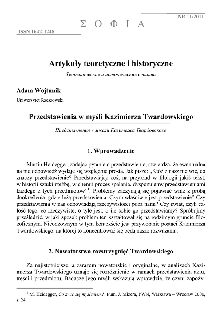 Σ Ο Φ Ι Α ISSN 1642-1248 NR11/2011 7/2007 NR ISSN 1642-1248 Artykuły teoretyczne i historyczne Теоретические и исторические статьи Adam Wojtunik Uniwersytet Rzeszowski Przedstawienia w myśli Kazimierza Twardowskiego Представления в мысли Казимежа Твардовского 1. Wprowadzenie Martin Heidegger, zadając pytanie o przedstawienie, stwierdza, że ewentualna na nie odpowiedź wydaje się względnie prosta. Jak pisze: „Któż z nasz nie wie, co znaczy przedstawienie? Przedstawiając coś, na przykład w filologii jakiś tekst, w historii sztuki rzeźbę, w chemii proces spalania, dysponujemy przedstawieniami każdego z tych przedmiotów”1. Problemy zaczynają się pojawiać wraz z próbą dookreślenia, gdzie leżą przedstawienia. Czym właściwie jest przedstawienie? Czy przedstawienia w nas odpowiadają rzeczywistości poza nami? Czy świat, czyli całość tego, co rzeczywiste, o tyle jest, o ile sobie go przedstawiamy? Spróbujmy prześledzić, w jaki sposób problem ten kształtował się na rodzimym gruncie filozoficznym. Nieodzownym w tym kontekście jest przywołanie postaci Kazimierza Twardowskiego, na której to koncentrować się będą nasze rozważania. 2. Nowatorstwo rozstrzygnięć Twardowskiego Za najistotniejsze, a zarazem nowatorskie i oryginalne, w analizach Kazimierza Twardowskiego uznaje się rozróżnienie w ramach przedstawienia aktu, treści i przedmiotu. Badacze jego myśli wskazują wprawdzie, że czyni zapoży1 s. 24. M. Heidegger, Co zwie się myśleniem?, tłum. J. Mizera, PWN, Warszawa – Wrocław 2000, 130 Adam Wojtunik czenia i korzysta ze sformułowań głównie Brentany, ale i Höflera, Meinonga oraz Zimmermanna. Niemniej należy przyznać, iż analizy Twardowskiego są „(…) na tyle różne od dotychczas istniejących, że można mówić o istotnej nowości jego koncepcji w stosunku do wcześniejszych”2. I chociaż zastosowana terminologia znana była znacznie wcześniej, to pojmowano ją w innym sensie i niewystarczająco ją od siebie odróżniając3. Przyjrzyjmy się zatem dokładniej dokonanej przez Twardowskiego analizie przedstawienia. Gruntownie problem rozpatrzony został w rozprawie habilitacyjnej Zur Lehre vom Inhalt und Gegenstand der Vorstellungen. Eine psychologische Untersuchung4, inspirowanej w znacznym stopniu przemyśleniami Franza Brentany5. Rozprawa poświęcona jest głównie zagadnieniu aktu, treści i przedmiotu przedstawienia. Czynność psychiczna to, najprościej mówiąc, akt przedstawienia sobie czegoś. Treść przedstawienia to wytworzony przez czynność przedstawiającą „obraz” psychiczny przedmiotu, stanowiący element pośredni między aktem a przedmiotem przedstawienia. Zdaniem Twardowskiego, nieuwzględnienie powyższej dystynkcji i posługiwanie się niedookreślonym wyrazem „przedstawienie” naraża nas na liczne nieporozumienia. Postuluje zatem, by posługiwać się precyzyjniejszymi wyrażeniami, jakimi są jego zdaniem właśnie: „akt przedstawienia” i „treść przedstawienia”6. Inna trudność, którą 2 E. Paczkowska-Łagowska, Psychika i poznanie. Epistemologia K. Twardowskiego, PWN, Warszawa 1980, s. 95 3 Zob. ibidem, s. 96. 4 Wiele interesujących, historycznych informacji na temat powstania omawianego dzieła Twardowskiego odnaleźć można w rozdziale drugim, zatytułowanym Kazimierz Twardowski – prekursor teorii przedmiotu, pracy Krzysztofa Wieczorka, Spory o przedmiot poznania, Wyd. UŚ, Katowice 2004, s. 77–80. Por. Cz. Porębski, Wstęp tłumacza [w:] F. Brentano, O źródle poznania moralnego, tłum. Cz. Porębski, PWN, Warszawa 1987, s. XI–XXIII. 5 Obszernie i skrupulatne opracowanie problemu intelektualnych zależności pomiędzy myślą Brentany i Twardowskiego dostarcza przytaczana już praca Elżbiety Paczkowskiej-Łagowskiej, Psychika i poznanie ..., s. 5–39 i 100 i n. Zob. K. Ajdukiewicz, Kierunki i prądy filozofii współczesnej [w:] idem, Język i poznanie. Wybór pism z lat 1920–1939, t. I, PWN, Warszawa 1985, s. 252 i n. 6 Zob. K. Twardowski, O treści i przedmiocie przedstawień [w:] idem, Wybrane pisma filozoficzne, Warszawa 1965, wyd. I, s. 3 i n. oraz B. Andrzejewski (red.), Leksykon filozofii. Postaci i pojęcia, DE FACTO, Poznań 2000, s. 486 i n. W duchu Twardowskiego przedstawienie definiuje Józef Dębowski, wskazując na zastosowanie tego terminu w teorii poznania i psychologii, stwierdza, iż przedstawienie oznacza świadomościowe odwzorowanie, stworzenie obrazu przedmiotów, sytuacji bądź zdarzeń istniejących w pełni niezależnie od świadomości lub wytworzonych poprzez aktualizację wcześniej nabytych treści świadomości (w przypomnieniach i wyobraźni). Przedstawienia mogą mieć charakter naoczny, oglądowy bądź abstrakcyjny, pojęciowy. Niekiedy możliwe rodzaje przedstawień ogranicza się wyłącznie do przedstawień spostrzeżeniowych i wyobrażeniowych, wówczas z reguły są one odróżniane od myśli, pojęć i idei, a nawet im przeciwstawiane. Często przedstawienia, w odróżnieniu od wszystkich pozostałych aktów i ujęć poznawczych, charakteryzowane są też jako akty poznawcze pozbawione tetycznego momentu (asercji). Od Przedstawienia w myśli Kazimierza Twardowskiego 131 należy mieć na uwadze, to odróżnienie przedmiotu przedstawienia od immanentnego obiektu, czyli treści przedstawienia. Chodzi więc o rozgraniczenie „(…) między tym, co przedstawione, w jednym sensie, w którym znaczy ono treść, a tym, co przedstawione, w innym sensie, w którym służy do oznaczania przedmiotu, krótko mówiąc: między treścią przedstawienia a przedmiotem przedstawienia, oraz rozpatrzeniem ich wzajemnego stosunku”7. 3. Przedstawienie a nazwy i ich funkcje Ze wspomnianym tu odróżnieniem treści i przedmiotu przedstawienia koresponduje problem relacji pomiędzy przedstawieniami a nazwami, pojmowanymi jako słowne znaki przedstawień. W paragra