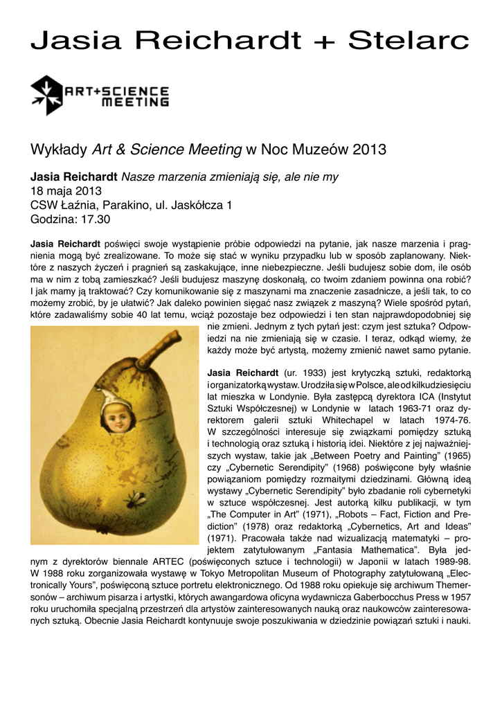 Jasia Reichardt + Stelarc Wykłady Art & Science Meeting w Noc Muzeów 2013 Jasia Reichardt Nasze marzenia zmieniają się, ale nie my 18 maja 2013 CSW Łaźnia, Parakino, ul. Jaskółcza 1 Godzina: 17.30 Jasia Reichardt poświęci swoje wystąpienie próbie odpowiedzi na pytanie, jak nasze marzenia i pragnienia mogą być zrealizowane. To może się stać w wyniku przypadku lub w sposób zaplanowany. Niektóre z naszych życzeń i pragnień są zaskakujące, inne niebezpieczne. Jeśli budujesz sobie dom, ile osób ma w nim z tobą zamieszkać? Jeśli budujesz maszynę doskonałą, co twoim zdaniem powinna ona robić? I jak mamy ją traktować? Czy komunikowanie się z maszynami ma znaczenie zasadnicze, a jeśli tak, to co możemy zrobić, by je ułatwić? Jak daleko powinien sięgać nasz związek z maszyną? Wiele spośród pytań, które zadawaliśmy sobie 40 lat temu, wciąż pozostaje bez odpowiedzi i ten stan najprawdopodobniej się nie zmieni. Jednym z tych pytań jest: czym jest sztuka? Odpowiedzi na nie zmieniają się w czasie. I teraz, odkąd wiemy, że każdy może być artystą, możemy zmienić nawet samo pytanie. Jasia Reichardt (ur. 1933) jest krytyczką sztuki, redaktorką i organizatorką wystaw. Urodziła się w Polsce, ale od kilkudziesięciu lat mieszka w Londynie. Była zastępcą dyrektora ICA (Instytut Sztuki Współczesnej) w Londynie w latach 1963-71 oraz dyrektorem galerii sztuki Whitechapel w latach 1974-76. W szczególności interesuje się związkami pomiędzy sztuką i technologią oraz sztuką i historią idei. Niektóre z jej najważniejszych wystaw, takie jak „Between Poetry and Painting” (1965) czy „Cybernetic Serendipity” (1968) poświęcone były właśnie powiązaniom pomiędzy rozmaitymi dziedzinami. Główną ideą wystawy „Cybernetic Serendipity” było zbadanie roli cybernetyki w sztuce współczesnej. Jest autorką kilku publikacji, w tym „The Computer in Art” (1971), „Robots – Fact, Fiction and Prediction” (1978) oraz redaktorką „Cybernetics, Art and Ideas” (1971). Pracowała także nad wizualizacją matematyki – projektem zatytułowanym „Fantasia Mathematica”. Była jednym z dyrektorów biennale ARTEC (poświęconych sztuce i technologii) w Japonii w latach 1989-98. W 1988 roku zorganizowała wystawę w Tokyo Metropolitan Museum of Photography zatytułowaną „Electronically Yours”, poświęconą sztuce portretu elektronicznego. Od 1988 roku opiekuje się archiwum Themersonów – archiwum pisarza i artystki, których awangardowa oficyna wydawnicza Gaberbocchus Press w 1957 roku uruchomiła specjalną przestrzeń dla artystów zainteresowanych nauką oraz naukowców zainteresowanych sztuką. Obecnie Jasia Reichardt kontynuuje swoje poszukiwania w dziedzinie powiązań sztuki i nauki. Stelarc Mięso, Metal i Kod: Zombie, Cyborgi i Chimery 18 maja 2013 CSW Łaźnia, Parakino, ul. Jaskółcza 1 Godzina: 19.00 Ciała coraz częściej działają jako rozbudowane systemy operacyjne obejmujące rozszerzoną i mieszaną rzeczywistość: konstrukcje cyborgów i robotów w alternatywnych architekturach anatomicznych. Współczesna chimera jest hybrydą biologicznej maszyny i systemu wirtualnego. Życie i emocjonalność wyrażane są choreografiami zdalnego interfejsu i interakcji ciała fraktalnego i fantomowego. Stelarc (ur. 1946) artysta poszukujący alternatywnych architektur anatomicznych. Do jego prac należą m.in. Third Hand, Stomach Sculpture i Exoskeleton, czyli sześcionożny robot. Performans Fractal Flesh bazował na bezustannej elektrycznej stymulacji ciała. Ping Body i Parasite odkrywały ciało, którego ruch kontrolowany był przez strumienie danych internetowych. Prosthetic Head, czyli wirtualny rozmówca, otrzymał kolejne części ciała: Articulated Head, Floating Head i Swarming Head. Ear on Arm jest chirurgiczną konstrukcją opartą na hodowli tkanek, w której umieszczony jest mikrofon – dzięki jego połączeniu z Internetem zaistnieje możliwość odsłuchiwania wrażeń dźwiękowych ucha. W 2000 roku artysta otrzymał tytuł doktora honoris causa Uniwersytetu Monash (Melbourne). Stelarc obecnie pracuje na Uniwersytecie Brunel w Londynie Zachodnim, gdzie zajmuje się sztuką performansu. W 2010 roku otrzymał grant od Rady Australijskiej oraz nagrodę Ars Electronica Hybrid Arts. Jego twórczość reprezentowana jest przez galerie Scott Livesey w Melbourne. www.stelarc.org Kurator: Ryszard W. Kluszczyński Koordynator Projektu: Krzysztof Miękus www.artandscience.pl Projekt realizowany dzięki finansowemu wsparciu Ministerstwa Kultury i Dziedzictwa Narodowego