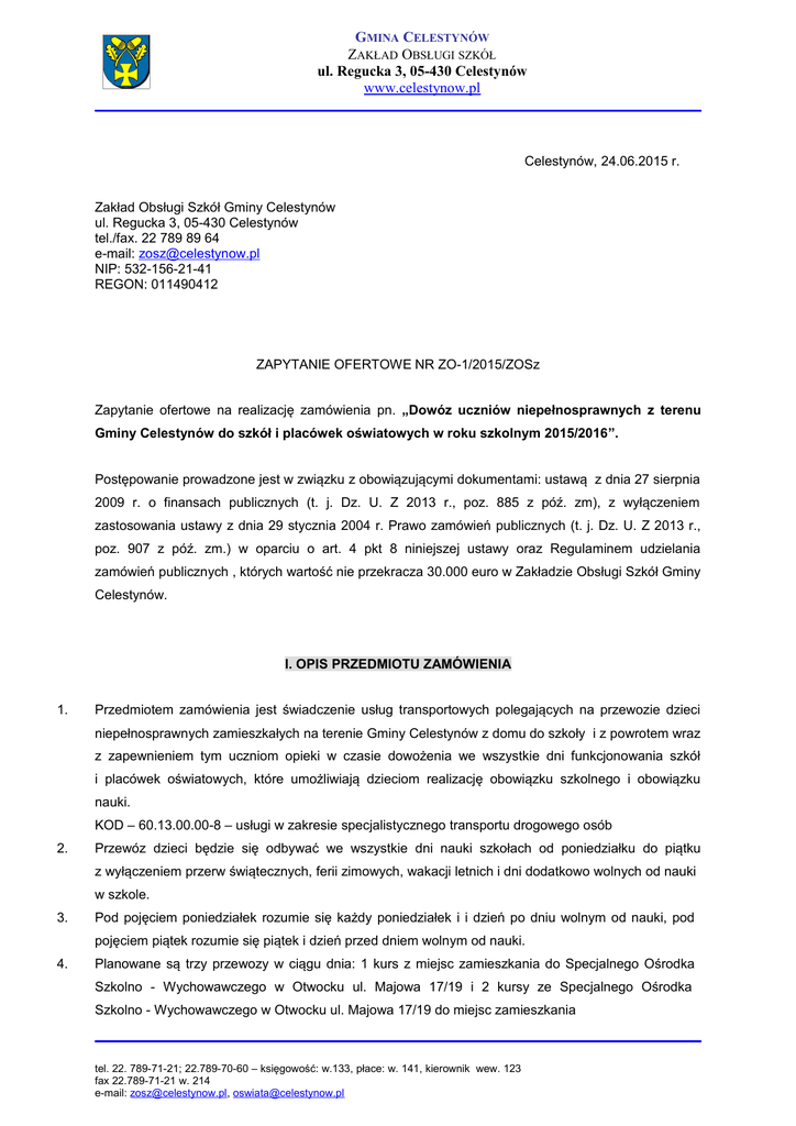 GMINA CELESTYNÓW ZAKŁAD OBSŁUGI SZKÓŁ ul. Regucka 3, 05-430 Celestynów www.celestynow.pl Celestynów, 24.06.2015 r. Zakład Obsługi Szkół Gminy Celestynów ul. Regucka 3, 05-430 Celestynów tel./fax. 22 789 89 64 e-mail: [email protected] NIP: 532-156-21-41 REGON: 011490412 ZAPYTANIE OFERTOWE NR ZO-1/2015/ZOSz Zapytanie ofertowe na realizację zamówienia pn. „Dowóz uczniów niepełnosprawnych z terenu Gminy Celestynów do szkół i placówek oświatowych w roku szkolnym 2015/2016”. Postępowanie prowadzone jest w związku z obowiązującymi dokumentami: ustawą z dnia 27 sierpnia 2009 r. o finansach publicznych (t. j. Dz. U. Z 2013 r., poz. 885 z póź. zm), z wyłączeniem zastosowania ustawy z dnia 29 stycznia 2004 r. Prawo zamówień publicznych (t. j. Dz. U. Z 2013 r., poz. 907 z póź. zm.) w oparciu o art. 4 pkt 8 niniejszej ustawy oraz Regulaminem udzielania zamówień publicznych , których wartość nie przekracza 30.000 euro w Zakładzie Obsługi Szkół Gminy Celestynów. I. OPIS PRZEDMIOTU ZAMÓWIENIA 1. Przedmiotem zamówienia jest świadczenie usług transportowych polegających na przewozie dzieci niepełnosprawnych zamieszkałych na terenie Gminy Celestynów z domu do szkoły i z powrotem wraz z zapewnieniem tym uczniom opieki w czasie dowożenia we wszystkie dni funkcjonowania szkół i placówek oświatowych, które umożliwiają dzieciom realizację obowiązku szkolnego i obowiązku nauki. KOD – 60.13.00.00-8 – usługi w zakresie specjalistycznego transportu drogowego osób 2. Przewóz dzieci będzie się odbywać we wszystkie dni nauki szkołach od poniedziałku do piątku z wyłączeniem przerw świątecznych, ferii zimowych, wakacji letnich i dni dodatkowo wolnych od nauki w szkole. 3. Pod pojęciem poniedziałek rozumie się każdy poniedziałek i i dzień po dniu wolnym od nauki, pod pojęciem piątek rozumie się piątek i dzień przed dniem wolnym od nauki. 4. Planowane są trzy przewozy w ciągu dnia: 1 kurs z miejsc zamieszkania do Specjalnego Ośrodka Szkolno - Wychowawczego w Otwocku ul. Majowa 17/19 i 2 kursy ze Specjalnego Ośrodka Szkolno - Wychowawczego w Otwocku ul. Majowa 17/19 do miejsc zamieszkania tel. 22. 789-71-21; 22.789-70-60 – księgowość: w.133, płace: w. 141, kierownik wew. 123 fax 22.789-71-21 w. 214 e-mail: [email protected], [email protected] GMINA CELESTYNÓW ZAKŁAD OBSŁUGI SZKÓŁ ul. Regucka 3, 05-430 Celestynów www.celestynow.pl 4.1. 1 kurs z miejsc zamieszkania do Specjalnego Ośrodka Szkolno - Wychowawczego w Otwocku ul. Majowa 17/19 – w poniedziałek 9 dzieci (w tym dwoje na wózkach inwalidzkich), od wtorku do piątku – pięcioro dzieci (w tym dwoje na wózkach inwalidzkich). Dokładne godziny odbiór ustali przewoźnik z rodzicami. Trasa do szkoły z miejsca zamieszkania: (9 dzieci w tym dwoje na wózkach inwalidzkich) Trasa przejazdu poniedziałek Szacunkowe godziny Szacunkowa odjazdu kilometrów Celestynów ul. Dębowa 5 m 2– 6.45 – 6.50 Celestynów ul. Laskowska 26 i 29 2,5 Celestynów ul. Laskowska 26 i 29- 6.50 – 7.00 Dąbrówka ul. Pogorzelska 36 5,0 Dabrówka ul. Pogorzelska 36 – Jatne 7.00 – 7.20 87 7,7 Jatne 87- Ostrów52 7.20 – 7.30 2,6 Ostrów 52 – Otwock ul. Majowa 17/19 7.30 – 7.50 13,7 Razem 31,5 wtorek - piątek Celestynów ul. Laskowksa 26 i 29 - 6.50 – 7.00 Dąbrówka ul. Pogorzelska 36 5,0 Dabrówka ul. Pogorzelska 36 – Jatne 7.00 – 7.20 87 7,7 Jatne 87- Ostrów52 7.20 – 7.30 2,6 Ostrów 52 – Otwock ul. Majowa 17/19 7.30 – 7.50 13,7 Razem 4.2. liczba 29,0 Trasa powrotu do domu: planowane są dwa kursy powrotne do miejsc zamieszkania. Szacunkowe godziny powrotów: 12.00 -.12.30 i 14.30 -15.30. Dokładne godziny odbioru z ośrodka ustali przewoźnik z ośrodkiem. Liczba dzieci przewożonych z ośrodka do miejsc zamieszkania: - od poniedziałku do czwartku – pięcioro dzieci (w tym dwoje na wózkach inwalidzkich); - piątek – dziewięcioro dzieci (w tym dwoje na wózkach inwalidzkich);. Wyjazd z Otwocka z Ośrodka Szkolno – Wychowawczego ul. Majowa 17/19 ( w tym jedno dziecko na wózku inwalidzkim) godz. 12.00 – 12.20. Trasa przejazdu Dni tygodnia odjazdu i szacunkowe godziny Szacunkowa liczba km Otwock ul. Majowa 17/19 – Od poniedziałku do piątku Ostrów 52 12. - 12.20 (1 dziecko na wózku inwalidzkim) 13,7 Ostrów 52 – Celestynów ul. Laskowska 26 15,3 Razem 29,0 tel. 22. 789-71-21; 22.789-70-60 – księgowość: w.133, płace: w. 141, kierownik wew. 123 fax 22.789-71-21 w. 214 e-mail: [email protected], [email protected] GMINA CELESTYNÓW ZAKŁAD OBSŁUGI SZKÓŁ ul. Regucka 3, 05-430 Celestynów www.celestynow.pl 4.2.2. Wyjazd z Otwocka z Ośrodka Szkolno - Wychowawczego ul. Majowa 17/19 (w tym jedno dziecko na wózku inwalidzkim) godz. 14.30-15.30. poniedziałek - czwartek Trasa przejazdu Szacunkowa liczba kilometrów Otwock ul. Majowa 17/19 - Jatne 87 14,0 Jatne 87 – Pogorzelska 66 ul. 6,00 Dąbrówka ul. Pogorzelska 66 – Celestynów ul. Laskowska 29 5,00 Dabrówka Razem 25,0 piątek Otwock ul. Majowa 17/19 - Jatne 87 14,0 Jatne 87 – Pogorzelska 66 ul. 6,00 Dąbrówka ul. Pogorzelska 66 – Celestynów ul. Laskowska 29 5,00 Celestynów ul. Laskowska 29 – Celestynów ul. Dębowa 5 m 2 2,5 Dabrówka Razem 5. 27,5 Zamawiający zastrzega sobie prawo zmiany rozkładu jazdy tj.: zmiany trasy, jej długości i godzin przewozów uczniów zachowując jednocześnie niezmienną stawę za 1 km przedstawioną w formularzu ofertowym Wykonawcy. O takiej zmianie Zamawiający zawiadomi Wykonawcę fax-em lub drogą elektroniczną z pięciodniowym wyprzedzeniem. 6. Cena jednostkowa za 1 km przewozu, która zostanie podana przez Wykonawcę w formularzu ofertowym będzie obowiązywała w niezmiennej stawce do końca obowiązywania umowy. 7. W cenie powinien być uwzględniony koszt przewozu dzieci wraz z opiekunami, postoju związanego z opieką nad dziećmi – od momentu odebrania dzieci niepełnosprawnych od opiekunów do momentu przekazania dziec