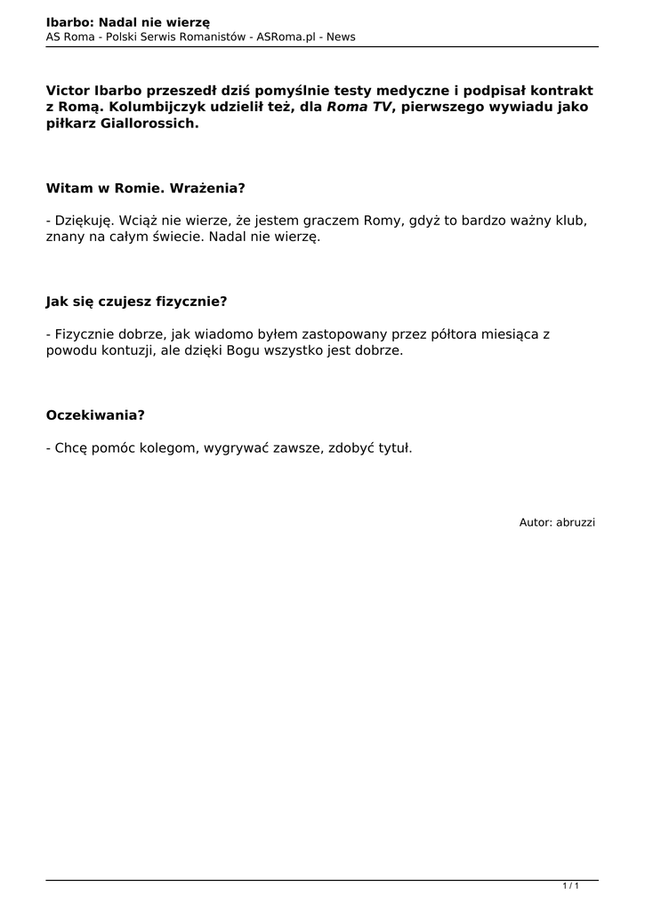 Ibarbo: Nadal nie wierzę AS Roma - Polski Serwis Romanistów - ASRoma.pl - News Victor Ibarbo przeszedł dziś pomyślnie testy medyczne i podpisał kontrakt z Romą. Kolumbijczyk udzielił też, dla Roma TV, pierwszego wywiadu jako piłkarz Giallorossich. Witam w Romie. Wrażenia? - Dziękuję. Wciąż nie wierze, że jestem graczem Romy, gdyż to bardzo ważny klub, znany na całym świecie. Nadal nie wierzę. Jak się czujesz fizycznie? - Fizycznie dobrze, jak wiadomo byłem zastopowany przez półtora miesiąca z powodu kontuzji, ale dzięki Bogu wszystko jest dobrze. Oczekiwania? - Chcę pomóc kolegom, wygrywać zawsze, zdobyć tytuł. Autor: abruzzi 1/1 Powered by TCPDF (www.tcpdf.org)