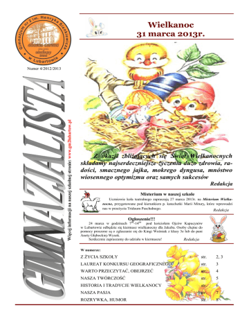Wielkanoc 31 marca 2013r. Więcej informacji na naszej szkolnej stronie: www.gm2lubartow.pl Numer 4/2012/2013 Z okazji zbliżających się Świąt Wielkanocnych składamy najserdeczniejsze życzenia dużo zdrowia, radości, smacznego jajka, mokrego dyngusa, mnóstwo wiosennego optymizmu oraz samych sukcesów Redakcja Misterium w naszej szkole Uczniowie koła teatralnego zapraszają 27 marca 2013r. na Misterium Wielkanocne, przygotowane pod kierunkiem p. katechetki Marii Mitury, które wprowadzi nas w przeżycia Triduum Paschalnego. Redakcja Ogłoszenie!!! 24 marca w godzinach 700-1400 pod kościołem Ojców Kapucynów w Lubartowie odbędzie się kiermasz wielkanocny dla Jakuba. Osoby chętne do pomocy proszone są o zgłaszanie się do Kingi Woźniak z klasy 3e lub do pani Anety Głębockiej-Wysok. Serdecznie zapraszamy do udziału w kiermaszu! Redakcja W numerze: Z ŻYCIA SZKOŁY str. 2, 3 LAUREAT KONKURSU GEOGRAFICZNEGO str. 3 WARTO PRZECZYTAĆ, OBEJRZEĆ str. 4 NASZA TWÓRCZOŚĆ str. 5 HISTORIA I TRADYCJE WIELKANOCY str. 6 NASZA PASJA str. 7 ROZRYWKA, HUMOR str. 8 Z ŻYCIA SZKOŁY WALENTYNKOWY KONKURS RECYTATORSKI Dnia 7 lutego 2013 r. odbył się walentynkowy konkurs recytatorski "Najpiękniejsze strofy o miłości" zorganizowany przez panią Grażynę Antoniuk i Urszulę Dobosz-Chruścik. W konkursie brało udział 21 uczniów z klas I-III, którzy zinterpretowali wiersze znanych poetów, m.in. A. Mickiewicza, K. I. Gałczyńskiego, A. Asnyka, M. PawlikowskiejJasnorzewskiej, J. Twardowskiego czy C. Miłosza. Jury musiało dokonać niełatwego wyboru laureatów. Uczestnicy zaprezentowali się z jak najlepszej strony i wykazali wysoki poziom interpretacji tekstów. Wszystkie występy przeniosły słuchaczy w świat miłości. Wyniki: 1. miejsce - Aleksandra Bochniak IIIb 2. miejsce - Barbara Przysiadła IIIb 3. miejsce - Wiktoria Różyk IIIb Wyróżnienia zdoby: Emilia Kasprzak IIb, Patrycja Machoń IIId, Natalia Stanisławska Ia, Sylwia Piątek Ib, Bartłomiej Bochniak Id. Każdy uczestnik konkursu otrzymał pamiątkowy dyplom i walentynkowego lizaka, zaś uczniowie nagrodzeni i wyróżnieni - książki i nagrody rzeczowe. Wszystkim uczniom biorącym udział serdecznie dziękujemy za chwilę wzruszeń oraz życzymy dalszych sukcesów w tej dziedzinie! Sylwia Piątek KONKURS ORTOGRAFICZNO-JĘZYKOWY Dnia 28.03.2013r. w stołówce szkolnej odbył się konkurs na „Najlepszego Polonistę w szkole”. Chętnych do konkursu było wielu z pierwszych, drugich jak i trzecich klas. Wszystkie zadania obejmowały materiał z gramatyki. Zadania były ułożone według wieku, więc nikomu nie powinny sprawić większego problemu. Wyniki konkursu przedstawiają się następująco: Klasy I I miejsce - Angelika Mucha i Oliwia Wrzos kl. Ib II miejsce - Patryk Sędowski kl. Ib III miejsce - Dominika Czekierda kl. I b i Natalia Matyjaszczyk kl. Ib DZIEŃ WAGAROWICZA! Pierwszy dzień wiosny, czyli 21 marca to nieformalne święto (zwyczaj) opuszczania zajęć szkolnych przez uczniów - od dawien dawna jest potocznie zwany Dniem Wagarowicza. Niektóre szkoły w tym dniu próbują urządzać różne imprezy na świeżym powietrzu lub wycieczki klasowe, np.: tradycyjne topienie Marzanny – symbolu odchodzącej zimy. Poprzez takie imprezy próbuje się ograniczyć na swój sposób wagary. Naszym zdaniem dzień ten powinien być w szkole luźny, bez Klasy II I miejsce – Agata Szymbor kl. IIb II miejsce – Dorota Malesa kl. IIa III miejsce – Martyna Pacek kl. IIb Klasy III I miejsce - Rafał Grambur kl. IIIa i Anna Humeniuk kl. IIIb II miejsce - Barbara Przysiadła kl. IIIb III miejsce - Kamil Kubera kl. IIIc i Anna Lato kl. IIIb Wyróżnienia zdobyły: Aleksandra Żyła kl. IIb i Bogumiła Olejniczek kl. IIb Gratulujemy zwycięstwa! Karolina Kusyk Natalia Augustyniak klasówek czy sprawdzania obecności. Według nas, Dzień Wagarowicza jest ucieczką od szkolnej codzienności. W tym dniu uczniowie organizują sobie czas według własnych upodobań. W naszej szkole Dzień Wagarowicza jest obchodzony w różnorodny sposób począwszy od wycieczek, konkursów aż do rozmaitych zabaw. My uczniowie, preferujemy taki sposób spędzania tego dnia niż bezsensowne włóczenie się po ulicach miasta. Ciekawostka! Klaudia Ligęza Słowo "wagary" pochodzi Julia Rusinek od łacińskiego słowa vagari Paulina Zagajska oznaczającego błąkanie się MINIKONKURS ROZWIĄZANY!!! SUKCES DZIEWCZĄT W KOSZYKÓWCE Informujemy, że zagadkę: „Czy dobrze znasz swoją szkołę?” rozwiązał Krystian Fil z kl. IIId. Szczegółem tym był fragment tablicy, znajdującej się w bibliotece szkolnej, gdzie jest zamieszczona wystawa o Henryku Sienkiewiczu. Ponadto konkurs „Zgadnij, kto to?” dotyczący rozpoznawania zamieszczonych karykatur odgadli: Julia Rusinek kl. Ib – Karykatura nr 1: Christiano Ronaldo, Celina Małyska kl. IIIe - Karykatura nr 2: Chuck Noris, Natalia Domin kl. Ib – Karykatura nr 3: Tomasz Adamek, Dominika Czekierda kl. Ib – Karykatura nr 4: Donald Tusk i Iza Szczygieł kl. Ib – Karykatura nr 6: Kuba Wojewódzki. Gratulujemy!!! Dziewczyny z naszego Gimnazjum brały udział w zawodach w koszykówce. Swoją przygodę rozpoczęły od etapu powiatowego. Dzięki wygranej z zespołem z Firleja, nasza drużyna przeszła do etapu rejonowego w Rykach. Tam wygrały z drużyną z Końskowoli, a w finale zagrały z zespołem z Ryk, który pokonały 34:14. Taki wynik zapewnił im awans do zawodów wojewódzkich w Krasnymstawie. 12 marca nasze koszykarki pojechały na zawody wojewódzkie. W zawodach znalazło się 6 najlepszych drużyn: z Lubartowa, Białej Podlaskiej, Chełma, Lublina, Kraśnika i Krasnegostawu. Dziewczyny po przegranej z Lublinem spotkały się z drużyną z Kraśnika, którą pokonały. W walce o trzecie miejsce z drużyną z Krasnegostawu niestety przegrały 23:28. W końcowej klasyfikacji wywalczyły więc IV miejsce w województwie lubelskim, co jest dużym sukcesem. Redakcja Anna Grzes