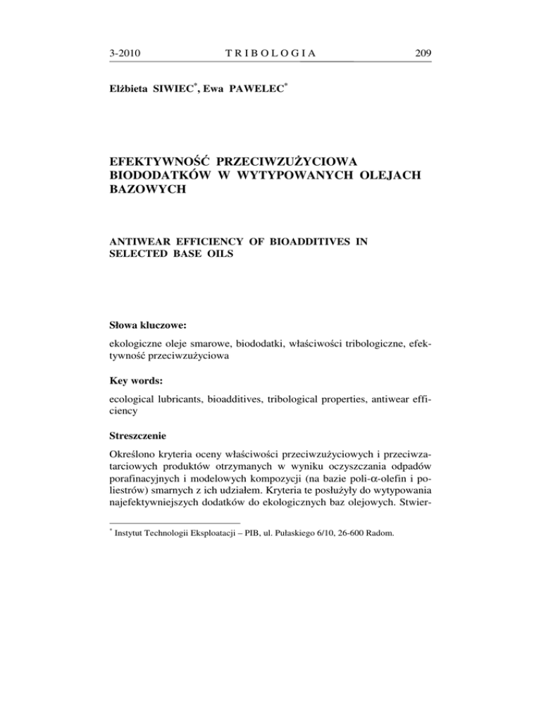 3-2010 TRIBOLOGIA 209 Elżbieta SIWIEC*, Ewa PAWELEC* EFEKTYWNOŚĆ PRZECIWZUŻYCIOWA BIODODATKÓW W WYTYPOWANYCH OLEJACH BAZOWYCH ANTIWEAR EFFICIENCY OF BIOADDITIVES IN SELECTED BASE OILS Słowa kluczowe: ekologiczne oleje smarowe, biododatki, właściwości tribologiczne, efektywność przeciwzużyciowa Key words: ecological lubricants, bioadditives, tribological properties, antiwear efficiency Streszczenie Określono kryteria oceny właściwości przeciwzużyciowych i przeciwzatarciowych produktów otrzymanych w wyniku oczyszczania odpadów porafinacyjnych i modelowych kompozycji (na bazie poli-α-olefin i poliestrów) smarnych z ich udziałem. Kryteria te posłużyły do wytypowania najefektywniejszych dodatków do ekologicznych baz olejowych. Stwier* Instytut Technologii Eksploatacji – PIB, ul. Pułaskiego 6/10, 26-600 Radom. 210 TRIBOLOGIA 3-2010 dzono, że naefektywniejszym, spośród otrzymanych produktów, dodatkiem smarnym jest produkt otrzymany w wyniku oczyszczania szlamów porafinacyjnych (PL4). WPROWADZENIE Niebezpiecznym i powszechnie występującym źródłem skażenia środowiska naturalnego są produkty smarowe, dlatego coraz więcej ośrodków badawczych w kraju i na świecie zajmuje się problematyką zmniejszenia uciążliwości ekologicznej ich wytwarzania, eksploatacji i utylizacji [L. 1–3]. Wymóg stosowania składników spełniających wysokie kryteria ekologiczne, w tym wykazujących wysoki stopień biodegradacji po przeniknięciu do środowiska, dotyczy zarówno olejów bazowych (podstawowego składnika środków smarowych), jak i dodatków uszlachetniających, które powinny być nietoksyczne dla mikroorganizmów, ryb i ssaków [L. 4–6]. Znaczna ilość powszechnie stosowanych dodatków komercyjnych zawiera pierwiastki szkodliwe dla organizmów żywych (np. siarkę, chlor, fosfor), co pogarsza właściwości ekologiczne środków smarowych. Z tego też względu realizowane są prace mające na celu zastąpienie ich nową generacją dodatków przyjaznych dla środowiska, które jednocześnie nie pogorszyłyby właściwości eksploatacyjnych środka smarowego. Kryteriom takim odpowiadają związki zawierające aktywne grupy funkcyjne: estrową, hydroksylową, karboksylową i in. [L. 7]. Surowcem do otrzymywania tego typu dodatków mogą być odpady porafinacyjne olejów roślinnych [L. 8]. Wzrost gospodarczy na świecie wiąże się z rosnącą ilością odpadów, konsekwencją czego są straty materiałowe i energetyczne, zanieczyszczenie środowiska i niekorzystny wpływ na zdrowie i jakość życia społeczeństwa. Zagospodarowanie nawet części odpadów przyczyni się do wzrostu bezpieczeństwa ekologicznego, bezpieczeństwa żywności i poziomu ochrony zdrowia człowieka. Taka polityka jest wyraźnie podkreślona i traktowana priorytetowo zarówno w ustawodawstwie polskim, jak i Unii Europejskiej, a podjęcie działań w zakresie wdrożenia rozwiązań proekologicznych zarówno w obszarze systemowych regulacji prawnych, jak również w obszarze technologicznym jest jednym z kluczowych kierunków badawczych w Polsce i Unii Europejskiej. Celem podjętych badań było określenie kryteriów oceny efektywności smarnej otrzymanych produktów i modelowych kompozycji z ich 3-2010 TRIBOLOGIA 211 udziałem oraz ocena ich efektywności tribologicznej w biodegradowalnych bazach olejowych. OBIEKTY I METODY BADAŃ Obiektami badań było 10 produktów otrzymanych w wyniku oczyszczania odpadów porafinacyjnych oleju rzepakowego. Produkty stanowiące potencjalne dodatki uszlachetniające wyizolowano ze szlamów pohydratacyjnych, technicznych kwasów porafinacyjnych oraz tłuszczu kanałowego. Sposoby otrzymywania poszczególnych produktów oraz ich oznaczenia przedstawiono w Tab. 1. Tabela 1. Metody otrzymania biododatków Table 1. Methods of obtaining the bioadditives Surowiec Sposób otrzymania biododatku Oznaczenie Ekstrakcja acetonem w aparacie Soxleta PL1 Wielostopniowa ekstrakcja acetonem PL2 Szlamy Ekstrakcja mieszaniną heksan-aceton (+1% wody) PL3 pohydratacyjne Ekstrakcja mieszaniną benzyna ekstrakcyjna-aceton PL4 (+1% wody) Odwirowanie i sączenie pod obniżonym ciśnieniem KK1 Techniczne kwasy Oczyszczanie za pomoc ą ziemi biel ą cej Jeltar (2%), porafinacyjne KK2 odwirowanie, sączenie pod obniżonym ciśnieniem Odwirowanie i sączenie pod obniżonym ciśnieniem TK1 Oczyszczanie za pomocą ziemi bielącej Jeltar (2%), TK2 odwirowanie, sączenie pod obniżonym ciśnieniem Tłuszcz kanałowy Oddziaływanie amoniaku w podwyższonej temperaTK3 turze Oddziaływanie amoniaku i powietrza w temp. pokoTK4 jowej Produkty te zastosowano jako dodatki do wytypowanych baz olejowych. Jako bazy olejowe zastosowano dwa oleje syntetyczne (estrowy – PRIOLUBE, węglowodorowy – PAO4), charakteryzujące się wysoką biodegradowalnością (≥70%). Kompozycje smarowe przygotowano w warunkach laboratoryjnych poprzez wprowadzenie do oleju bazowego odpowiedniej naważki dodatku (od 1% do 5%). Po dokładnym wymieszaniu dodatków z olejem bazowym, w celu sprawdzenia stabilności kompozycji przechowywano je przez 48 godz. w temp. pokojowej. 212 TRIBOLOGIA 3-2010 Testy tribologiczne. Właściwości smarne otrzymanych produktów i ich kompozycji w wytypowanych olejach bazowych oceniano na podstawie obciążenia zacierającego (Pt) oraz granicznego obciążenia zużycia (Goz(40)). Testy tribologiczne realizowano za pomocą aparatu czterokulowego T-02. Elementami testowymi były kulki łożyskowe o średnicy 1/2", wykonane ze stali łożyskowej ŁH15 (Ra = 0,032 µm, 60÷65 HRC). Obciążenie zacierające Pt wyznaczano zgodnie z PN-76/C-04147. Oznaczenie polega na przeprowadzeniu biegu zespołu czterech kulek stalowych w obecności badanego środka smarowego pod wzrastającym w sposób ciągły obciążeniem, aż do wystąpienia zacierania, sygnalizowanego nagłym wzrostem oporów ruchu. Badania prowadzono w następujących warunkach: prędkość obrotowa wrzeciona – 500±20 