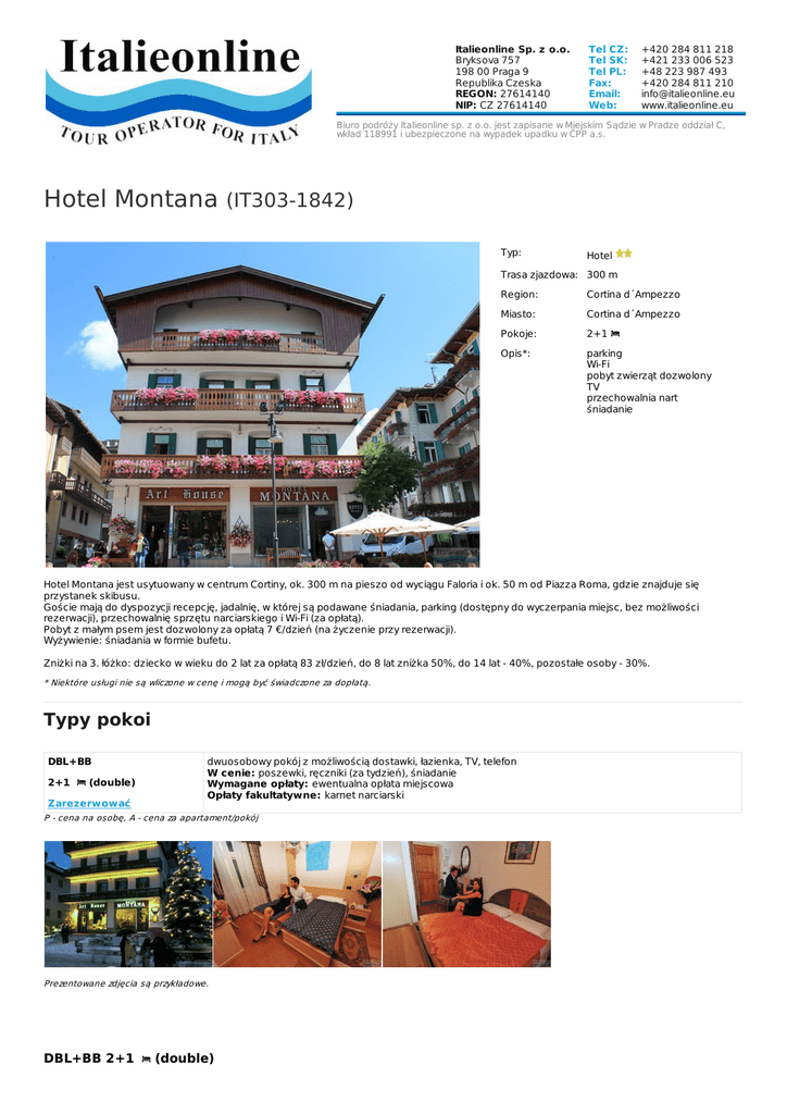 Italieonline Sp. z o.o. Bryksova 757 198 00 Praga 9 Republika Czeska REGON: 27614140 NIP: CZ 27614140 Tel CZ: Tel SK: Tel PL: Fax: Email: Web: +420 284 811 218 +421 233 006 523 +48 223 987 493 +420 284 811 210 [email protected] www.italieonline.eu Biuro podróży Italieonline sp. z o.o. jest zapisane w Miejskim Sądzie w Pradze oddział C, wkład 118991 i ubezpieczone na wypadek upadku w ČPP a.s. Hotel Montana (IT303-1842) Typ: Hotel Trasa zjazdowa: 300 m Region: Cortina d´Ampezzo Miasto: Cortina d´Ampezzo Pokoje: 2+1 Opis*: parking Wi-Fi pobyt zwierząt dozwolony TV przechowalnia nart śniadanie Hotel Montana jest usytuowany w centrum Cortiny, ok. 300 m na pieszo od wyciągu Faloria i ok. 50 m od Piazza Roma, gdzie znajduje się przystanek skibusu. Goście mają do dyspozycji recepcję, jadalnię, w której są podawane śniadania, parking (dostępny do wyczerpania miejsc, bez możliwości rezerwacji), przechowalnię sprzętu narciarskiego i Wi-Fi (za opłatą). Pobyt z małym psem jest dozwolony za opłatą 7 €/dzień (na życzenie przy rezerwacji). Wyżywienie: śniadania w formie bufetu. Zniżki na 3. łóżko: dziecko w wieku do 2 lat za opłatą 83 zł/dzień, do 8 lat zniżka 50%, do 14 lat - 40%, pozostałe osoby - 30%. * Niektóre usługi nie są wliczone w cenę i mogą być świadczone za dopłatą. Typy pokoi DBL+BB dwuosobowy pokój z możliwością dostawki, łazienka, TV, telefon W cenie: poszewki, ręczniki (za tydzień), śniadanie Wymagane opłaty: ewentualna opłata miejscowa Opłaty fakultatywne: karnet narciarski 2+1 (double) Zarezerwować P - cena na osobę, A - cena za apartament/pokój Prezentowane zdjęcia są przykładowe. DBL+BB 2+1 (double) Sezon Terminy Cena za noc / P Początek pobytu Koniec pobytu Min. ilość nocy A 08.01. - 03.02.2017 11.03. - 01.04.2017 229 zł Sob, Ndz Sob, Ndz 1 B 04.02. - 10.02.2017 318 zł Sob, Ndz Sob, Ndz 1 C 11.02. - 10.03.2017 383 zł Sob, Ndz Sob, Ndz 1 https://www.italieonline.eu/pl/cortina-d-ampezzo/hotel-montana-1842.html www.ITALIEONLINE.eu TOUR OPERATOR FOR ITALY