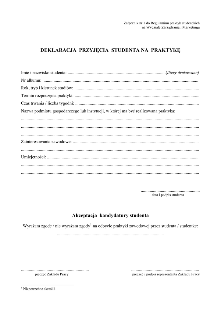Załącznik nr 1 do Regulaminu praktyk studenckich na Wydziale Zarządzania i Marketingu DEKLARACJA PRZYJĘCIA STUDENTA NA PRAKTYKĘ Imię i nazwisko studenta: ........................................................................................(litery drukowane) Nr albumu: ............................................................................................................................................ Rok, tryb i kierunek studiów: ................................................................................................................ Termin rozpoczęcia praktyki: ................................................................................................................ Czas trwania / liczba tygodni: ............................................................................................................... Nazwa podmiotu gospodarczego lub instytucji, w której ma być realizowana praktyka: ................................................................................................................................................................ ................................................................................................................................................................ ................................................................................................................................................................ Zainteresowania zawodowe: ................................................................................................................. ................................................................................................................................................................ Umiejętności: ......................................................................................................................................... ................................................................................................................................................................ ................................................................................................................................................................ ..................................................... data i podpis studenta Akceptacja kandydatury studenta Wyrażam zgodę / nie wyrażam zgody1 na odbycie praktyki zawodowej przez studenta / studentkę: ................................................................................................ ............................................................. pieczęć Zakładu Pracy 1 Niepotrzebne skreślić ............................................................. pieczęć i podpis reprezentanta Zakładu Pracy