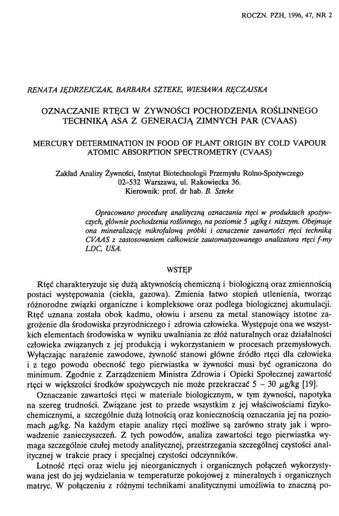 ROCZN. PZH, 1996, 47, NR 2 RENATA JĘDRZEJCZAK, BARBARA SZTEKE, WlESłAWA RĘCZAJSKA O Z N A C Z A N IE R T Ę C I W ŻY W N O ŚC I P O C H O D Z E N IA R O Ś L IN N E G O T E C H N IK Ą A SA Z G E N E R A C JĄ Z IM N Y C H P A R (CV A A S) MERCURY DETERMINATION IN FOOD OF PLANT ORIGIN BY COLD VAPOUR ATOMIC ABSORPTION SPECTROMETRY (CVAAS) Zakład Analizy Żywności, Instytut Biotechnologii Przemysłu Rolno-Spożywczego 02-532 Warszawa, ul. Rakowiecka 36. Kierownik: prof. dr hab. B. Szteke Opracowano procedurę analityczną oznaczania rtęci w produktach spożyw czych, głównie pochodzenia roślinnego, na poziomie 5 ng/kg i niższym. Obejmuje ona mineralizację mikrofalową próbki i oznaczenie zawartości rtęci techniką CVAAS z zastosowaniem całkowicie zautomatyzowanego analizatora rtęci f-my LDC, USA. WSTĘP R tęć charakteryzuje się dużą aktywnością chem iczną i biologiczną oraz zm iennością postaci w ystępow ania (ciekła, gazowa). Z m ienia łatwo stopień utlenienia, tw orząc różnoro d n e związki organiczne i kom pleksowe oraz podlega biologicznej akum ulacji. R tęć uznana została obok kadm u, ołowiu i arsenu za m etal stanowiący istotne za grożenie dla środow iska przyrodniczego i zdrowia człowieka. W ystępuje ona we wszyst kich elem entach środow iska w wyniku uw alniania ze złóż naturalnych oraz działalności człowieka związanych z jej produkcją i wykorzystaniem w procesach przemysłowych. W yłączając narażenie zawodowe, żywność stanowi główne źródło rtęci dla człowieka i z tego pow odu obecność tego pierw iastka w żywności musi być ograniczona do m inim um . Z godnie z Z arządzeniem M inistra Z drow ia i O pieki Społecznej zaw artość rtęci w większości środków spożywczych nie m oże przekraczać 5 - 3 0 /xg/kg [19]. O znaczanie zawartości rtęci w m ateriale biologicznym, w tym żywności, napotyka na szereg trudności. Zw iązane jest to przede wszystkim z jej właściwościami fizyko chemicznym i, a szczególnie dużą lotnością oraz koniecznością oznaczania jej na pozio m ach /ig/kg. N a każdym etapie analizy rtęci możliwe są zarów no straty jak i w pro w adzenie zanieczyszczeń. Z tych powodów, analiza zawartości tego pierw iastka wy m aga szczególnie czułej m etody analitycznej, przestrzegania szczególnej czystości an al itycznej w trakcie pracy i specjalnej czystości odczynników. L otność rtęci oraz wielu jej nieorganicznych i organicznych połączeń wykorzysty w ana jest do jej wydzielania w tem peraturze pokojowej z m ineralnych i organicznych matryc. W połączeniu z różnymi technikam i analitycznymi umożliwia to znaczną p o 224 R. Jędrzejczak i in. Nr 2 praw ę czułości oznaczeń tego pierw iastka. Przykłady zastosow ań różnych technik anali tycznych do oznaczania całkowitej zawartości rtęci przedstaw ia tabela I. W śród nich, C V A A S należy do najczęściej stosowanych m etod oznaczania rtęci w różnych m ateriałach biologicznych. Jest ona czuła, specyficzna i pozwala n a oz naczanie rtęci na poziom ach /tg/kg i /Ag/l, zwłaszcza przy zastosow aniu dodatkow ego zatężania p a r rtęci poprzez tw orzenie am algam atów, z m etalam i takim i jak złoto i platyna [3, 4, 7, 8, 11, 15-17]. Istotne jest również, że koszt adaptacji pow szechnie stosowanych spektrofotom etrów absorpcji atom ow ej nie je st zbyt wysoki. M etoda ta o p arta jest na redukcji rtęci (II) do rtęci elem entarnej pod wpływem czynnika re dukującego (SnC h, NaBH,i). W ynika z tego konieczność całkowitego rozłożenia anali zowanej m atrycy i przeprow adzenia organicznych połączeń rtęci w postać jonow ą lub luźno zw iązane formy, któ re jedynie tą m etodą m ogą być analizowane. R ozkład substancji organicznej analizowanych próbek przeprow adzany jest najczę ściej poprzez ich ogrzew anie w samym kwasie azotowym lub w m ieszaninie z kwasem siarkowym, czasem z dodatkiem substancji ułatwiających i przyspieszających u tleni anie, jak nadm anganian potasowy, dw uchrom ian potasowy czy pięciotlenek w anadu. Proces ten prow adzony jest bądź w bom bach teflonowych ogrzewanych konw encjon alnie bądź m ikrofalow o, a także w naczyniach szklanych połączonych z chłodnicą zw rotną. M ożliwe jest rów nież przeprow adzanie m ineralizacji na zim no (w łaźni lo dowej), stosując m ieszaninę silnych utleniaczy. M ineralizacja p róbek wym agana jest w większości stosowanych technik anality cznych. W yjątek stanowi neutronow a analiza aktywacyjna (IN A A ) [3], w przypadku której m ineralizacja p róbek nie jest wymagana. T echnika ta stosow ana jest również jako odwoławcza, do potw ierdzania wyników otrzymywanych innymi m etodam i a także jak o preferencyjna przy certyfikacji biologicznych m ateriałów odniesienia. Pozostałe techniki, przedstaw ione w tabeli I, charakteryzują się również niskimi granicam i wyk rywalności, zwłaszcza fluorescencyjna sp ektrom etria atom ow a (A FS) [18] oraz technika ICP, szczególnie w połączeniu z generacją zimnych par [1, 14]. C elem niniejszej pracy było opracow anie procedury analitycznej oznaczania zaw ar tości rtęci w środkach spożywczych pochodzenia roślinnego na poziom ie 5 Mg/kg, techniką CV A A S, z zastosow aniem nowoczesnego, całkowicie zautom atyzow anego analizatora rtęci, tj. Fully A u to m ated M ercury Analysis System M odel 3200 firmy LD C, USA. CZĘŚĆ DOŚWIADCZALNA Aparatura Automatyczny analizator rtęci f-my LDC z detektorem rtęci - mercury Monitor 3200 detec tor, automatycznym podajnikiem próbek - AM2000 autoMetric autosampler (na 114 probówek) i integratorem computing integrator; piec mikrofalowy f-my CEM model MDS 2000. Naczynia laboratoryjne Pojemniki teflonowe do mineralizacji mikrofalowej oraz szkło laboratoryjne ogólnego zastos owania, które przed użyciem pozostawiono na 24 h w rozcieńczonym kwasie azotowym (1 + 1) a następnie dokładnie płukano wodą. Nr 2 