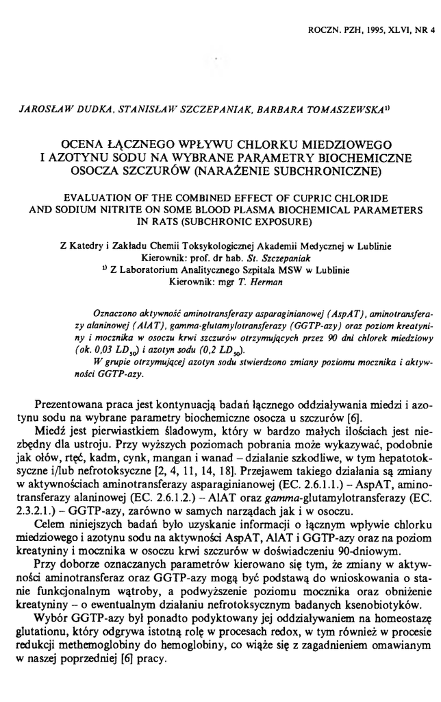 ROCZN. PZH, 1995, XLVI, NR 4 J A R O S Ł A W D UD KA, S T A N IS Ł A W S Z C Z E P A N IA K , B A R B A R A T O M A S Z E W S K A 11 OCENA ŁĄCZNEGO WPŁYWU CHLORKU MIEDZIOWEGO I AZOTYNU SODU NA WYBRANE PARAM ETRY BIOCHEMICZNE OSOCZA SZCZURÓW (NARAŻENIE SUBCHRONICZNE) EV A LU A TIO N O F T H E COM BINED E FFEC T O F C U PR IC C H L O R ID E A N D SODIUM N IT R IT E O N SOME BLOOD PLASM A B IO CH EM ICAL PA RA M ETER S IN RATS (SU B CH R O N IC EXPO SURE) Z K atedry i Z akładu Chemii Toksykologicznej Akademii Medycznej w Lublinie Kierownik: prof. d r hab. St. Szczepaniak 0 Z L aboratorium Analitycznego Szpitala MSW w Lublinie Kierownik: mgr T. Herman Oznaczono aktywność aminotransferazy asparaginianowej (A sp A T ), aminotransferazy alaninowej (A lA T ), gamma-glutamylotransferazy (G G TP-azy) oraz poziom kreatyni ny i mocznika w osoczu krwi szczurów otrzymujących przez 90 dni chlorek miedziowy (ok. 0,03 L D 5C) i azotyn sodu (0,2 L D m). W grupie otrzymującej azotyn sodu stwierdzono zmiany poziomu mocznika i aktyw ności GGTP-azy. Prezentowana praca jest kontynuacją badań łącznego oddziaływania miedzi i azo tynu sodu na wybrane parametry biochemiczne osocza u szczurów [6]. Miedź jest pierwiastkiem śladowym, który w bardzo małych ilościach jest nie zbędny dla ustroju. Przy wyższych poziomach pobrania może wykazywać, podobnie jak ołów, rtęć, kadm, cynk, mangan i wanad - działanie szkodliwe, w tym hepatotoksyczne 1ДиЬ nefrotoksyczne [2, 4, 11, 14, 18]. Przejawem takiego działania są zmiany w aktywnościach aminotransferazy asparaginianowej (ЕС. 2.6.1.1.) - AspAT, amino transferazy alaninowej (ЕС. 2.6.1.2.)-A lA T oraz #a/wHa-glutamylotransferazy (ЕС. 2.3.2.1.) - GGTP-azy, zarówno w samych narządach jak i w osoczu. Celem niniejszych badań było uzyskanie informacji o łącznym wpływie chlorku miedziowego i azotynu sodu na aktywności AspAT, AlAT i GGTP-azy oraz na poziom kreatyniny i mocznika w osoczu krwi szczurów w doświadczeniu 90-dniowym. Przy doborze oznaczanych parametrów kierowano się tym, że zmiany w aktyw ności aminotransferaz oraz GGTP-azy mogą być podstawą do wnioskowania o sta nie funkcjonalnym wątroby, a podwyższenie poziomu mocznika oraz obniżenie kreatyniny - o ewentualnym działaniu nefrotoksycznym badanych ksenobiotyków. Wybór GGTP-azy był ponadto podyktowany jej oddziaływaniem na homeostazę glutationu, który odgrywa istotną rolę w procesach redox, w tym również w procesie redukcji methemoglobiny do hemoglobiny, co wiąże się z zagadnieniem omawianym w naszej poprzedniej [6] pracy. 384 J. D udka i in. Nr 4 M A T ER IA Ł I M ETO D Y K A Badania w ykonano na 48 białych szczurach - samcach rasy Wistar, pochodzących z hodowli zwierząt laboratoryjnych w Brwinowie k. Warszawy. Zwierzęta o początkowej masie 220-270 g, otrzymywały paszę standardow ą LSM i wodą ad libitum. Szczury kontrolne i badane otrzymywały per os odpowiednio wodę destylowaną lub badane związki w odstępach dobowych przez 90 dni. Zwierzęta podzielono na cztery grupy po 12 sztuk: I grupa otrzymywała azotyn sodowy w dawce 30 mg/kg m.c. x dzień (0,2 LD,,,); II grupa - chlorek miedziowy w ilości 4,67 mg/kg m.c. x dzień (ok. 0,03 L D W); III grupa - chlorek miedziowy i azotyn sodu w daw kach jak wyżej; IV grupa (kontrolna) otrzymywała wodę destylowaną. R oztw ory azotynu sodu, chlorku miedziowego i wodę destylowaną podaw ano szczurom doustnie w objętości 0,5 cm 3/200 g. m.c. W celu uniknięcia ewentualnej interakcji chemicznej między badanymi związkami (C u G 2 i N aN O j) w przewodzie pokarm owym szczurów, grupie III podaw ano roztwory chlorku miedziowego i azotynu sodu w odstępach czterech godzin. Wszystkie oznaczenia w ykonano w osoczu krwi na analizatorze biochemicznym COBAS MI R A S szwajcarskiej firmy Hoffmann-La Roche. Krew pobrano 24 godziny po ostatnim (dziewięćdziesiątym) podaniu badanych związków. Pom iar aktywności am inotransferazy alaninowej wykonano m etodą Henley- Wróblewskiego z uwzględnieniem zaleceń M iędzynarodowej Federacji Chemii Klinicznej (1FCC) z 1980 r. [8], am ino transferazy asparaginianowej wg Karmen z późniejszymi modyfikacjami oraz uwzględnieniem zaleceń IFfcC z 1978 [7]. O znaczania aktywności gam/rra-glutamylotransferazy wykonano posługując się m etodą Szasz [13], używając jako substratu L-gamm a-glutamylo-p-nitroanilidu w obecności glicyloglicyny. Poziom kreatyniny oznaczano wg Larsen [9], a mocznika m etodą Tiffany [15]. D o oznaczania mocznika zastosowano gotowy, zestaw odczynników firmy Cormay, a pozostałe param etry oznaczano używając zestawów firmy Pointę Scientific Inc. WYNI KI I ICH O M Ó W IEN IE Wyniki oznaczeń badanych parametrów przedstawiono w tabelach I i II, podając przedziały ufności (x ± t j ) oraz istotności różnic między wartościami średnimi w grupach badanych a grupą kontrolną. T a b e l a I. Aktywność (IU /dm 3) am inotransferazy alaninowej (A1AT) i asparginianowej (AspAT) oraz gamma-glutamylotransferazy (GGTP-azy) w osoczu krwi szczurów The activity (IU /dm 3) o f alanine am inotransferase (A1AT), aspartate am inotransferase (AspAT) and g<7/w??a-glutamyltransferase (GGTP-azy) in blood plasma o f rats * -p < 0 ,0 2 Nr 4 Chlorek miedziowy i azotyn sodu a parametry osocza krwi 385 Wyniki dotyczące oznaczeń enzymatycznych (Tab. I.) wskazują, że grupy zwierząt otrzymujące pojedyncze ksenobiotyki, jak i narażone na ich łączne działanie nie wykazują zmian w aktywnościach badanych aminotransferaz. W badaniach Drożdża i wsp. [5], w których świnkom morskim podawano dwu tlenek azotu, również nie stwierdzono istotnych zmian aktywności osoczowej A1AT, a aktywność AspAT była nieznacznie niższa w porównaniu z grupą kontrolną. W tej samej pracy stwierdzono wyraźne podwyższenie (ok. 30%) aktywności GGTP-azy. W niniejszej pracy wykazano również znamienny wzrost aktywności tego enzymu w grupie I., otrzymu