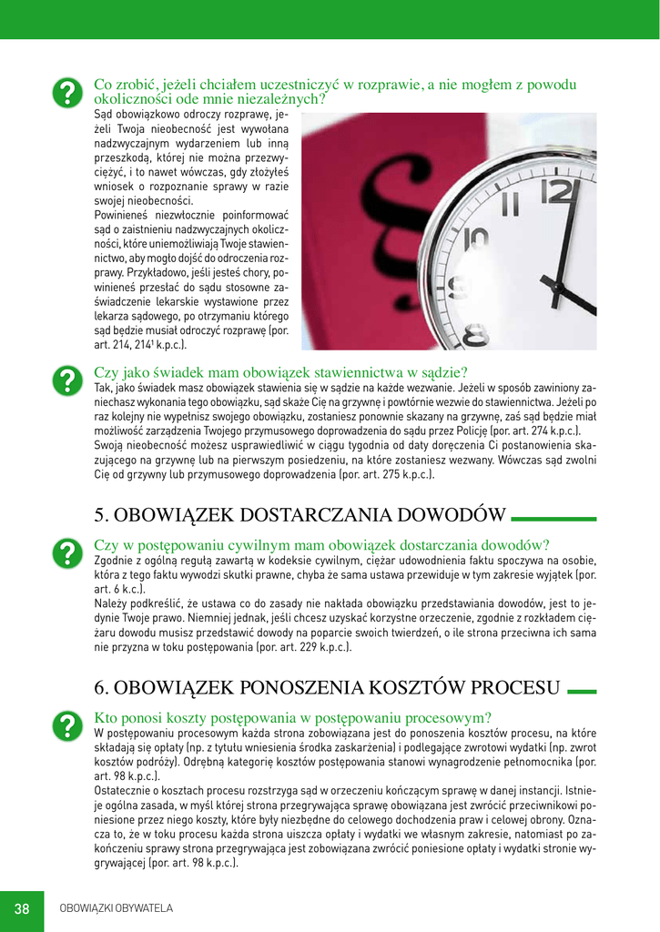 Co zrobić, jeżeli chciałem uczestniczyć w rozprawie, a nie mogłem z powodu okoliczności ode mnie niezależnych? Sąd obowiązkowo odroczy rozprawę, jeżeli Twoja nieobecność jest wywołana nadzwyczajnym wydarzeniem lub inną przeszkodą, której nie można przezwyciężyć, i to nawet wówczas, gdy złożyłeś wniosek o rozpoznanie sprawy w razie swojej nieobecności. Powinieneś niezwłocznie poinformować sąd o zaistnieniu nadzwyczajnych okoliczności, które uniemożliwiają Twoje stawiennictwo, aby mogło dojść do odroczenia rozprawy. Przykładowo, jeśli jesteś chory, powinieneś przesłać do sądu stosowne zaświadczenie lekarskie wystawione przez lekarza sądowego, po otrzymaniu którego sąd będzie musiał odroczyć rozprawę (por. art. 214, 214¹ k.p.c.). Czy jako świadek mam obowiązek stawiennictwa w sądzie? Tak, jako świadek masz obowiązek stawienia się w sądzie na każde wezwanie. Jeżeli w sposób zawiniony zaniechasz wykonania tego obowiązku, sąd skaże Cię na grzywnę i powtórnie wezwie do stawiennictwa. Jeżeli po raz kolejny nie wypełnisz swojego obowiązku, zostaniesz ponownie skazany na grzywnę, zaś sąd będzie miał możliwość zarządzenia Twojego przymusowego doprowadzenia do sądu przez Policję (por. art. 274 k.p.c.). Swoją nieobecność możesz usprawiedliwić w ciągu tygodnia od daty doręczenia Ci postanowienia skazującego na grzywnę lub na pierwszym posiedzeniu, na które zostaniesz wezwany. Wówczas sąd zwolni Cię od grzywny lub przymusowego doprowadzenia (por. art. 275 k.p.c.). 5. OBOWIĄZEK DOSTARCZANIA DOWODÓW Czy w postępowaniu cywilnym mam obowiązek dostarczania dowodów? Zgodnie z ogólną regułą zawartą w kodeksie cywilnym, ciężar udowodnienia faktu spoczywa na osobie, która z tego faktu wywodzi skutki prawne, chyba że sama ustawa przewiduje w tym zakresie wyjątek (por. art. 6 k.c.). Należy podkreślić, że ustawa co do zasady nie nakłada obowiązku przedstawiania dowodów, jest to jedynie Twoje prawo. Niemniej jednak, jeśli chcesz uzyskać korzystne orzeczenie, zgodnie z rozkładem ciężaru dowodu musisz przedstawić dowody na poparcie swoich twierdzeń, o ile strona przeciwna ich sama nie przyzna w toku postępowania (por. art. 229 k.p.c.). 6. OBOWIĄZEK PONOSZENIA KOSZTÓW PROCESU Kto ponosi koszty postępowania w postępowaniu procesowym? W postępowaniu procesowym każda strona zobowiązana jest do ponoszenia kosztów procesu, na które składają się opłaty (np. z tytułu wniesienia środka zaskarżenia) i podlegające zwrotowi wydatki (np. zwrot kosztów podróży). Odrębną kategorię kosztów postępowania stanowi wynagrodzenie pełnomocnika (por. art. 98 k.p.c.). Ostatecznie o kosztach procesu rozstrzyga sąd w orzeczeniu kończącym sprawę w danej instancji. Istnieje ogólna zasada, w myśl której strona przegrywająca sprawę obowiązana jest zwrócić przeciwnikowi poniesione przez niego koszty, które były niezbędne do celowego dochodzenia praw i celowej obrony. Oznacza to, że w toku procesu każda strona uiszcza opłaty i wydatki we własnym zakresie, natomiast po zakończeniu sprawy strona przegrywająca jest zobowiązana zwrócić poniesione opłaty i wydatki stronie wygrywającej (por. art. 98 k.p.c.). 38 OBOWIĄZKI OBYWATELA Od powyższej zasady istnieją liczne wyjątki, warto zatem wspomnieć o kilku najważniejszych. Po pierwsze, sąd przyzna pozwanemu zwrot kosztów postępowania od powoda mimo faktu przegrania sprawy, jeżeli nie dał powodu do wytoczenia sprawy (czyli jeżeli postawa pozwanego wskazywała na to, że powód uzyska zaspokojenie roszczenia bez skierowania sprawy do sądu) lub uznał przy pierwszej czynności procesowej żądanie pozwu (np. gdy pozwany oświadczył przed sądem, że powództwo jest zasadne lub zapłacił należność przed pierwszą rozprawą) (por. art. 101 k.p.c.). Po drugie, w wypadkach szczególnie uzasadnionych, wynikających np. z trudnej sytuacji życiowej, sąd może zasądzić od strony przegrywającej tylko część kosztów albo w ogóle jej nie obciążać kosztami (por. art. 102 k.p.c.). Po trzecie, jeżeli w toku postępowania doszło do zawarcia ugody, sąd zniesie wzajemnie koszty, czyli każda strona pozostanie przy kosztach poniesionych w związku ze swym udziałem w sprawie, chyba że strony inaczej postanowiły w ugodzie (por. art. 104 k.p.c.). Kto ponosi koszty postępowania w postępowaniu nieprocesowym? W postępowaniu nieprocesowym każdy uczestnik postępowania ponosi koszty związane z jego własnym udziałem w sprawie. Oznacza to, że każdy uczestnik ponosi koszty związane z poszczególnymi czynnościami, których dokonał oraz z czynnościami, których dokonał sąd w jego interesie. W przeciwieństwie do postępowania procesowego, co do zasady nie istnieje w postępowaniu nieprocesowym instytucja zwrotu kosztów postępowania między uczestnikami. Wyjątkowo, sąd może zobowiązać uczestnika postępowania do częściowego lub całkowitego zwrotu kosztów, w związku z różnym stopniem zainteresowania w rozstrzygnięciu sprawy przez poszczególnych uczestników lub ich sprzecznymi interesami (por. art. 520 k.p.c.). Co to jest opłata i ile wynosi? Opłacie w postępowaniu cywilnym podlegają pisma, od których ustawa przewiduje jej pobranie. W takim przypadku warunkiem skutecznego złożenia pisma procesowego jest uiszczenie przez stronę opłaty w odpowiedniej wysokości (por. art. 3 u.o.k.s.). Wyróżniamy trzy rodzaje opłat: 1. O płata stosunkowa – pobierana jest w sprawach o prawa majątkowe od pisma inicjującego postępowanie w danej instancji (np. pozew, apelacja); wynosi ona 5% wartości przedmiotu sporu lub przedmiotu zaskarżenia, przy czym minimum 30 zł, a maksimum 100 000 zł; końcówkę opłaty zaokrągla się w górę do pełnego złotego (por. art. 13 u.o.k.s.). J eżeli w chwili wszczęcia sprawy nie jest możliwe ustalenie wartości przedmiotu sporu, a tym samym wysokości opłaty s