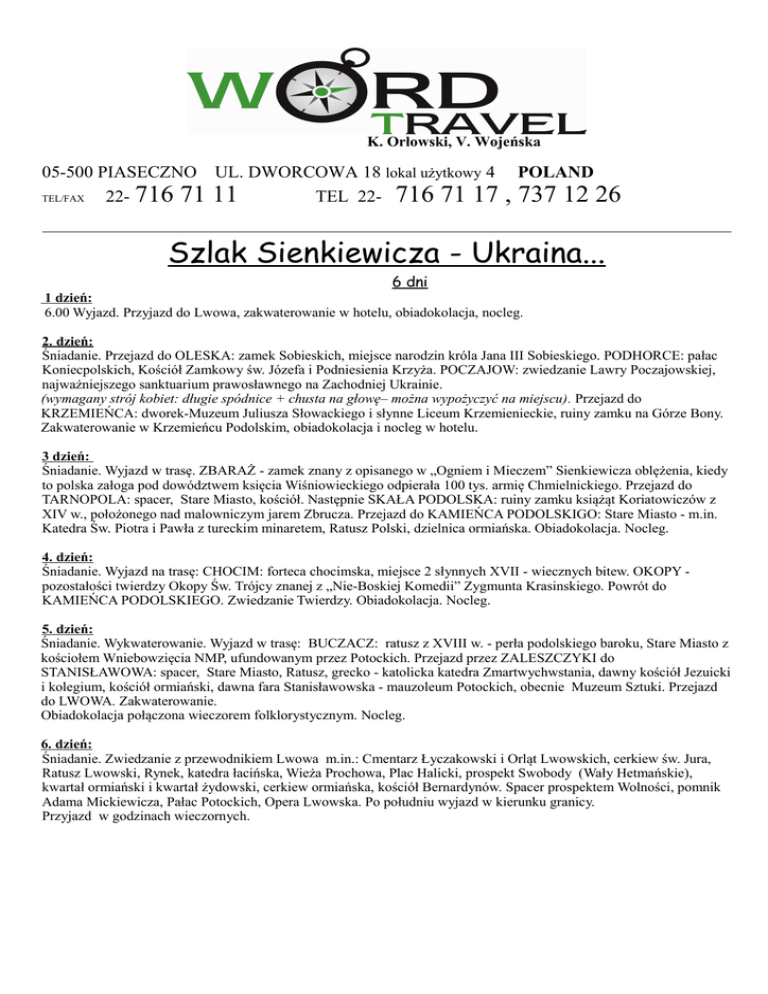 K. Orłowski, V. Wojeńska 05-500 PIASECZNO UL. DWORCOWA 18 lokal użytkowy 4 TEL/FAX 22- 716 71 11 TEL 22- 716 71 17 POLAND , 737 12 26 Szlak Sienkiewicza - Ukraina... 6 dni 1 dzień: 6.00 Wyjazd. Przyjazd do Lwowa, zakwaterowanie w hotelu, obiadokolacja, nocleg. 2. dzień: Śniadanie. Przejazd do OLESKA: zamek Sobieskich, miejsce narodzin króla Jana III Sobieskiego. PODHORCE: pałac Koniecpolskich, Kościół Zamkowy św. Józefa i Podniesienia Krzyża. POCZAJOW: zwiedzanie Lawry Poczajowskiej, najważniejszego sanktuarium prawosławnego na Zachodniej Ukrainie. (wymagany strój kobiet: długie spódnice + chusta na głowę– można wypożyczyć na miejscu). Przejazd do KRZEMIEŃCA: dworek-Muzeum Juliusza Słowackiego i słynne Liceum Krzemienieckie, ruiny zamku na Górze Bony. Zakwaterowanie w Krzemieńcu Podolskim, obiadokolacja i nocleg w hotelu. 3 dzień: Śniadanie. Wyjazd w trasę. ZBARAŻ - zamek znany z opisanego w „Ogniem i Mieczem” Sienkiewicza oblężenia, kiedy to polska załoga pod dowództwem księcia Wiśniowieckiego odpierała 100 tys. armię Chmielnickiego. Przejazd do TARNOPOLA: spacer, Stare Miasto, kościół. Następnie SKAŁA PODOLSKA: ruiny zamku książąt Koriatowiczów z XIV w., położonego nad malowniczym jarem Zbrucza. Przejazd do KAMIEŃCA PODOLSKIGO: Stare Miasto - m.in. Katedra Św. Piotra i Pawła z tureckim minaretem, Ratusz Polski, dzielnica ormiańska. Obiadokolacja. Nocleg. 4. dzień: Śniadanie. Wyjazd na trasę: CHOCIM: forteca chocimska, miejsce 2 słynnych XVII - wiecznych bitew. OKOPY pozostałości twierdzy Okopy Św. Trójcy znanej z „Nie-Boskiej Komedii” Zygmunta Krasinskiego. Powrót do KAMIEŃCA PODOLSKIEGO. Zwiedzanie Twierdzy. Obiadokolacja. Nocleg. 5. dzień: Śniadanie. Wykwaterowanie. Wyjazd w trasę: BUCZACZ: ratusz z XVIII w. - perła podolskiego baroku, Stare Miasto z kościołem Wniebowzięcia NMP, ufundowanym przez Potockich. Przejazd przez ZALESZCZYKI do STANISŁAWOWA: spacer, Stare Miasto, Ratusz, grecko - katolicka katedra Zmartwychwstania, dawny kościół Jezuicki i kolegium, kościół ormiański, dawna fara Stanisławowska - mauzoleum Potockich, obecnie Muzeum Sztuki. Przejazd do LWOWA. Zakwaterowanie. Obiadokolacja połączona wieczorem folklorystycznym. Nocleg. 6. dzień: Śniadanie. Zwiedzanie z przewodnikiem Lwowa m.in.: Cmentarz Łyczakowski i Orląt Lwowskich, cerkiew św. Jura, Ratusz Lwowski, Rynek, katedra łacińska, Wieża Prochowa, Plac Halicki, prospekt Swobody (Wały Hetmańskie), kwartał ormiański i kwartał żydowski, cerkiew ormiańska, kościół Bernardynów. Spacer prospektem Wolności, pomnik Adama Mickiewicza, Pałac Potockich, Opera Lwowska. Po południu wyjazd w kierunku granicy. Przyjazd w godzinach wieczornych. Świadczenia: - transport lux autokarem marki, np. Mercedes, Volvo, Scania, MAN, Neoplan z WC, DVD, barkiem, uchylnymi siedzeniami - zakwaterowanie w hotelu, pensjonacie we Lwowie lub okolicach , pokoje z łazienkami lub studio - wyżywienie zg. z programem, - realizacja programu turystycznego, - opieka pilota, - ubezpieczenie KL 10 000 euro, NW - VAT, - grupy 30 os - 2 miejsca gratis dla nauczycieli, od 30 do 45 os – 3 miejsca gratis dla nauczycieli. Cena: 800 zł /min. 40 os. płacących +dodatkowo bilety wstępu ok. 20 euro + wieczór folklorystyczny (występ np. “Lwowskiej Fali” lub kabaretu “Leopolis”) – ok. 10 euro W celu podpisania umowy i rezerwacji konkretnego terminu prosimy o telefon do biura 022 716 71 11 lub 022 716 71 17 lub mail [email protected] Zaliczka konieczna do podpisania umowy: 200 zł/os Ze względu na szczyt sezonu wycieczek szkolnych w miesiącach maj-czerwiec sugerujemy dokonanie rez. wstępnej. Termin, który Państwa interesuje, potwierdzamy po sprawdzeniu dostępności wolnych miejsc w hotelu. Dokonujemy rezerwacji wstępnej na czas zebrania zaliczek przez nauczyciela (najczęściej nie dłużej niż 4 tyg.)
