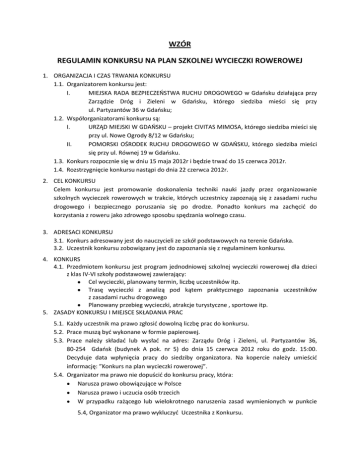 WZÓR REGULAMIN KONKURSU NA PLAN SZKOLNEJ WYCIECZKI ROWEROWEJ 1. ORGANIZACJA I CZAS TRWANIA KONKURSU 1.1. Organizatorem konkursu jest: I. MIEJSKA RADA BEZPIECZEOSTWA RUCHU DROGOWEGO w Gdaosku działająca przy Zarządzie Dróg i Zieleni w Gdaosku, którego siedziba mieści się przy ul. Partyzantów 36 w Gdaosku; 1.2. Współorganizatorami konkursu są: I. URZĄD MIEJSKI W GDAOSKU – projekt CIVITAS MIMOSA, którego siedziba mieści się przy ul. Nowe Ogrody 8/12 w Gdaosku; II. POMORSKI OŚRODEK RUCHU DROGOWEGO W GDAOSKU, którego siedziba mieści się przy ul. Równej 19 w Gdaosku. 1.3. Konkurs rozpocznie się w dniu 15 maja 2012r i będzie trwad do 15 czerwca 2012r. 1.4. Rozstrzygnięcie konkursu nastąpi do dnia 22 czerwca 2012r. 2. CEL KONKURSU Celem konkursu jest promowanie doskonalenia techniki nauki jazdy przez organizowanie szkolnych wycieczek rowerowych w trakcie, których uczestnicy zapoznają się z zasadami ruchu drogowego i bezpiecznego poruszania się po drodze. Ponadto konkurs ma zachęcid do korzystania z roweru jako zdrowego sposobu spędzania wolnego czasu. 3. ADRESACI KONKURSU 3.1. Konkurs adresowany jest do nauczycieli ze szkół podstawowych na terenie Gdaoska. 3.2. Uczestnik konkursu zobowiązany jest do zapoznania się z regulaminem konkursu. 4. KONKURS 4.1. Przedmiotem konkursu jest program jednodniowej szkolnej wycieczki rowerowej dla dzieci z klas IV-VI szkoły podstawowej zawierający: Cel wycieczki, planowany termin, liczbę uczestników itp. Trasę wycieczki z analizą pod kątem praktycznego zapoznania uczestników z zasadami ruchu drogowego Planowany przebieg wycieczki, atrakcje turystyczne , sportowe itp. 5. ZASADY KONKURSU I MIEJSCE SKŁADANIA PRAC 5.1. Każdy uczestnik ma prawo zgłosid dowolną liczbę prac do konkursu. 5.2. Prace muszą byd wykonane w formie papierowej. 5.3. Prace należy składad lub wysład na adres: Zarządu Dróg i Zieleni, ul. Partyzantów 36, 80-254 Gdaosk (budynek A pok. nr 5) do dnia 15 czerwca 2012 roku do godz. 15:00. Decyduje data wpłynięcia pracy do siedziby organizatora. Na kopercie należy umieścid informację: ”Konkurs na plan wycieczki rowerowej”. 5.4. Organizator ma prawo nie dopuścid do konkursu pracy, która: Narusza prawo obowiązujące w Polsce Narusza prawo i uczucia osób trzecich W przypadku rażącego lub wielokrotnego naruszenia zasad wymienionych w punkcie 5.4, Organizator ma prawo wykluczyd Uczestnika z Konkursu. 6. ROZSTRZYGNIĘCIE KONKURSU I NAGRODY 6.1. Ocena dostarczonych prac będzie dokonywana przez Jury powołane przez Organizatora. 6.2. Jury biorąc pod uwagę wartośd merytoryczną, edukacyjną oraz atrakcyjnośd i urozmaicenie planów wycieczek przyzna nagrody indywidualne dla nauczycieli oraz dla reprezentujących je szkół za: a) 1 miejsce w konkursie b) 2 miejsce w konkursie c) 3 miejsce w konkursie 6.3. Nagrodami w konkursie dla nauczycieli są: Aparat fotograficzny Olympus PEN mini z kartą pamięci 8 Gb oraz pokrowcem i statywem za 1 miejsce w konkursie; 2 aparaty Canon IXUS 220 HS z kartą pamięci 4 Gb oraz pokrowcem za 2 i 3 miejsce w konkursie. 6.4. Organizator ustala dodatkową nagrodę pieniężną dla nauczycieli na pokrycie kosztów podatku dochodowego w wysokości: 227 zł za 1 miejsce w konkursie; Po 79 zł za 2 i 3 miejsce w konkursie. 6.5. Nagrodami w konkursie dla szkół reprezentowanych przez nagrodzonych nauczycieli są: Zestawy szkolnych znaków drogowych – zestaw 32-elementowy; Zestawy pomocy dydaktycznych ”Budujemy znaki drogowe”; Zestaw pomocy dydaktycznych „Uczeo w ruchu drogowym”; Wyposażenie ochronne dla 10-cio osobowych grup rowerzystów (kaski i ochraniacze). 6.6. W przypadku realizacji zgłoszonego do konkursu planu wycieczki, wszyscy uczestnicy zostaną objęci szkoleniem prowadzonym przez ekspertów z Pomorskiego Ośrodka Ruchu Drogowego w Gdaosku. 6.7. Nagrody w konkursie nie można zamienid na inną nagrodę ani na ekwiwalent pieniężny. Organizator nie ponosi odpowiedzialności z tytułu rękojmi za wady nagrody ani nie udziela gwarancji jej jakości. Wszelkie reklamacje dotyczące nagrody należy zgłaszad do jej producenta lub sprzedawcy. 6.8. Zwycięzcy konkursu nie mogą przenieśd prawa do otrzymania nagrody na osoby trzecie. 7. OGŁOSZENIE WYNIKÓW I WYDANIE NAGRÓD 7.1. Rozstrzygnięcie Konkursu zostanie opublikowane na stronie internetowej Konkursu www.zdiz.gda.pl w dniu 22 czerwca 2012r. 7.2. Niezależnie od powyższego, zwycięzcy konkursu zostaną w dniu rozstrzygnięcia Konkursu powiadomieni listownie przez Organizatora o przyznaniu im nagród. 7.3. Nagrody zostaną przekazane osobiście w Zarządzie Dróg i Zieleni w Gdaosku mieszczącym się przy ul. Partyzantów 36 Gdaosku. 7.4. W przypadku braku możliwości skontaktowania się ze zwycięzcą nagroda przepada. 7.5. Podanie nieprawdziwych lub niekompletnych danych będą przyczyną odmowy wydania uczestnikowi nagrody w przypadku wygranej. 7.6. Organizator nie ponosi odpowiedzialności za niemożnośd ani utrudnienia odbioru nagrody z przyczyn leżących po stronie Uczestnika nagrodzonego w Konkursie. 7.7. Podatek od nagród zostanie pokryty przez Organizatora. 7.8. Przystępując do Konkursu uczestnicy wyrażają zgodę na przeprowadzenie Konkursu zgodnie z niniejszym regulaminem. 8. PRAWA AUTORSKIE 8.1. Uczestnik wyraża zgodę na publikacje prac konkursowych na stronach internetowych organizatora i współorganizatorów oraz udostępnianie ich zainteresowanym podmiotom. 8.2. Uczestnik musi wyrazid pisemną zgodę na przetwarzanie swoich danych osobowych w celach konkursu oraz wypełnid oświadczenie stanowiące załącznik nr 1 do niniejszego Regulaminu. 9. POSTANOWIENIA KOOCOWE 9.1.1. Regulamin znajduje się na stronie internetowej www.zdiz.gda.pl. 9.1.2. Wszystkie pytania i uwagi można kierowad na adres e-mail: [email protected]. 9.1.3. Złamanie ustaleo regulaminu Konkursu przez Uczestnika będzie oznaczało jego wykluczenie z uczestnictwa w konkursie. 9.1.4. W sprawach