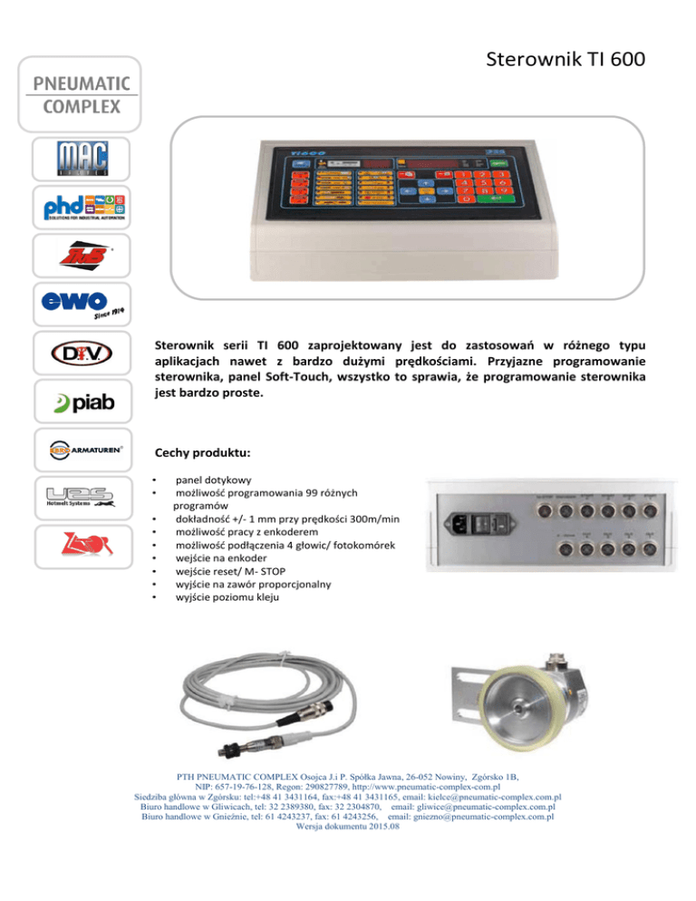 Sterownik TI 600 Sterownik serii TI 600 zaprojektowany jest do zastosowań w różnego typu aplikacjach nawet z bardzo dużymi prędkościami. Przyjazne programowanie sterownika, panel Soft-Touch, wszystko to sprawia, że programowanie sterownika jest bardzo proste. Cechy produktu: • • • • • • • • • panel dotykowy możliwość programowania 99 różnych programów dokładność +/- 1 mm przy prędkości 300m/min możliwość pracy z enkoderem możliwość podłączenia 4 głowic/ fotokomórek wejście na enkoder wejście reset/ M- STOP wyjście na zawór proporcjonalny wyjście poziomu kleju PTH PNEUMATIC COMPLEX Osojca J.i P. Spółka Jawna, 26-052 Nowiny, Zgórsko 1B, NIP: 657-19-76-128, Regon: 290827789, http://www.pneumatic-complex-com.pl Siedziba główna w Zgórsku: tel:+48 41 3431164, fax:+48 41 3431165, email: [email protected] Biuro handlowe w Gliwicach, tel: 32 2389380, fax: 32 2304870, email: [email protected] Biuro handlowe w Gnieźnie, tel: 61 4243237, fax: 61 4243256, email: [email protected] Wersja dokumentu 2015.08