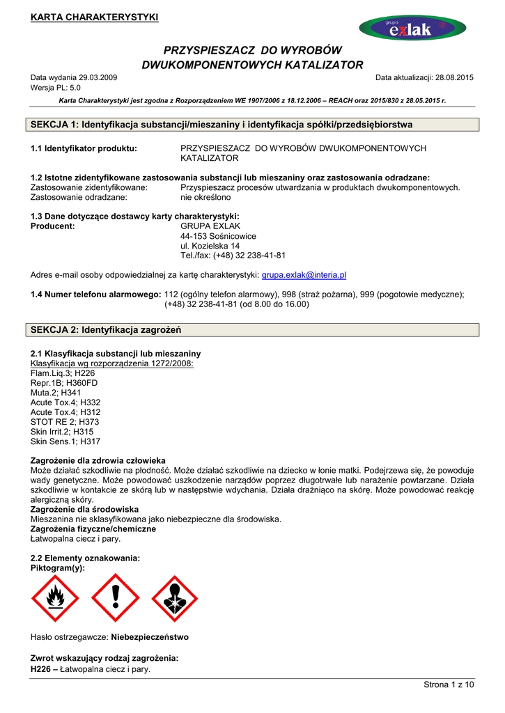 KARTA CHARAKTERYSTYKI PRZYSPIESZACZ DO WYROBÓW DWUKOMPONENTOWYCH KATALIZATOR Data wydania 29.03.2009 Wersja PL: 5.0 Data aktualizacji: 28.08.2015 Karta Charakterystyki jest zgodna z Rozporządzeniem WE 1907/2006 z 18.12.2006 – REACH oraz 2015/830 z 28.05.2015 r. SEKCJA 1: Identyfikacja substancji/mieszaniny i identyfikacja spółki/przedsiębiorstwa 1.1 Identyfikator produktu: PRZYSPIESZACZ DO WYROBÓW DWUKOMPONENTOWYCH KATALIZATOR 1.2 Istotne zidentyfikowane zastosowania substancji lub mieszaniny oraz zastosowania odradzane: Zastosowanie zidentyfikowane: Przyspieszacz procesów utwardzania w produktach dwukomponentowych. Zastosowanie odradzane: nie określono 1.3 Dane dotyczące dostawcy karty charakterystyki: Producent: GRUPA EXLAK 44-153 Sośnicowice ul. Kozielska 14 Tel./fax: (+48) 32 238-41-81 Adres e-mail osoby odpowiedzialnej za kartę charakterystyki: [email protected] 1.4 Numer telefonu alarmowego: 112 (ogólny telefon alarmowy), 998 (straż pożarna), 999 (pogotowie medyczne); (+48) 32 238-41-81 (od 8.00 do 16.00) SEKCJA 2: Identyfikacja zagrożeń 2.1 Klasyfikacja substancji lub mieszaniny Klasyfikacja wg rozporządzenia 1272/2008: Flam.Liq.3; H226 Repr.1B; H360FD Muta.2; H341 Acute Tox.4; H332 Acute Tox.4; H312 STOT RE 2; H373 Skin Irrit.2; H315 Skin Sens.1; H317 Zagrożenie dla zdrowia człowieka Może działać szkodliwie na płodność. Może działać szkodliwie na dziecko w łonie matki. Podejrzewa się, że powoduje wady genetyczne. Może powodować uszkodzenie narządów poprzez długotrwałe lub narażenie powtarzane. Działa szkodliwie w kontakcie ze skórą lub w następstwie wdychania. Działa drażniąco na skórę. Może powodować reakcję alergiczną skóry. Zagrożenie dla środowiska Mieszanina nie sklasyfikowana jako niebezpieczne dla środowiska. Zagrożenia fizyczne/chemiczne Łatwopalna ciecz i pary. 2.2 Elementy oznakowania: Piktogram(y): Hasło ostrzegawcze: Niebezpieczeństwo Zwrot wskazujący rodzaj zagrożenia: H226 – Łatwopalna ciecz i pary. Strona 1 z 10 KARTA CHARAKTERYSTYKI PRZYSPIESZACZ DO WYROBÓW DWUKOMPONENTOWYCH KATALIZATOR Data wydania 29.03.2009 Wersja PL: 5.0 Data aktualizacji: 28.08.2015 Karta Charakterystyki jest zgodna z Rozporządzeniem WE 1907/2006 z 18.12.2006 – REACH oraz 2015/830 z 28.05.2015 r. H312 – Działa szkodliwie w kontakcie ze skórą. H315 – Działa drażniąco na skórę. H317 – Może powodować reakcję alergiczną skóry. H332 – Działa szkodliwie w następstwie wdychania. H341 – Podejrzewa się, że powoduje wady genetyczne. H360FD – Może działać szkodliwie na płodność. Może działać szkodliwie na dziecko w łonie matki. H373 – Może powodować uszkodzenie narządów poprzez długotrwałe lub narażenie powtarzane. Zwroty określające środki bezpieczeństwa: P201 – Przed użyciem zapoznać się ze specjalnymi środkami ostrożności. P210 – Przechowywać z dala od źródeł ciepła, gorących powierzchni, źródeł iskrzenia, otwartego ognia i innych źródeł zapłonu. Nie palić. P261 – Unikać wdychania pyłu/dymu/gazu/mgły/par/rozpylonej cieczy. P271 – Stosować wyłącznie na zewnątrz lub w dobrze wentylowanym pomieszczeniu. P280 – Stosować rękawice ochronne/odzież ochronną/ochronę oczu/ochronę twarzy. P314 – W przypadku złego samopoczucia zasięgnąć porady/zgłosić się pod opiekę lekarza. P302 + P352 – W PRZYPADKU KONTAKTU ZE SKÓRĄ: umyć dużą ilością wody z mydłem. P304 + P340 – W PRZYPADKU DOSTANIA SIĘ DO DRÓG ODDECHOWYCH: wyprowadzić lub wynieść poszkodowanego na świeże powietrze i zapewnić mu warunki do swobodnego oddychania. P308 + P313 – W przypadku narażenia lub styczności: Zasięgnąć porady/zgłosić się pod opiekę lekarza. P333 + P313 – W przypadku wystąpienia podrażnienia skóry lub wysypki: Zasięgnąć porady/zgłosić się pod opiekę lekarza. Zawiera: ksylen (CAS 1330-20-7), dilaurynian dibutylocyny (CAS 77-58-7). 2.3 Inne zagrożenia: Brak innych zagrożeń. Brak informacji na temat spełnienia kryteriów PBT lub vPvB zgodnie z załącznikiem XIII rozporządzenia REACH. Odpowiednie badania nie były przeprowadzone. SEKCJA 3: Skład/informacja o składnikach 3.1 Substancje: Nie dotyczy. 3.2 Mieszaniny: Niebezpieczne składniki: Identyfikator produktu Ksylen CAS: 1330-20-7 WE: 215-535-7 Nr indeksowy: 601-022-00-9 Nr REACH: 01-2119488216-32-XXXX Dilaurynian dibutylocyny CAS: 77-58-7 WE: 201-039-8 Nr indeksowy: Nr REACH: 01-2119496068-27-XXXX Zawartość % 80 - 99 <1,5 Klasyfikacja CLP Kody zwrotów Klasa zagrożenia i wskazujących rodzaj kody kategorii zagrożenia Flam. Liq. 3 Acute Tox. 4 Skin Irrit. 2 H226 H312 H332 H315 STOT RE 1 Repr. 1B Muta. 2 Skin Corr.1B Skin Sens. 1 Aquatic Acute 1 Aquatic Chronic 1 H372 H360 H341 H314 H317 H400 H410 Pełna treść zwrotów H w sekcji 16 Strona 2 z 10 KARTA CHARAKTERYSTYKI PRZYSPIESZACZ DO WYROBÓW DWUKOMPONENTOWYCH KATALIZATOR Data wydania 29.03.2009 Wersja PL: 5.0 Data aktualizacji: 28.08.2015 Karta Charakterystyki jest zgodna z Rozporządzeniem WE 1907/2006 z 18.12.2006 – REACH oraz 2015/830 z 28.05.2015 r. SEKCJA 4: Środki pierwszej pomocy 4.1 Opis środków pierwszej pomocy W przypadku kontaktu ze skórą: Umyć zabrudzoną skórę wodą z mydłem, spłukać dokładnie wodą, w przypadku pojawienia się podrażnienia, rumieni skontaktować się z lekarzem. W przypadku kontaktu z oczami: Przepłukać oczy przez kilkanaście minut (ok. 15) dużą ilością wody, trzymając powieki szeroko rozwarte. Unikać silnego strumienia, ze względu na niebezpieczeństwo uszkodzenia rogówki, skontaktować się z lekarzem. Narażenie inhalacyjne: Wynieść poszkodowanego z miejsca narażenia, ułożyć w wygodnej pozycji półleżącej lub siedzącej, zapewnić spokój, chronić przed utratą ciepła. Jeżeli wystąpią zaburzenia oddychania, zastosować sztuczne oddychanie. Jeżeli objawy nie ustępują, wezwać lekarza. W przypadku połknięcia: Nie wywoływać wymiotów, 